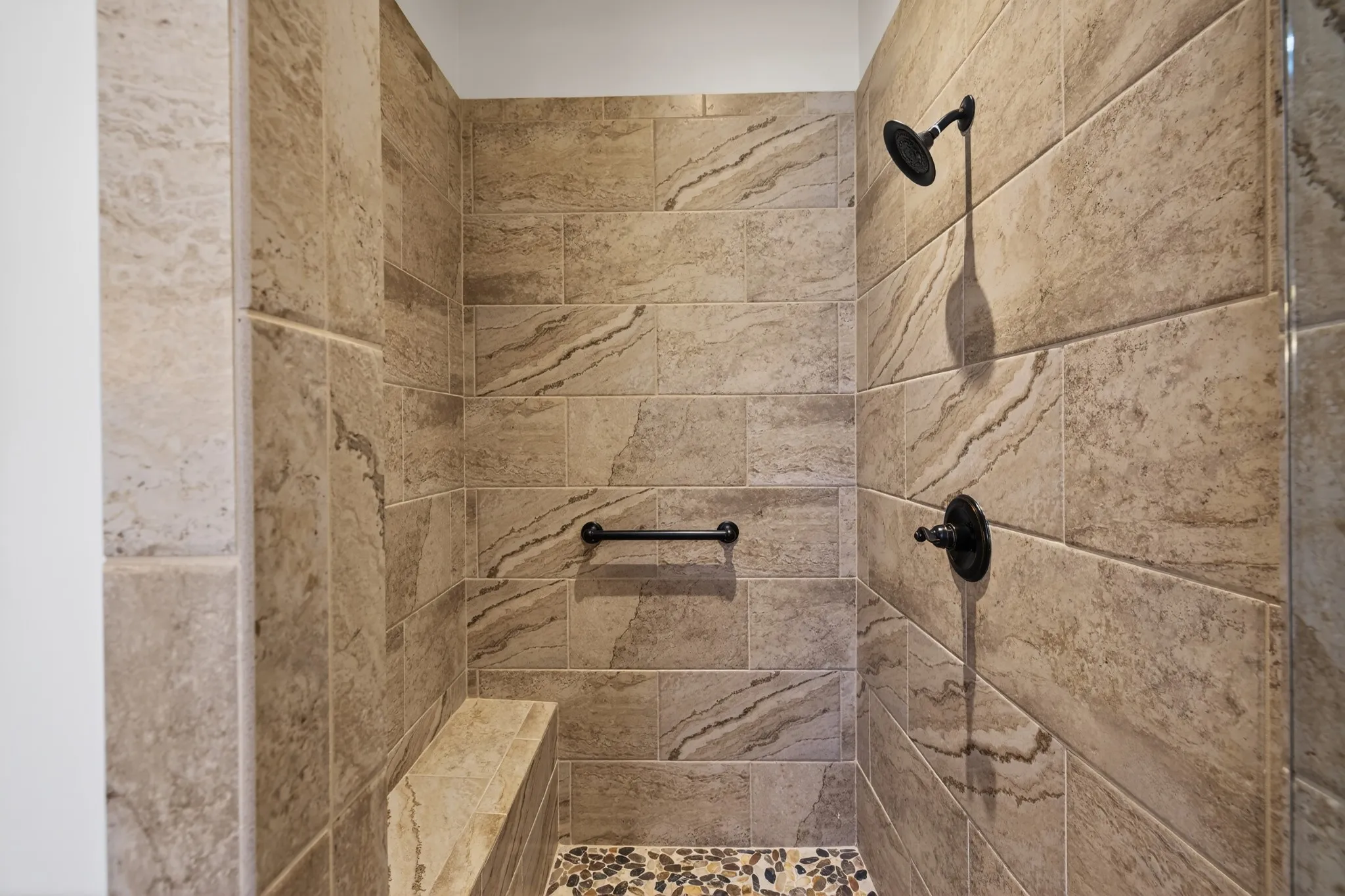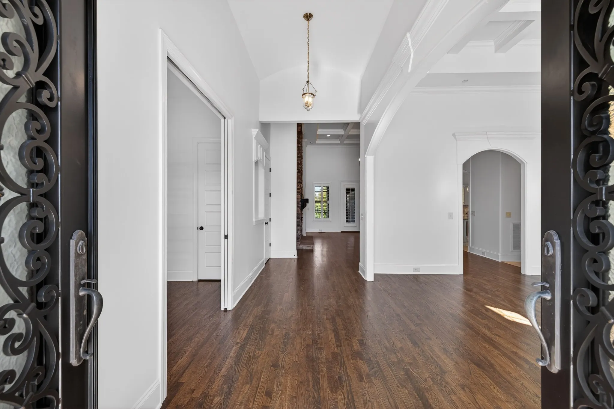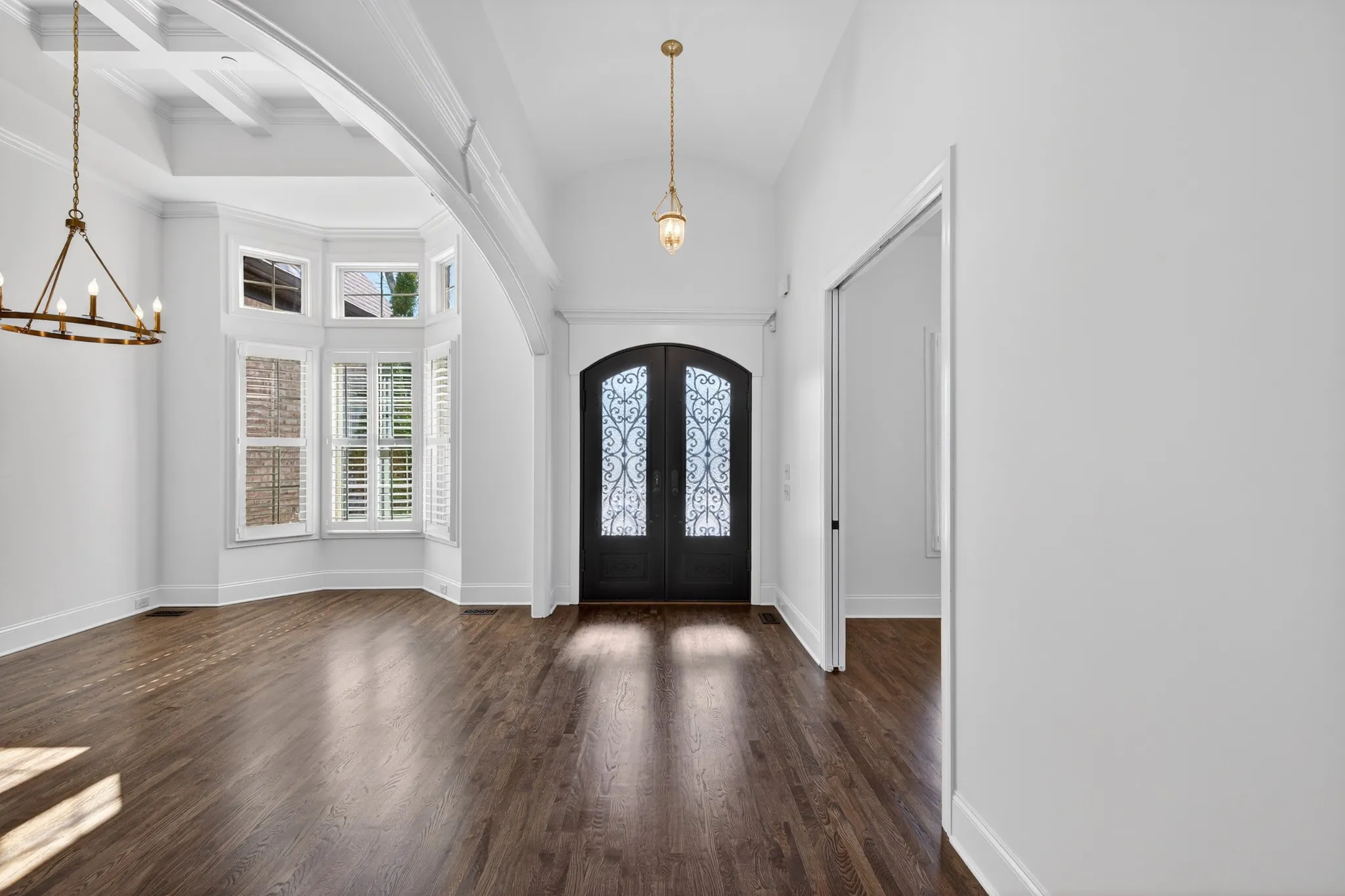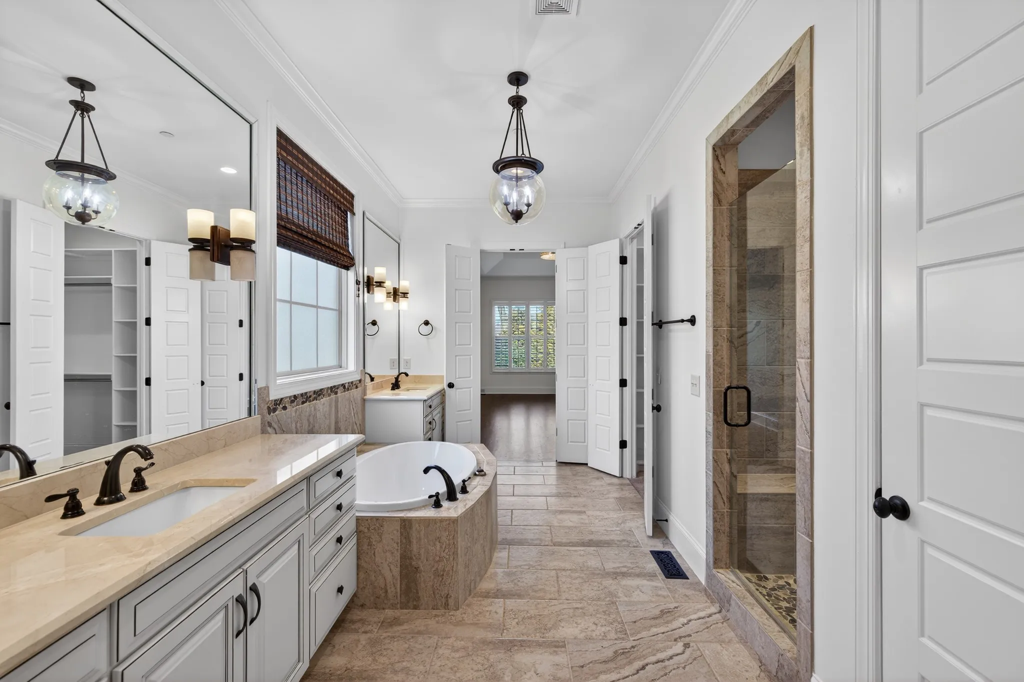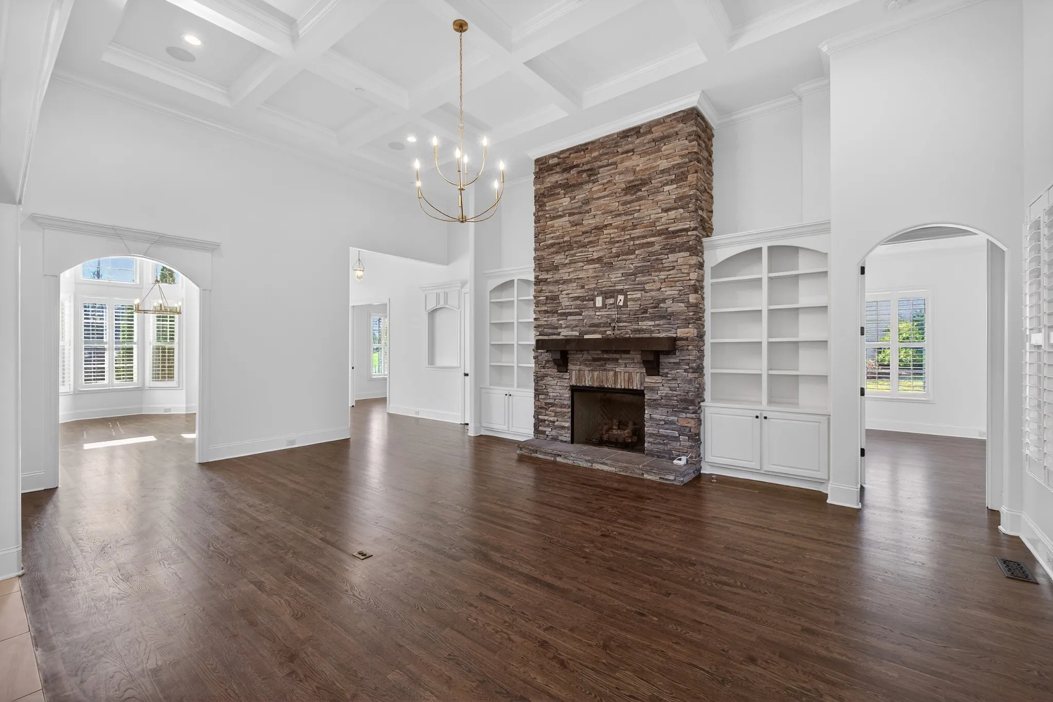 The main level is designed for both everyday comfort and impressive entertaining with iron double front doors, two bedrooms on the main level, a private study with French doors, formal dining with coffered ceiling, and a well-appointed kitchen featuring a large island, double ovens, built-in gas range, and breakfast nook. The Great Room stuns with a soaring coffered ceiling, built-in speakers, stacked stone fireplace to the ceiling, and built-in bookcases. Plantation shutters add a polished finish throughout.