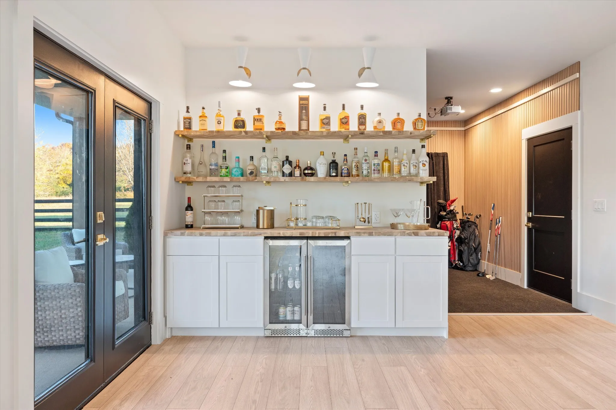 A separate entertainment building offers a 4 car garage and upper-level recreation room with theater surround sound. The lower level of this structure features SkyTrak golf simulator and dry bar opening to a covered patio. County variance allows breezeway connection to main house and allowing bathrooms on existing septic.