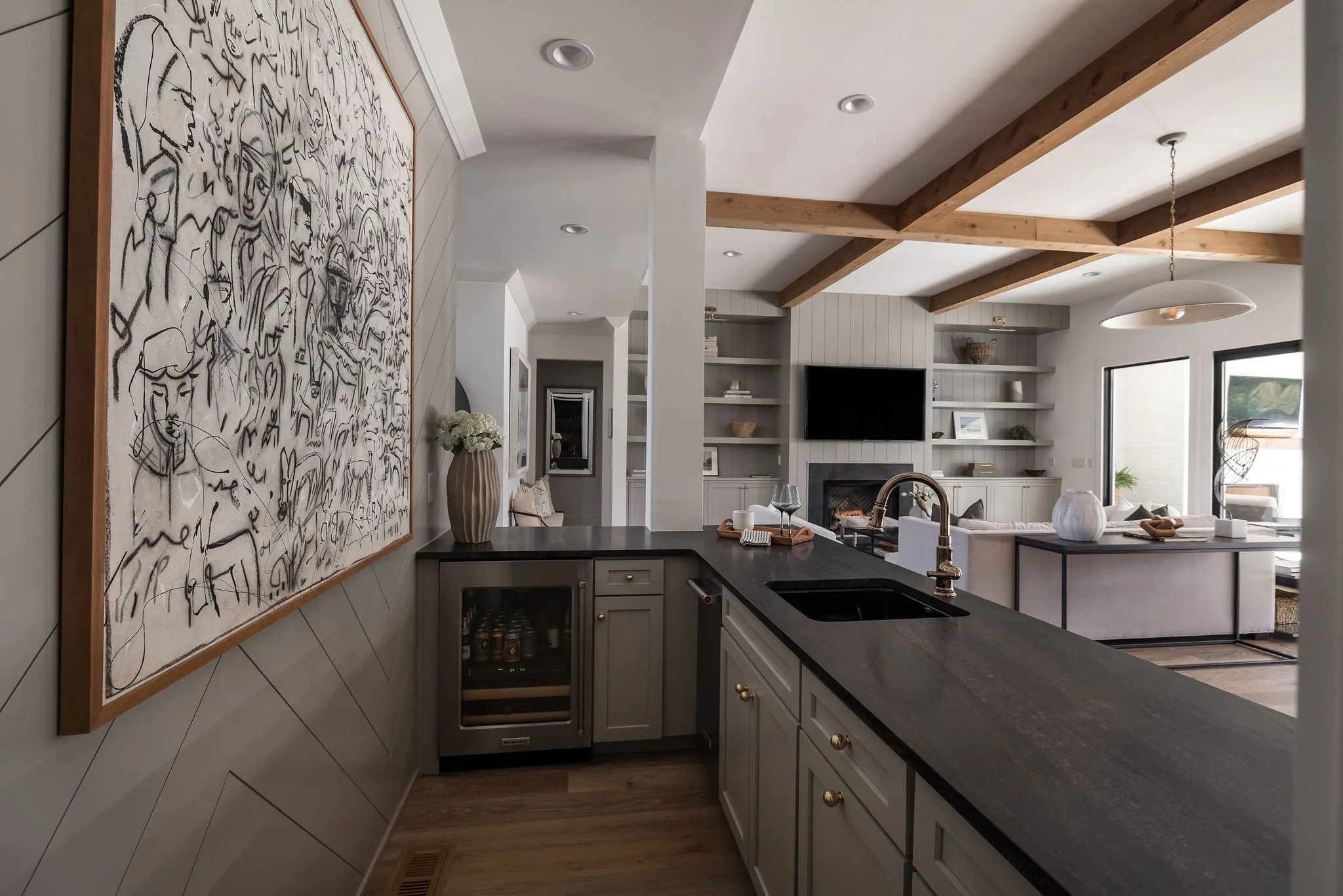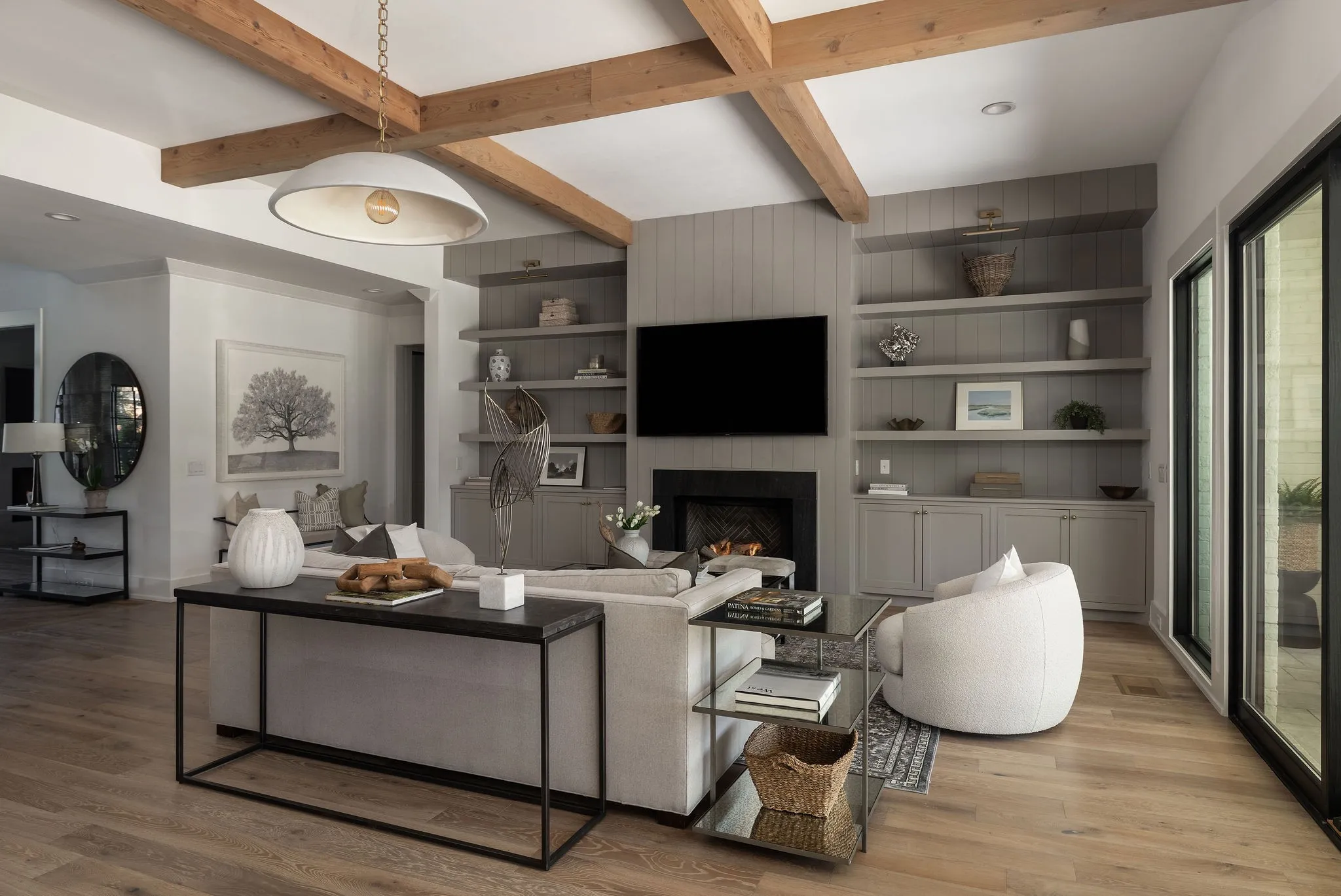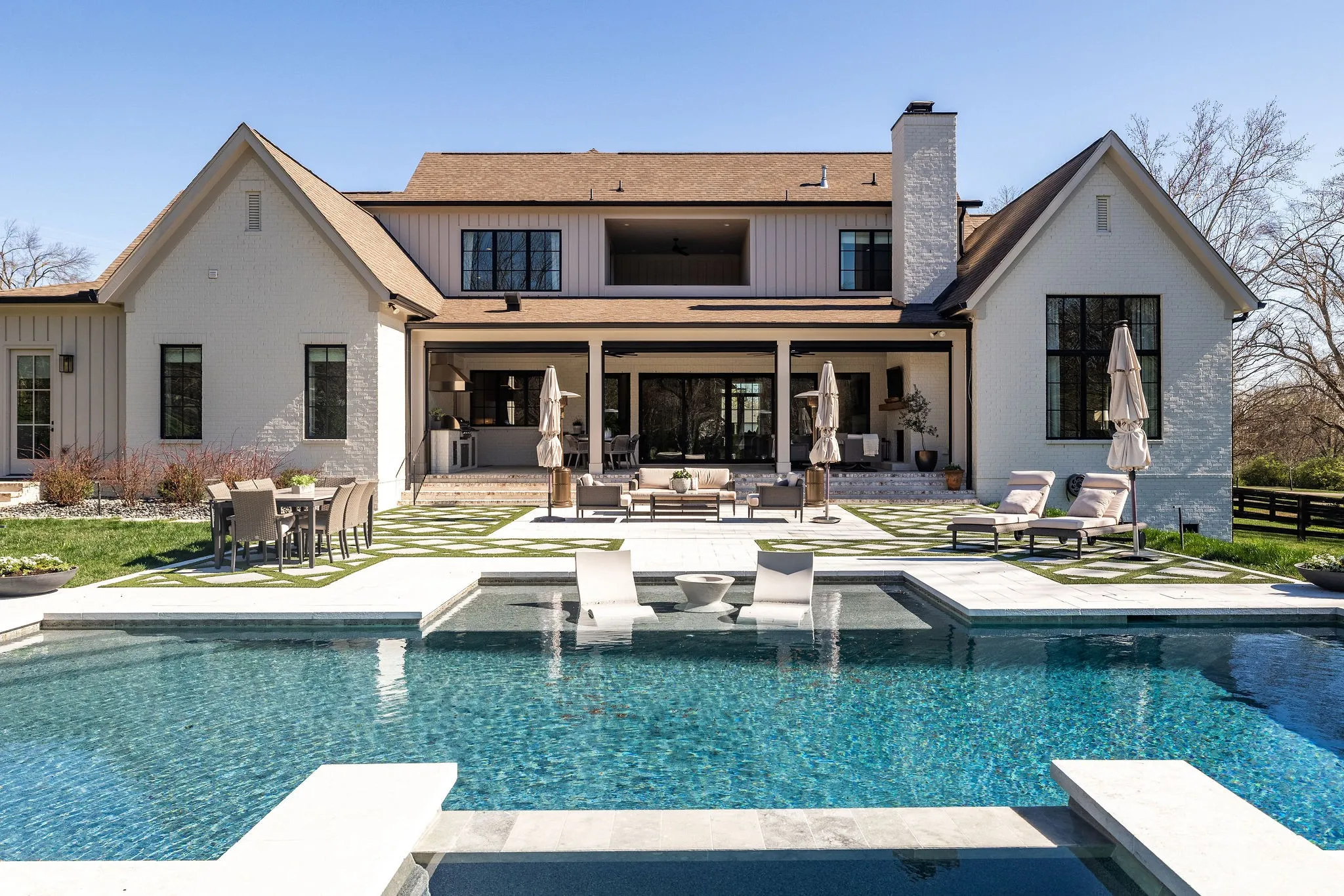 with a gunite pool, elevated spa, waterfall, and expansive outdoor living space complete with motorized screens, a built-in grill, dining,and lounge areas. Inside, a dramatic two-story entry is flanked by a home office with a fireplace and on the other side a dining room with floor to ceiling windows. The main living room is spacious, featuring a gas fireplace, built-ins, and seamless views of the backyard. The kitchen includes a large island, paneled appliances, inset cabinets, a bar area with beverage fridge and ice maker, and a pantry with an