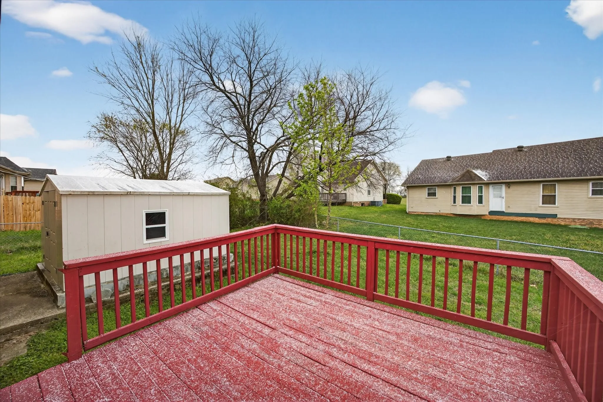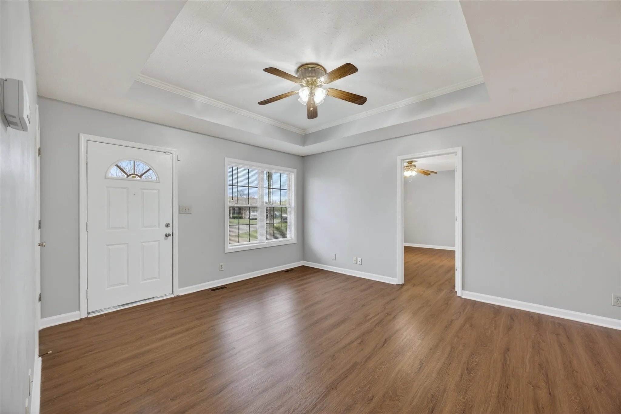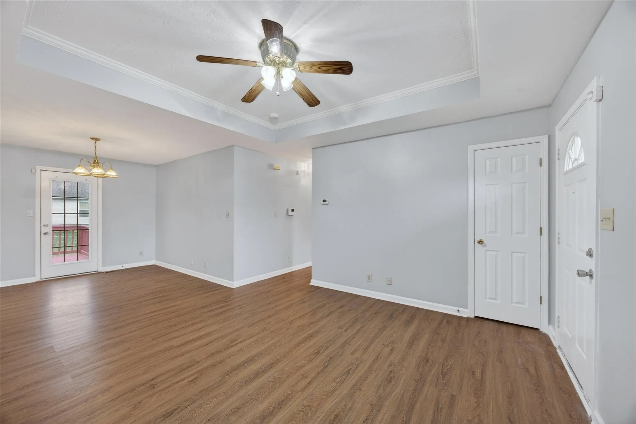 Charming and move-in ready home featuring an open living and dining area with neutral paint throughout. The spacious living room offers great natural light and a tray ceiling with ceiling fan, creating a comfortable and inviting space. The kitchen includes ample cabinet storage, solid surface countertops, and a functional layout with easy access to the dining area and back deck—perfect for everyday living or entertaining. The primary bedroom is generously sized with great closet space and convenient access to the bathroom. Step outside to enjoy the backyard with a deck ideal for relaxing or hosting, along with plenty of space for outdoor activities.