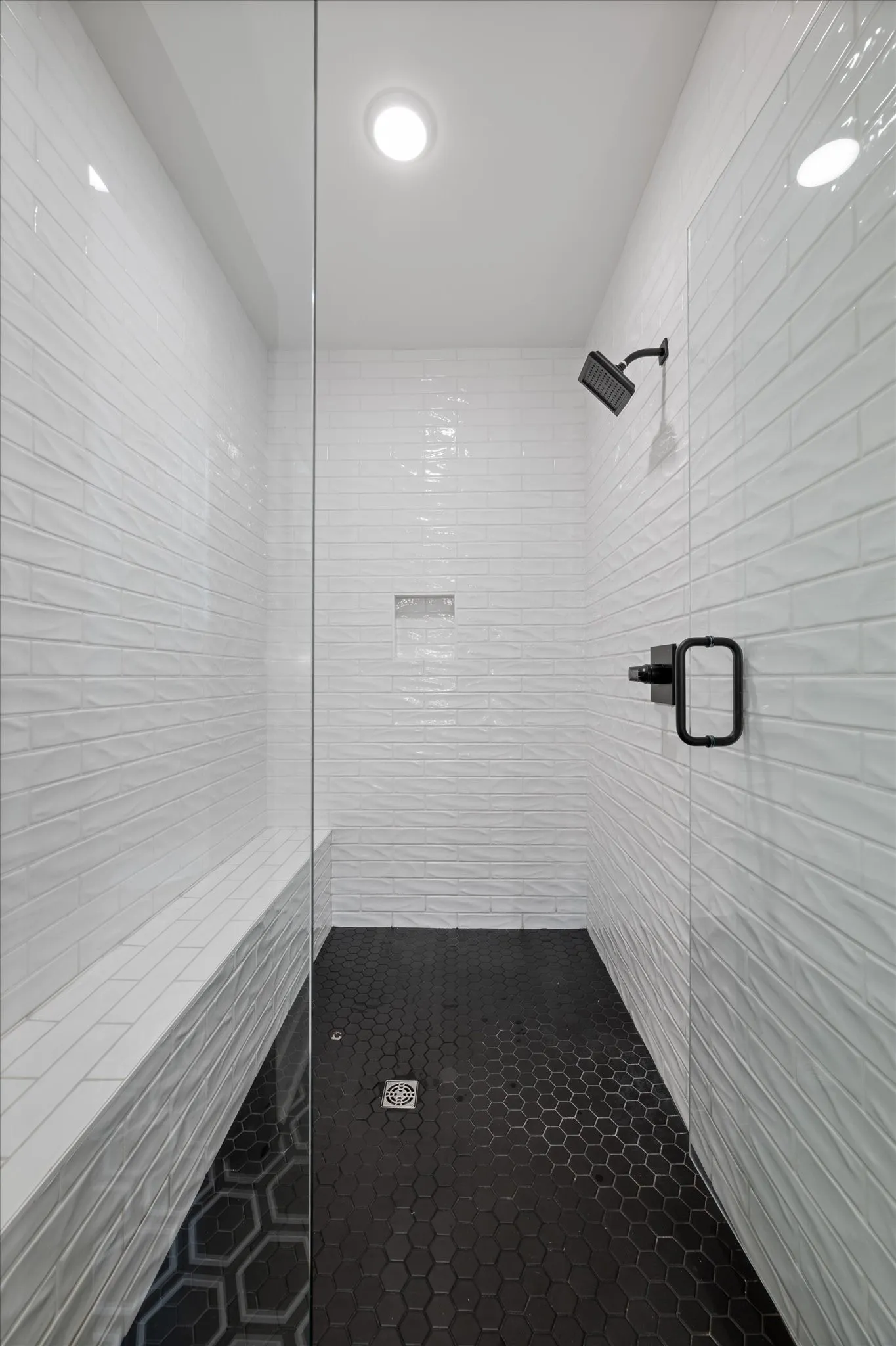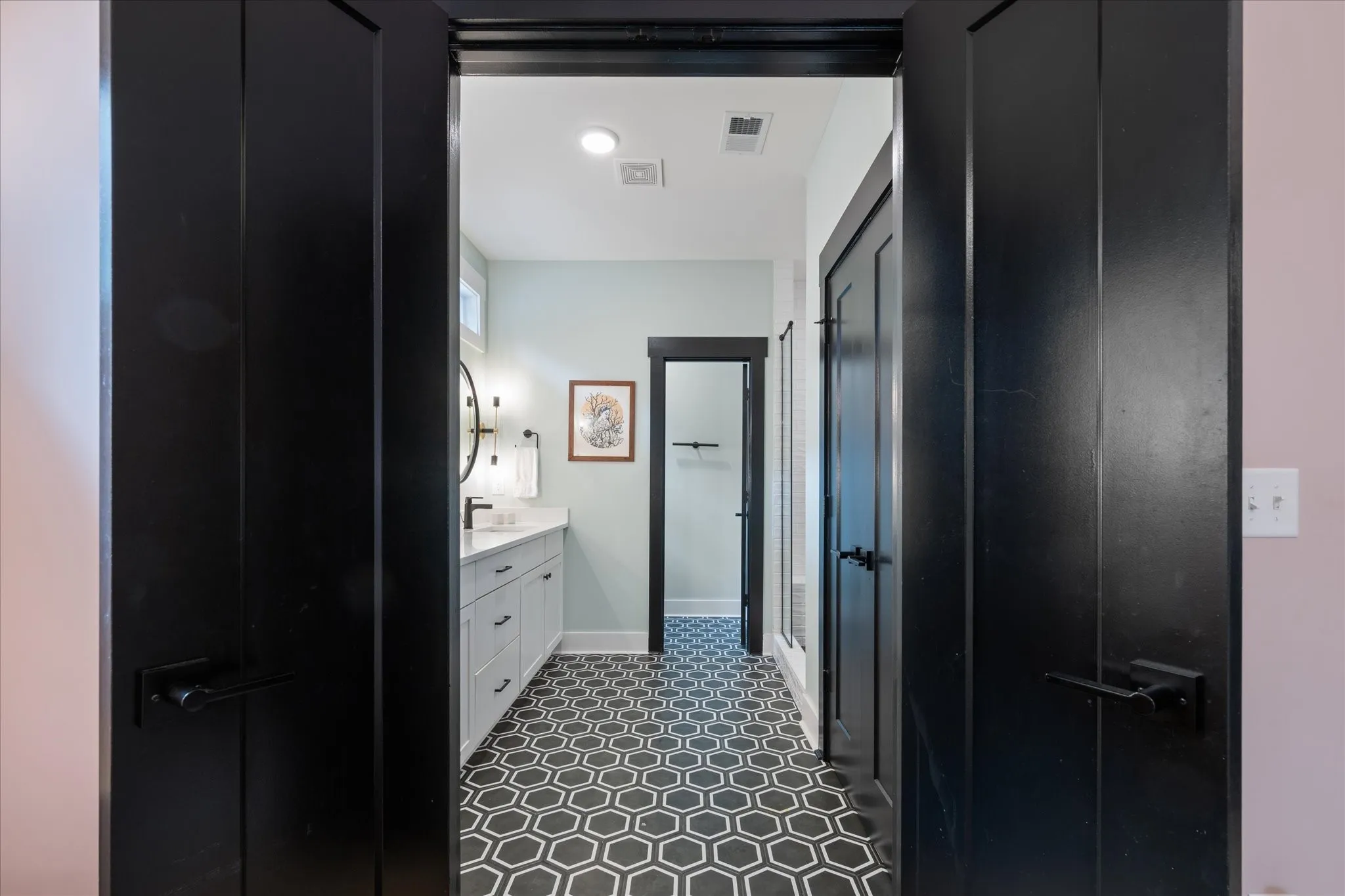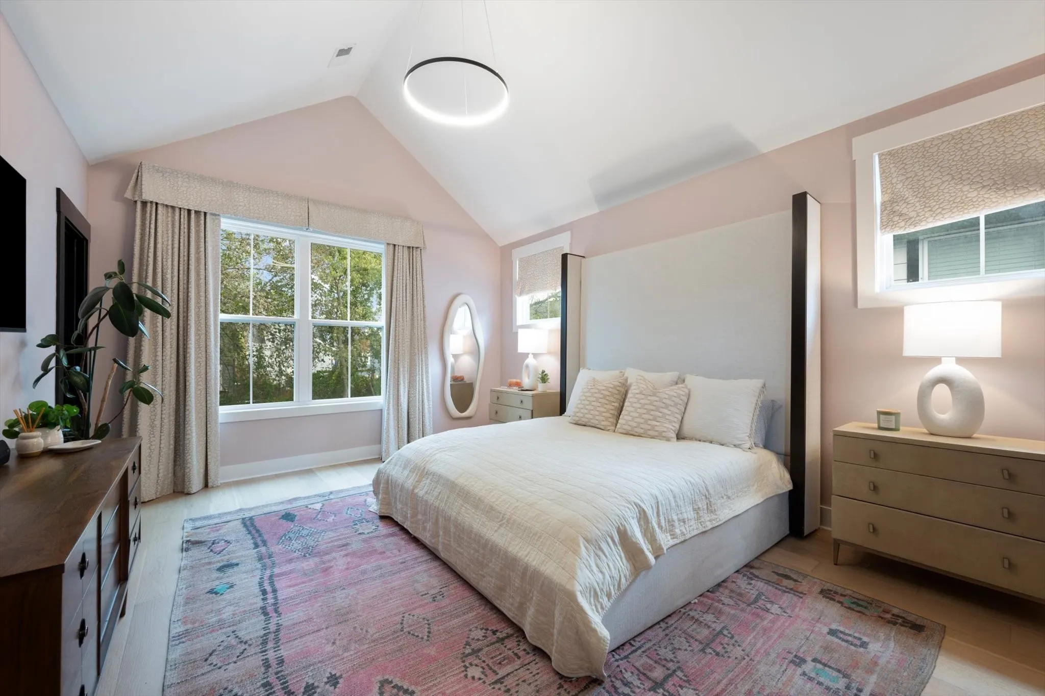 The primary suite offers a peaceful retreat with vaulted ceilings, abundant natural light, and a spa-like bathroom featuring an expansive walk-in shower with built-in niches. Every closet in the home has been thoughtfully designed to maximize organization and storage.