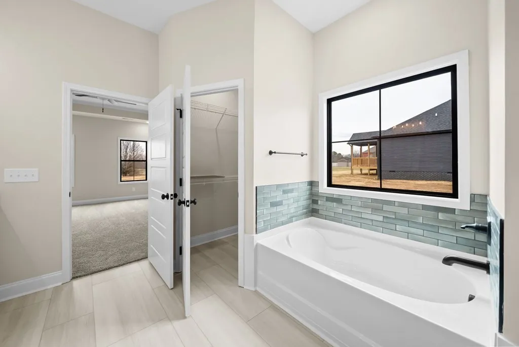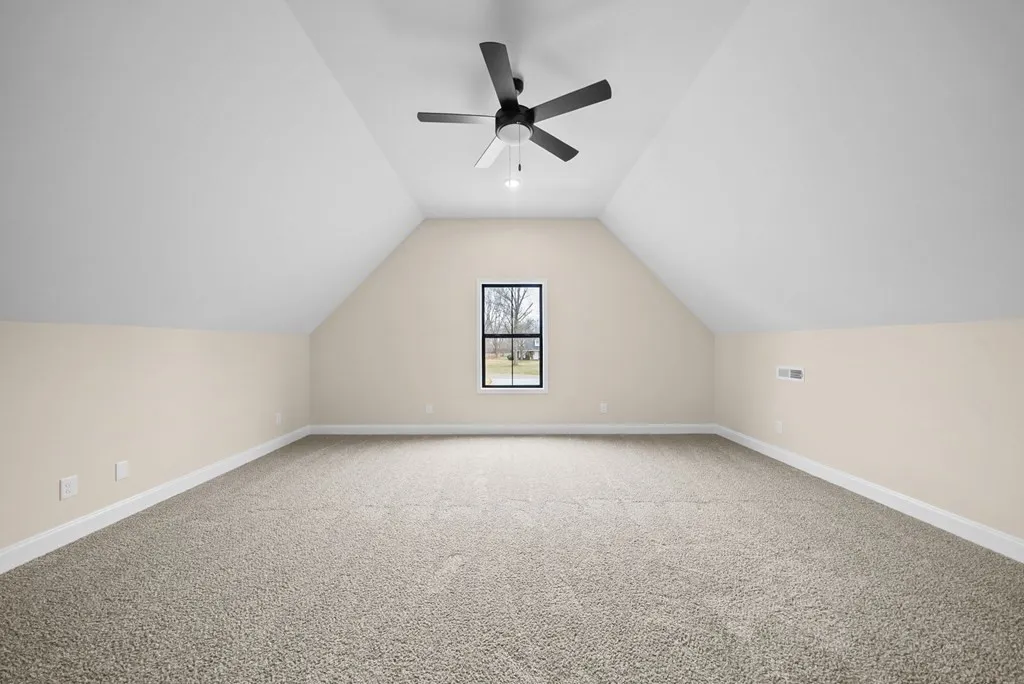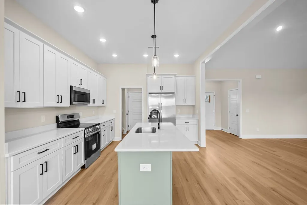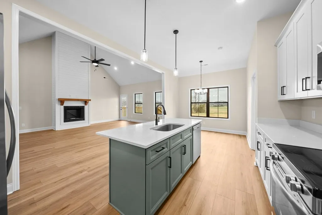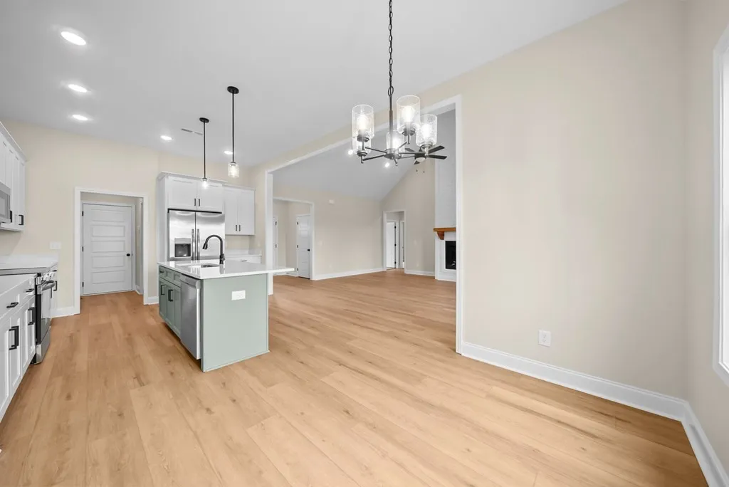 Enjoy the best of both worlds — a home that feels like you’re in the country, yet located right in town with quick access to the bypass for an easy commute. Step inside to a welcoming entryway with a convenient coat closet. The open-concept living room and kitchen flow together seamlessly, highlighted by a stunning floor-to-ceiling fireplace and durable LVP plank flooring throughout the living area, kitchen, and hallway. The modern kitchen features quartz countertops, island with extra seating, and a dining area that overlooks the backyard. This split-bedroom floor plan offers privacy. The master suite has tray ceilings, two walk-in closets, and a luxurious bath complete with a soaking tub, separate shower, and double vanities. 4 Bedrooms + A large bonus room with full bath + closet(or 5th bedroom). Enjoy your mornings or unwind in the evenings on the covered back porch, offering peaceful views and a touch of nature.