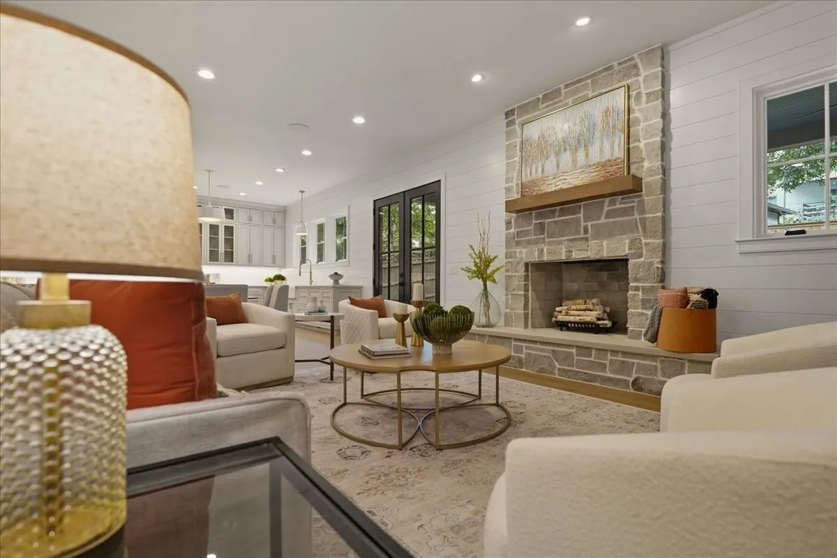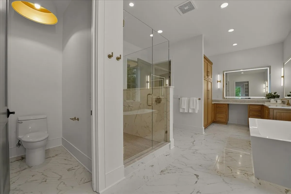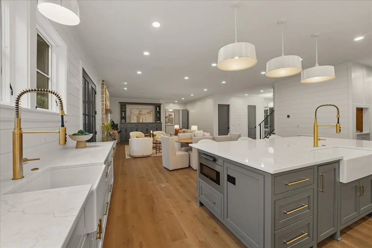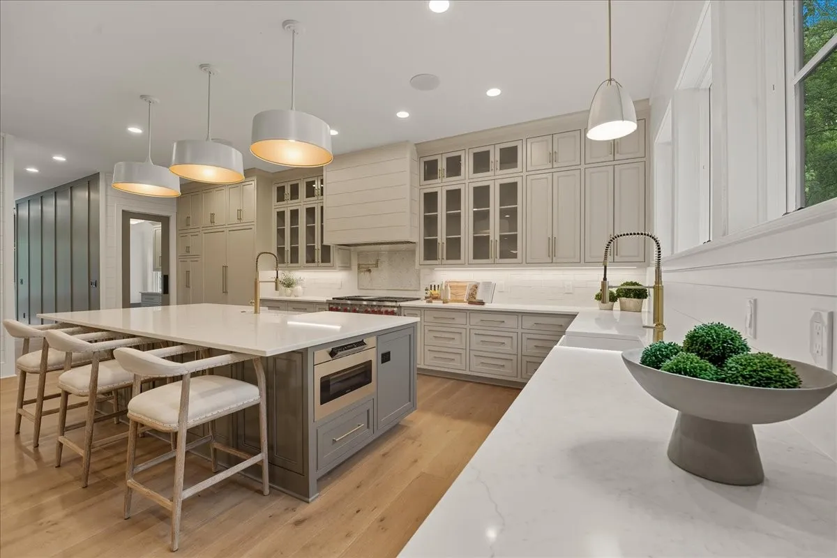 Every inch of this remarkable home reflects a deep commitment to quality, craftsmanship &timeless design. Built on a steel-reinforced poured concrete foundation w/brick construction, this residence combines unwavering strength w/exquisite architectural details. Classic bead board ceilings on front&back porches along w/Coppersmith gas lanterns set the tone for a home that’s as beautiful as it is enduring. Upon entering, you are greeted by the soothing sounds of your personal Sonos amp system w/18 ceiling speakers &individual fader controls smartly placed throughout common living areas. Kitchen is a chef’s dream w/Calacatta Miraggio Cove Quartz countertops, 48” Wolf gas range w/double ovens, Sub-Zero refrigerator &freezer columns,Bosch Benchmark dishwasher&Scotsman nugget ice machine. A large walk-in pantry w/ prep space completes the culinary experience. Great room centers on a dramatic wood-burning stone fireplace complemented by a custom TV console w/shelving&white oak accents. Separate spacious dining room is complete w/bar area serving as both a visual centerpiece&an entertainer’s dream. It features black honed countertops,custom built-ins for glass&bottle storage,wine frig&ice maker&brass rail/glass shelving set against antiqued smoked mirrors. Inviting Primary suite is a retreat to behold w/a vaulted wood plank ceiling, Taj Mahal quartz surfaces, Brizo Litze luxe gold fixtures, double vanities&a graciously-sized soaking tub. Walk-in closet offers an expansive 20-drawer center island&specialty shelving like angled shoe racks. Main-level laundry offers extensive cabinetry w/over 160 cubic feet of storage—ideal for linens, luggage, and seasonal needs. Upper floor boasts a central gathering room from which 4 bedrooms rest, each w/ their own private bathrooms&walk-in closets.Another full laundry room is found here w/front-facing window that allows sunlight to wash across the patterned floor tile.