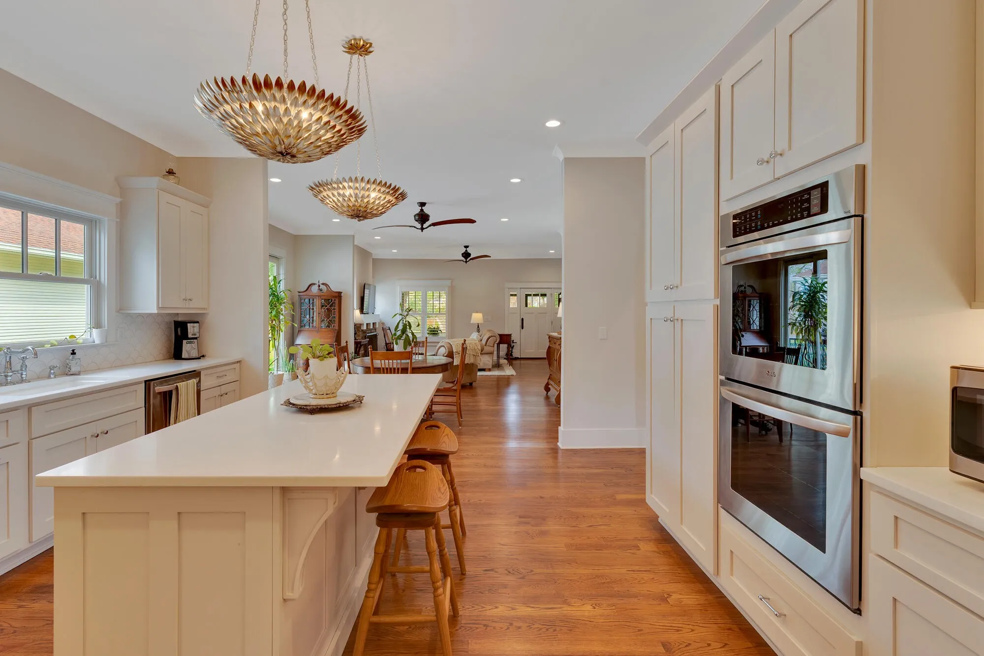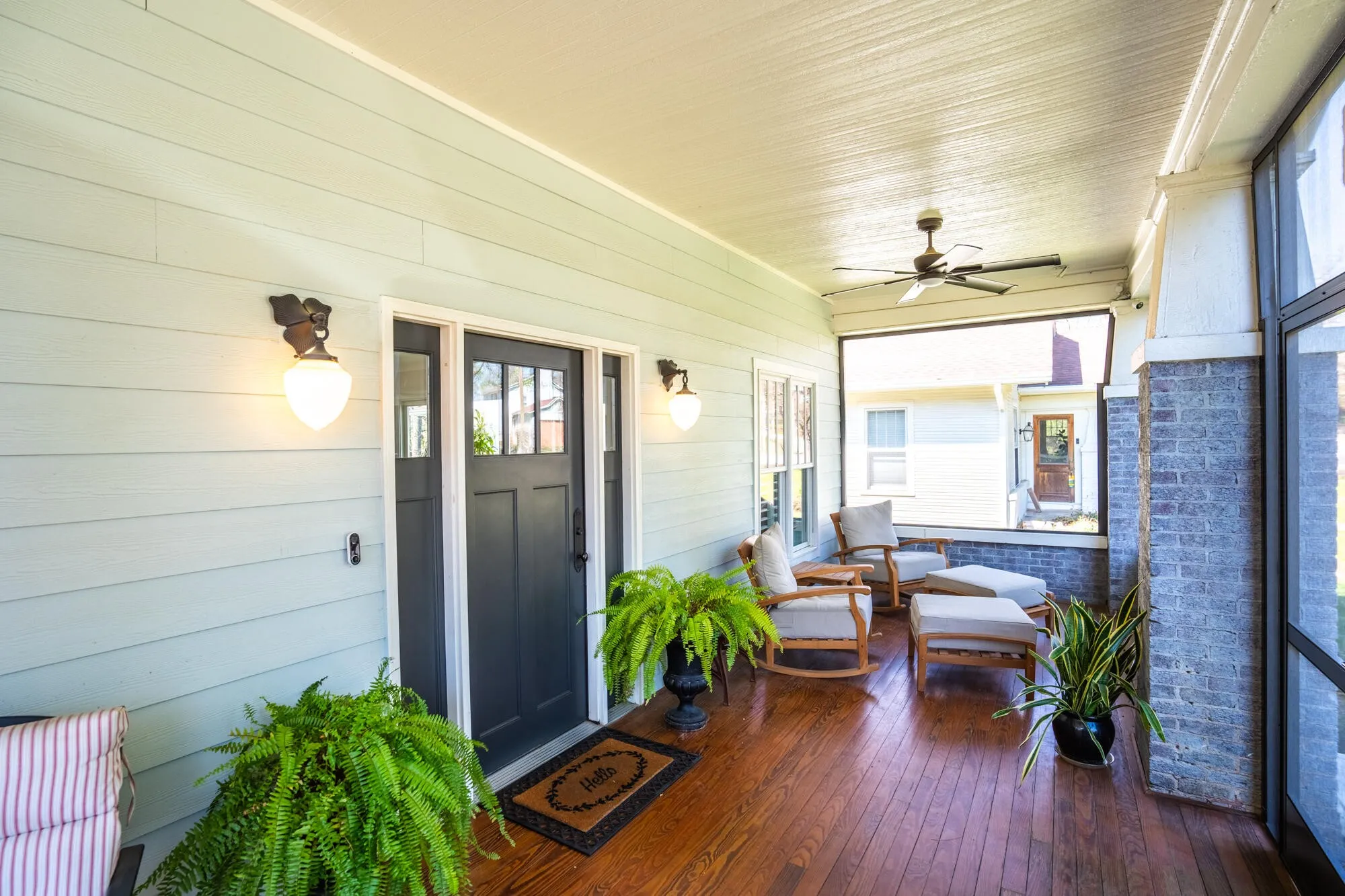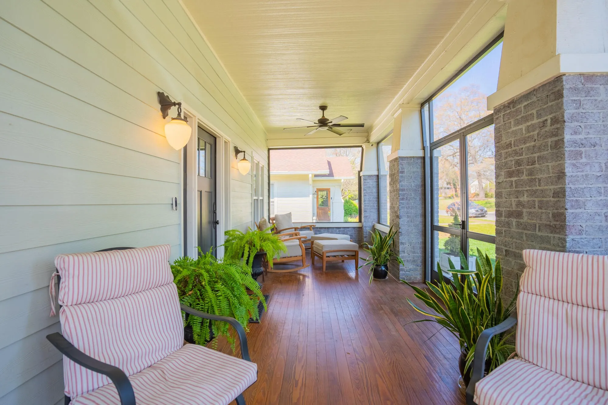 The spacious kitchen includes a large island and plenty of natural light, opening into a warm living area with a gas fireplace. The home offers three bedrooms, two-and-a-half bathrooms, and a flexible office or sunroom. Both full bathrooms include walk-in showers with custom tile. Enjoy relaxing on the screened front porch or large side porch. The oversized two-car garage offers plenty of room for SUVs and extra storage.
