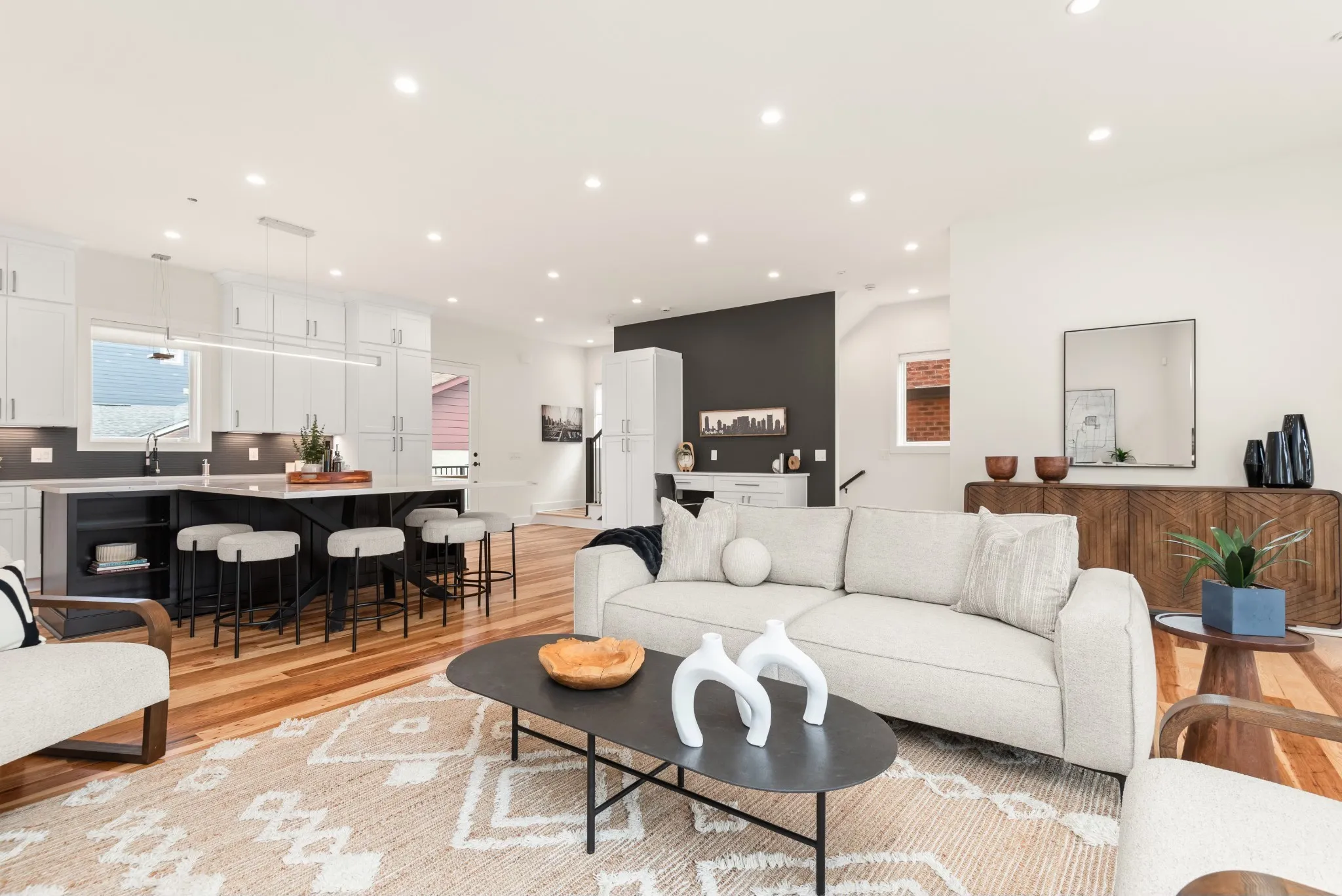 The home offers two private primary suites, on the ground and third floors, each with en-suite baths, plus an additional full bath on the main level. The third floor also features a second workspace and ample storage.