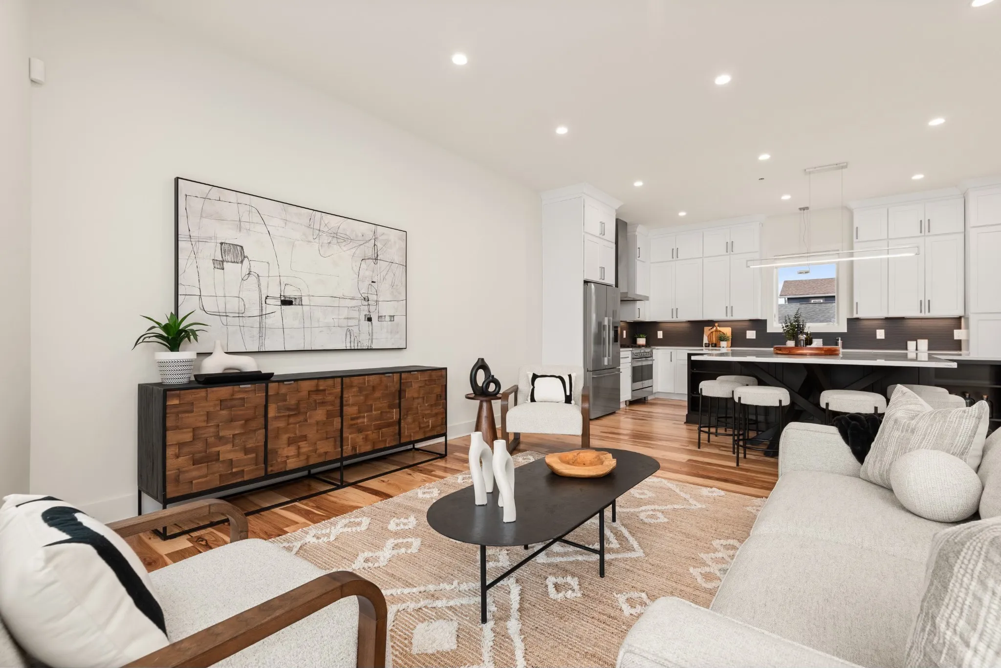 Inside, enjoy 10-foot ceilings, hickory floors, and an open-concept layout designed for modern living and entertaining. The gourmet kitchen features stainless steel Fisher & Paykel appliances, a gas range, and a striking built-in dining table. The main living area opens to a private balcony and includes a built-in desk for work-from-home convenience.