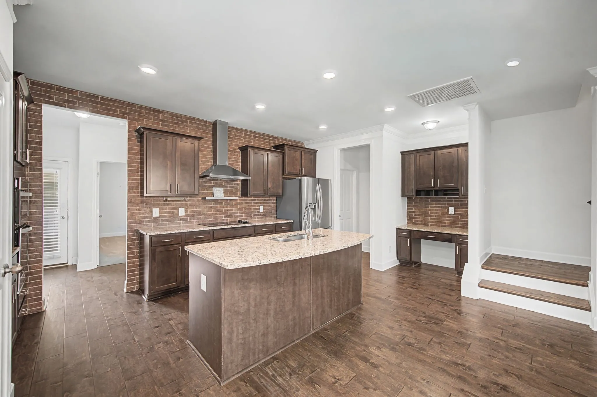 Inside, abundant windows fill the home with natural light. The main-level primary suite features a generously sized bedroom with trey ceiling, a spa-worthy bath, and a large walk-in closet. The first floor is anchored by hardwood floors and a well-appointed kitchen with granite countertops, stainless steel appliances, a striking backsplash and handsome cabinets. Additional highlights include a dedicated desk area, oversized laundry room, and convenient half bath—designed for both comfort and efficiency.