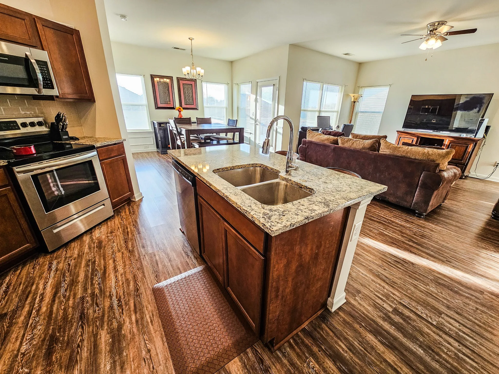 The kitchen provides ample cabinet and counter space, while the open flow into the living and dining areas creates a warm and welcoming atmosphere! Step outside to enjoy a peaceful setting with room to relax, play, or host gatherings.