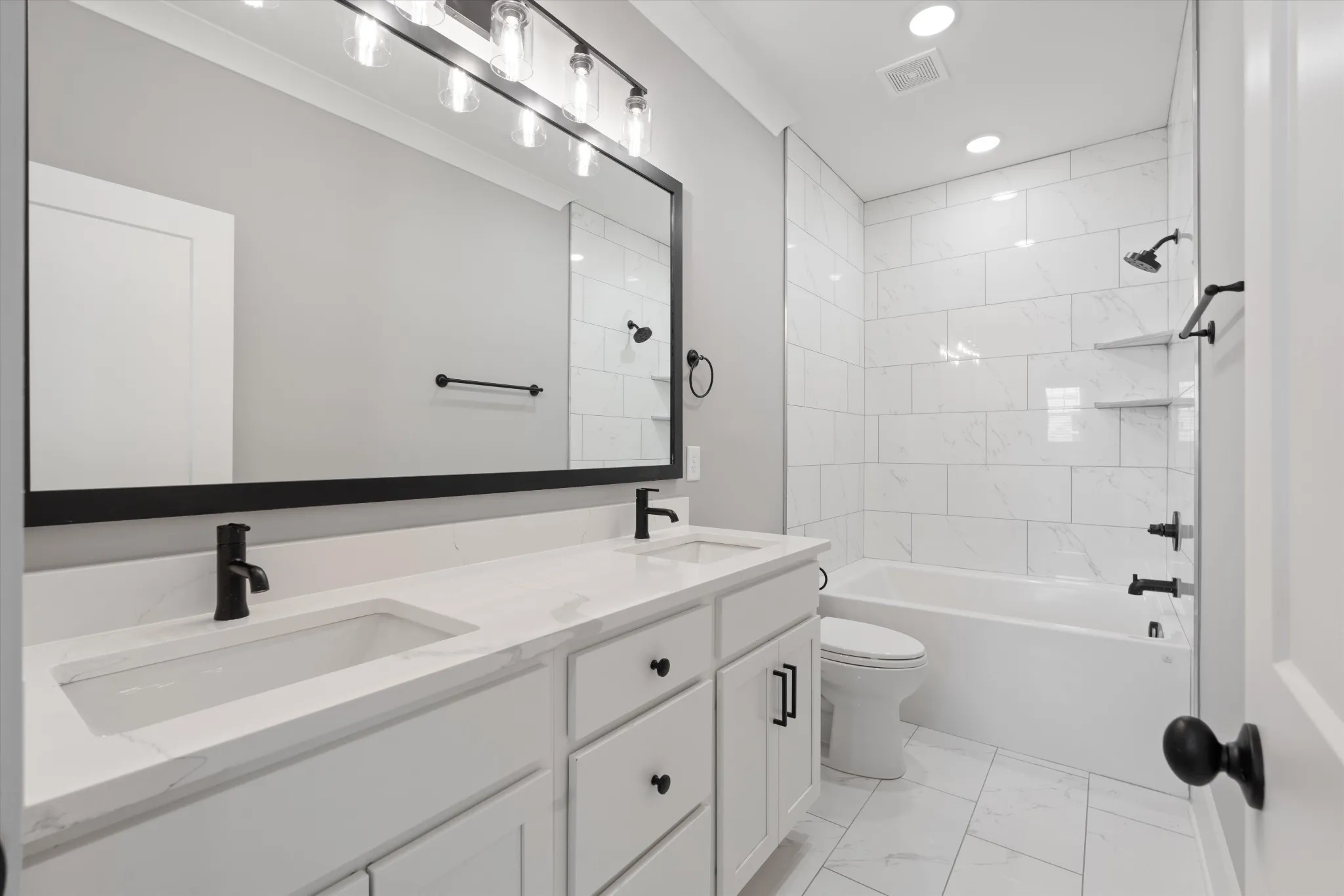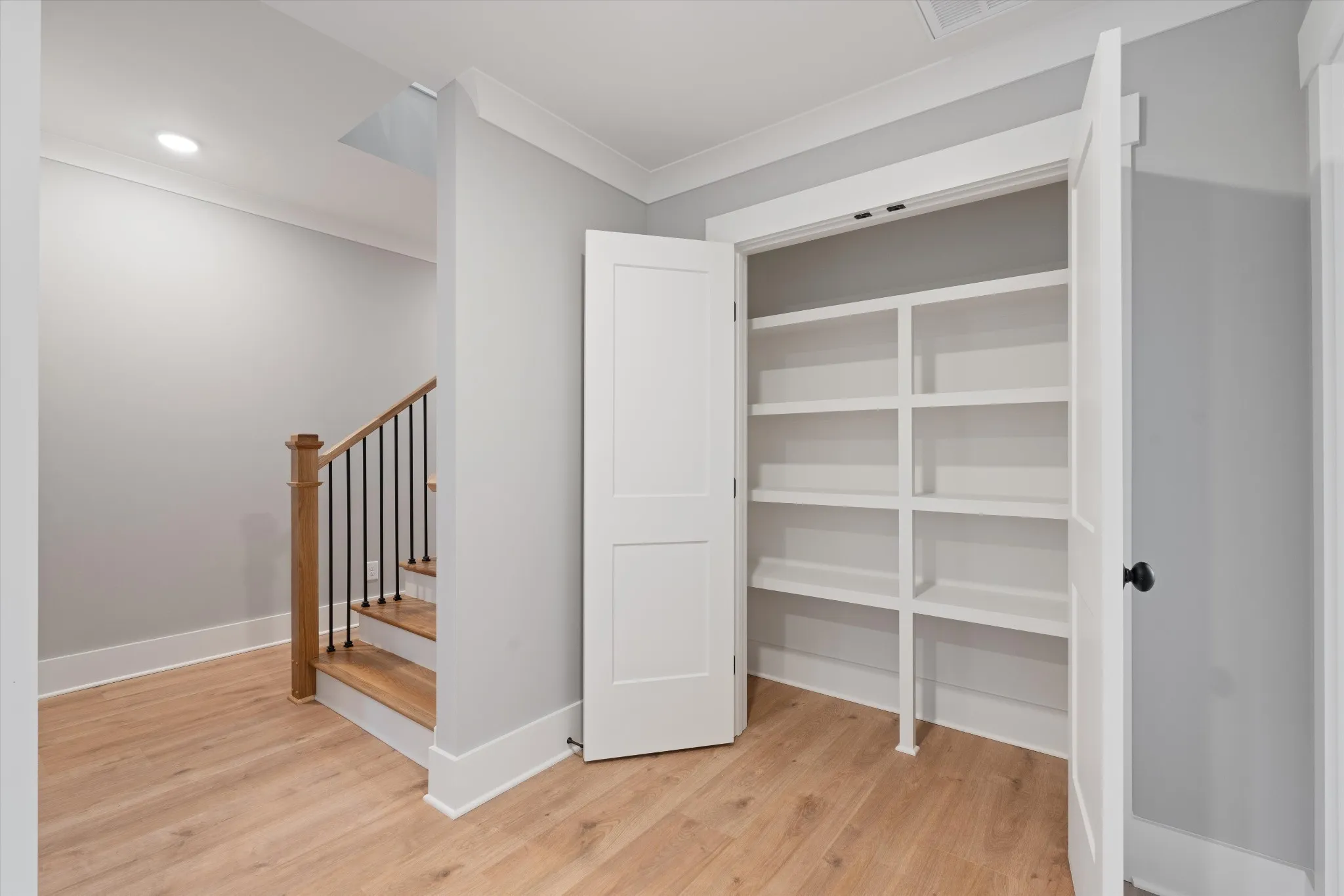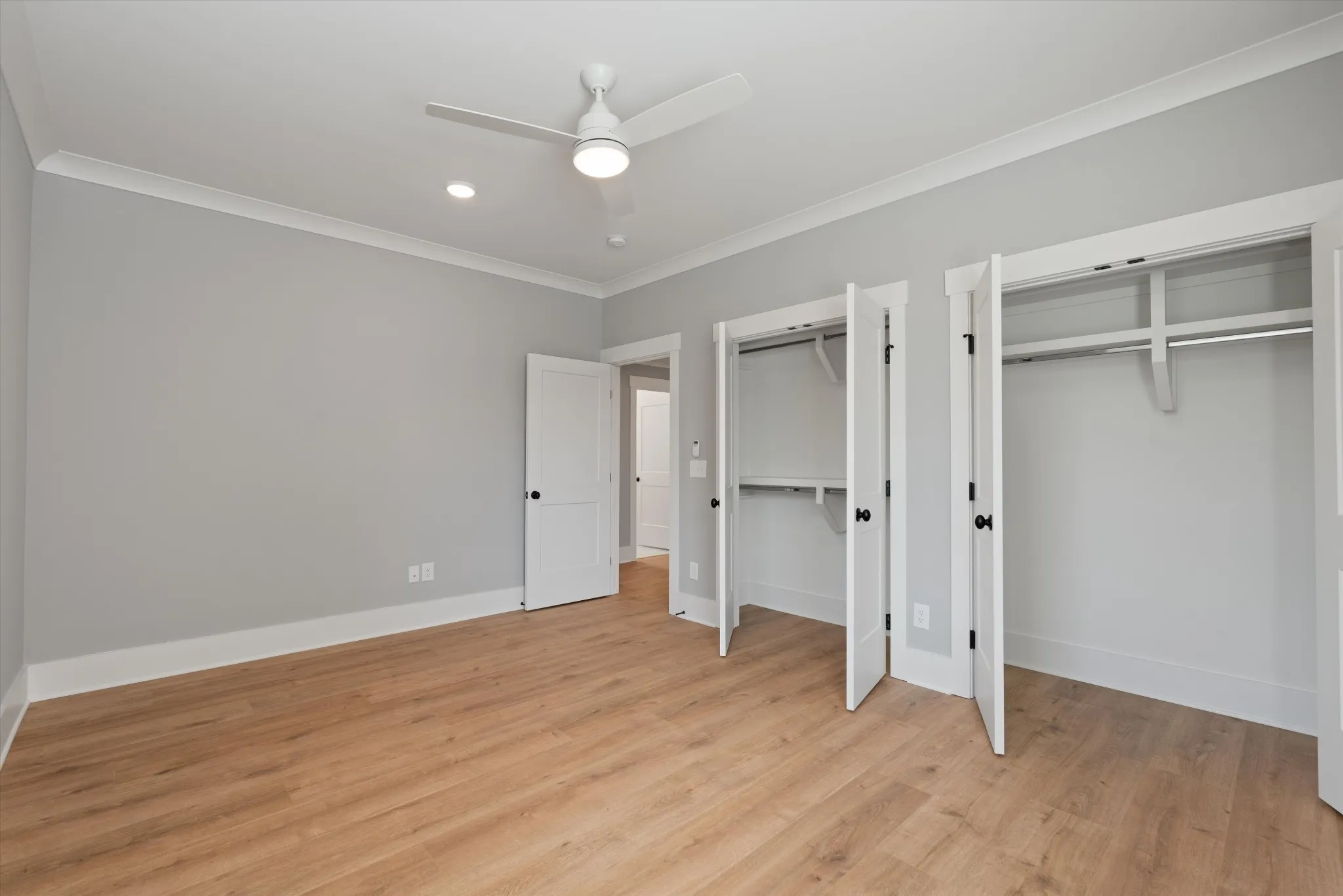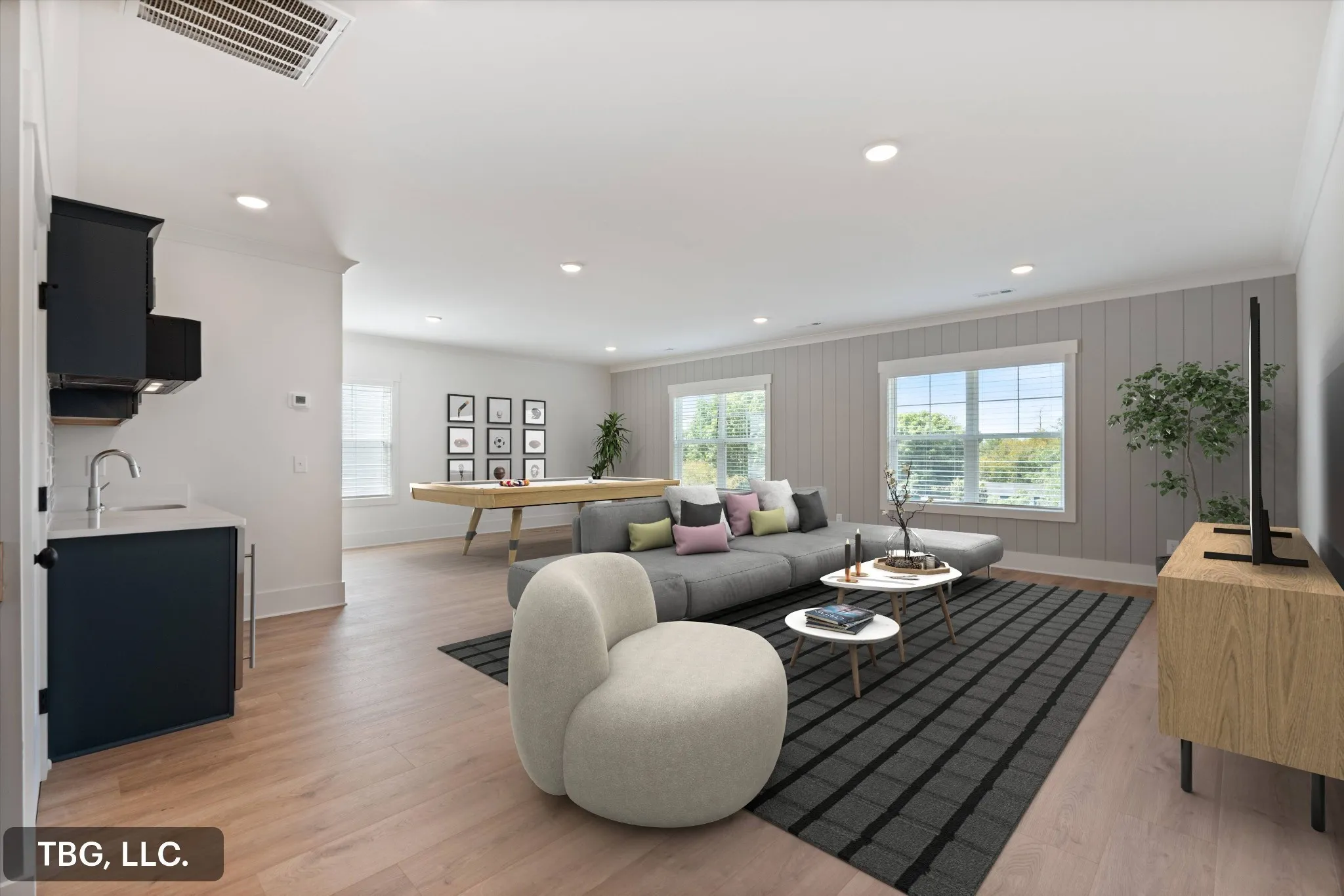 High-end finishes throughout include quartz countertops, custom shelving in every closet, detailed trim work, and stylish accent walls. The spacious flex/bonus room features a full bath and built-in wet bar, along with walk-in attic storage, a two-car garage, and a relaxing covered back patio.
