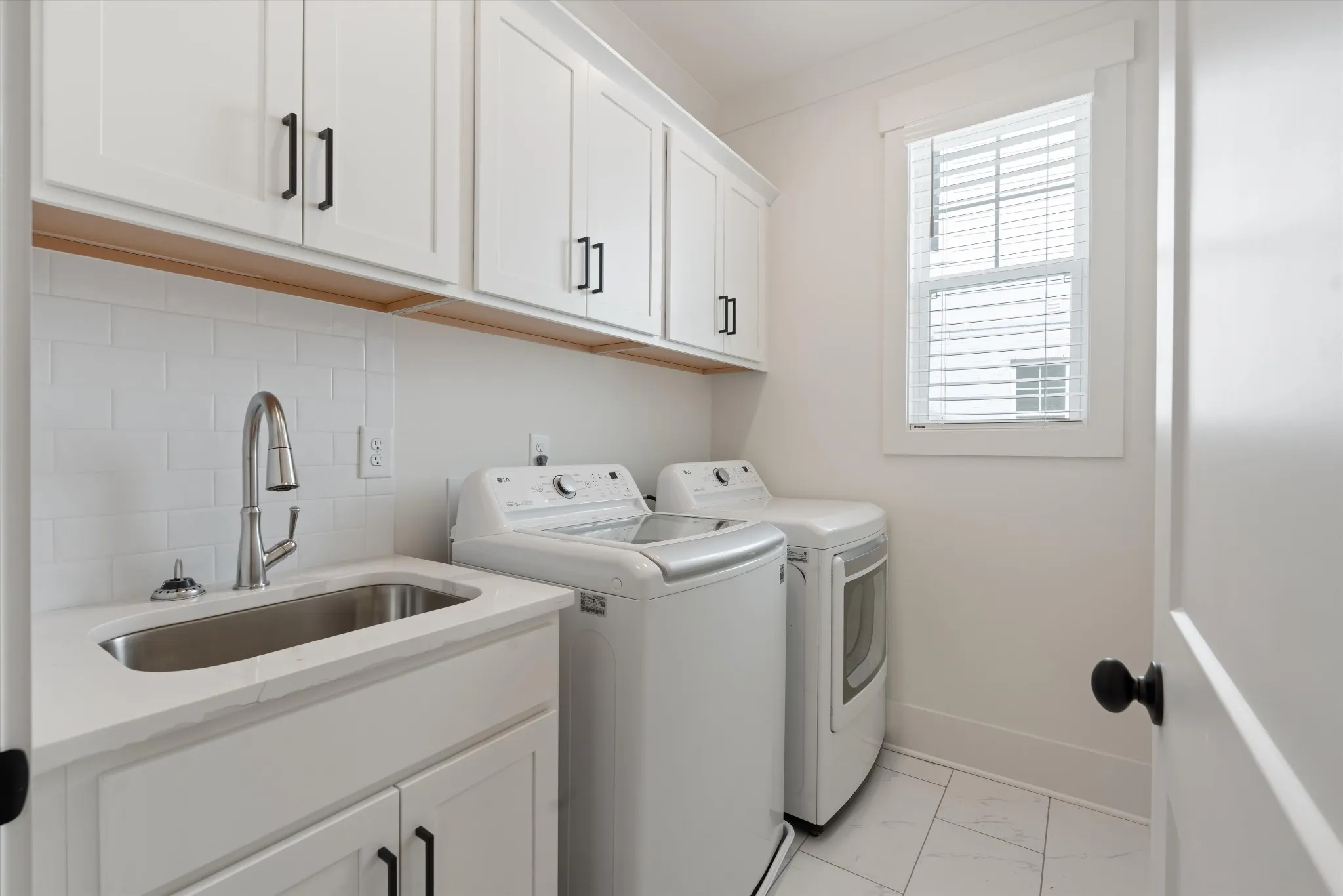 The kitchen is designed for entertaining, with cabinetry extending to the ceiling and a luxury Bosch appliance package, including a double oven. A counter-depth refrigerator, washer and dryer, and window blinds are all included.