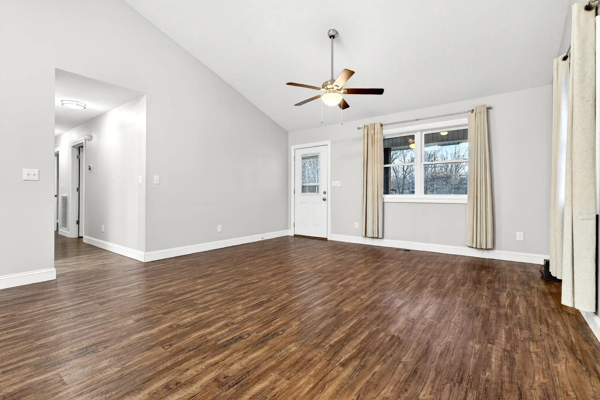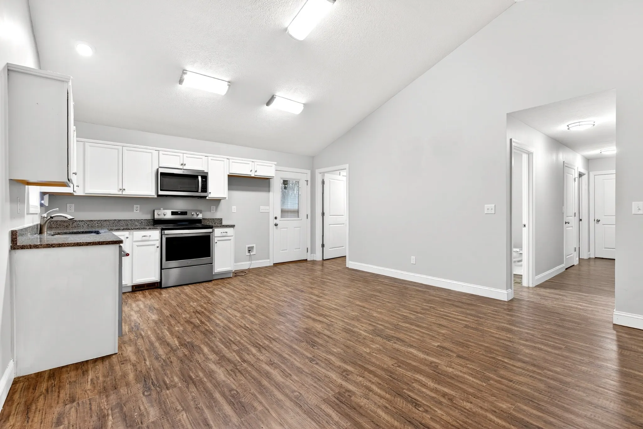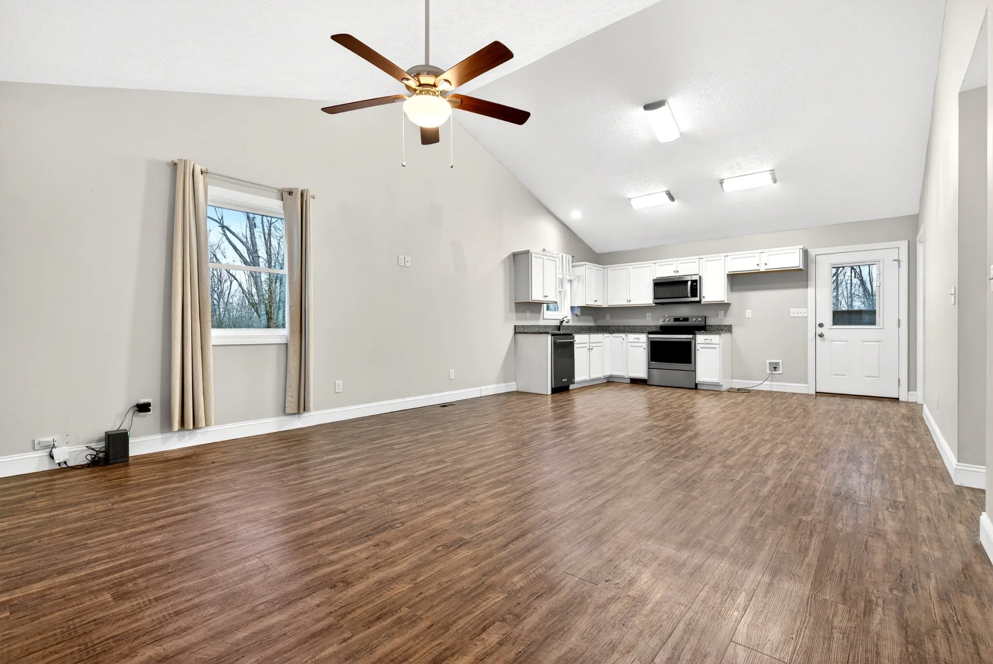 Step inside to an inviting open-concept layout featuring vaulted ceilings in the living room and kitchen, creating a bright and airy atmosphere ideal for everyday living and entertaining.
