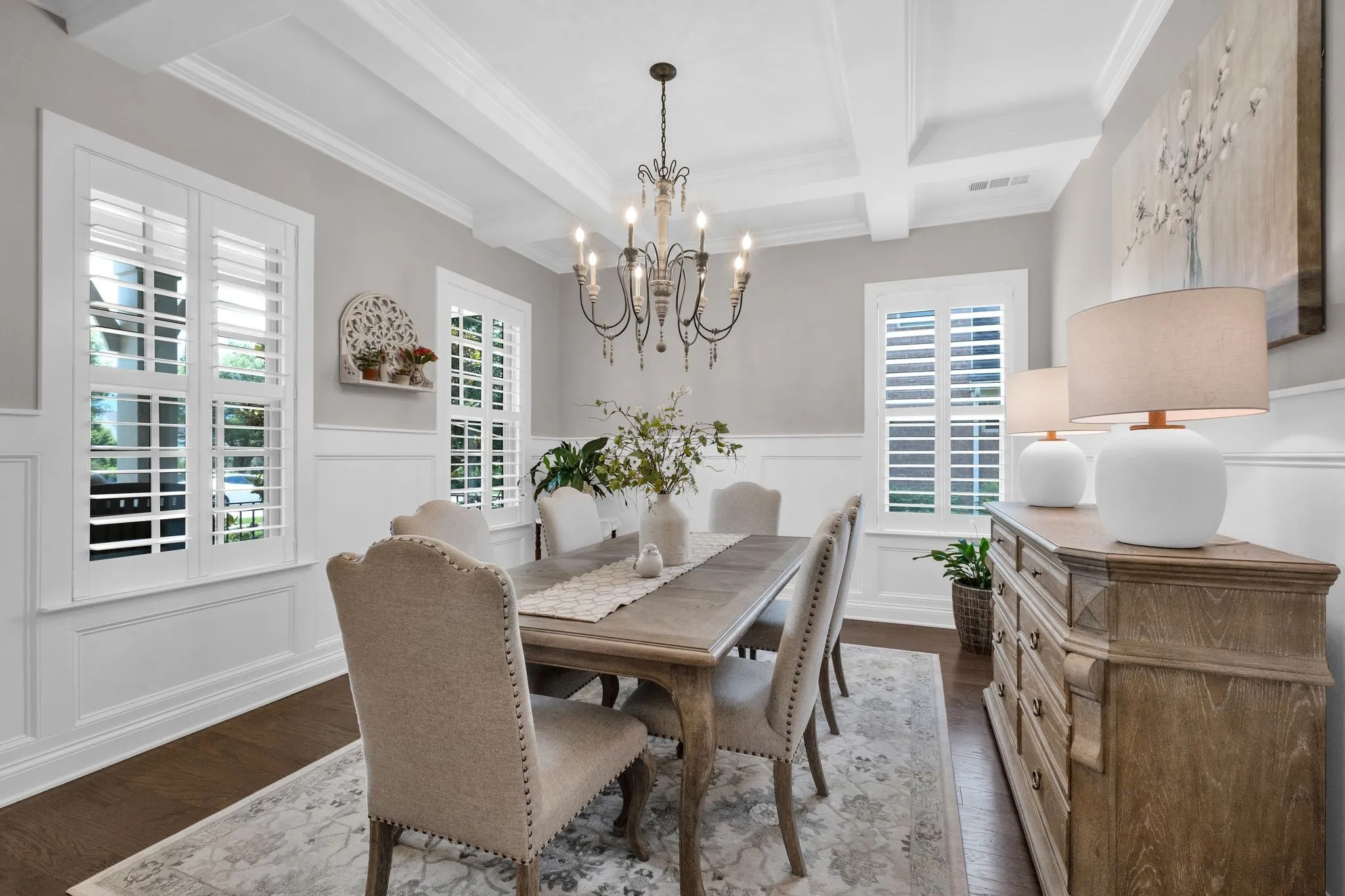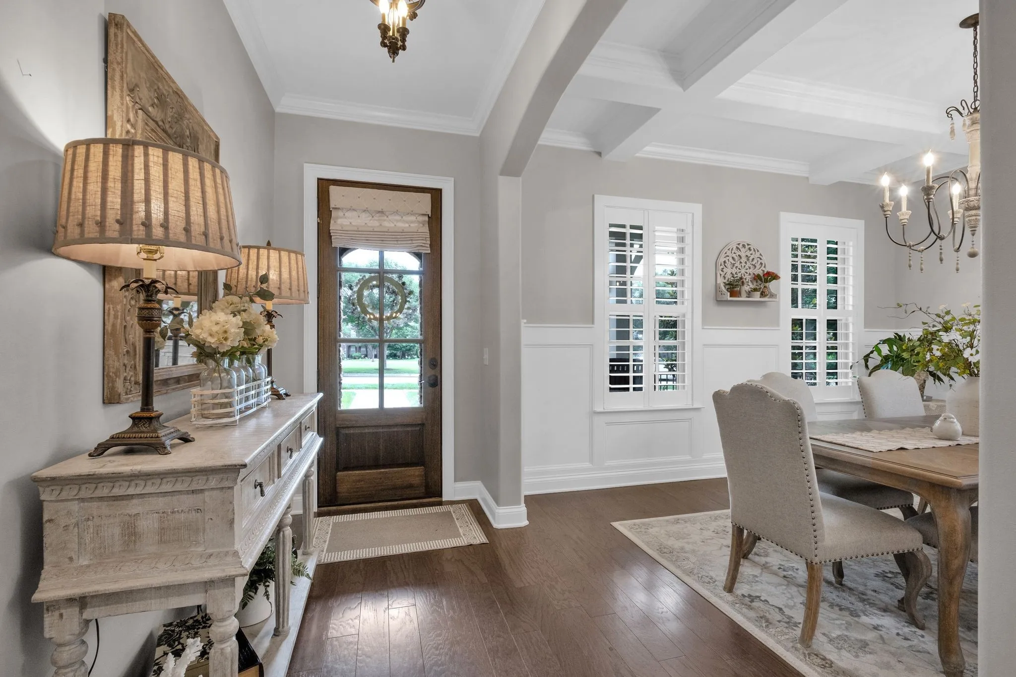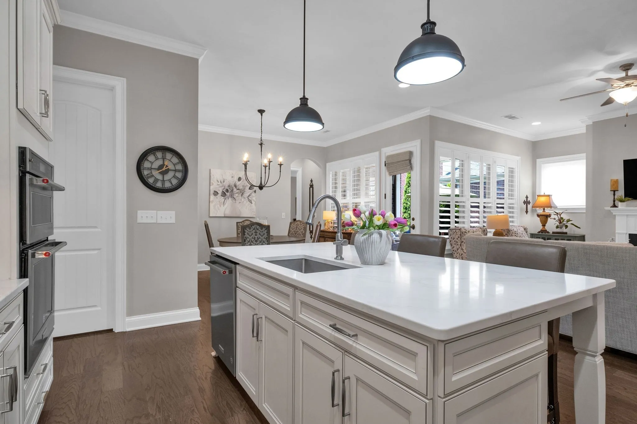 This immaculate, move-in-ready residence offers the look and feel of new construction from the moment you step inside. The thoughtfully designed floor plan features two spacious bedrooms on the main level, complemented by rich hardwood floors, elegant new baseboards and trim, and a tastefully updated kitchen. The kitchen showcases a new backsplash, gleaming quartz countertops, a modern sink, and an updated dishwasher. Throughout the home, you’ll appreciate the abundance of thoughtfully designed storage, including added cabinetry, custom closets, and classic plantation shutters.