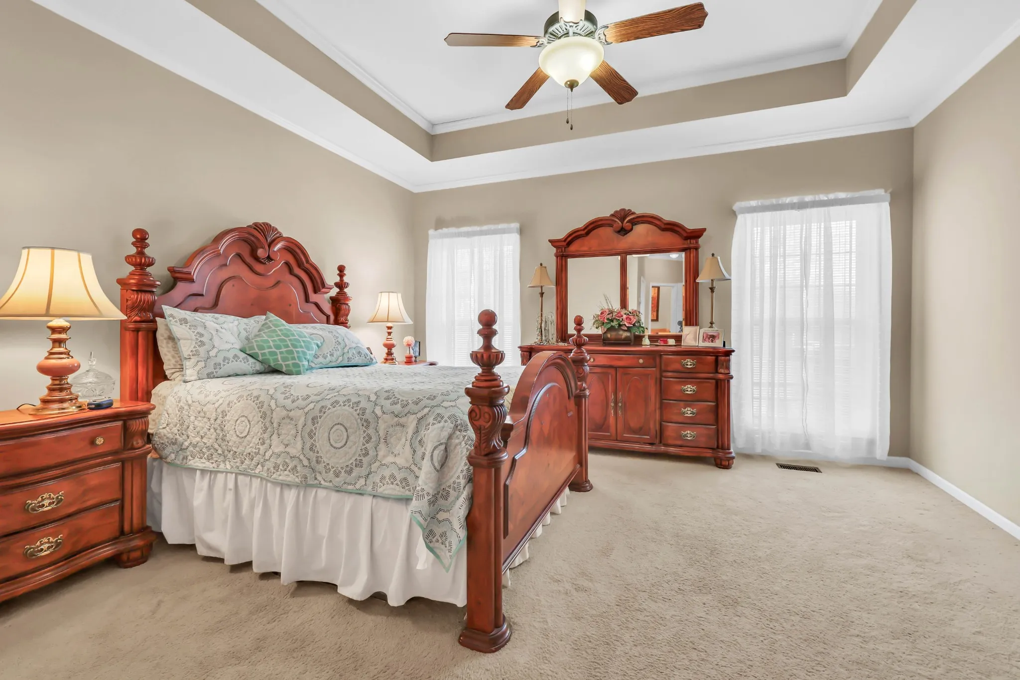 The primary suite is a retreat of its own, complete with a trey ceiling, oversized walk-in closet, and a spacious en-suite bath with double sinks plus a dedicated seated vanity—perfect for getting ready with ease and comfort.