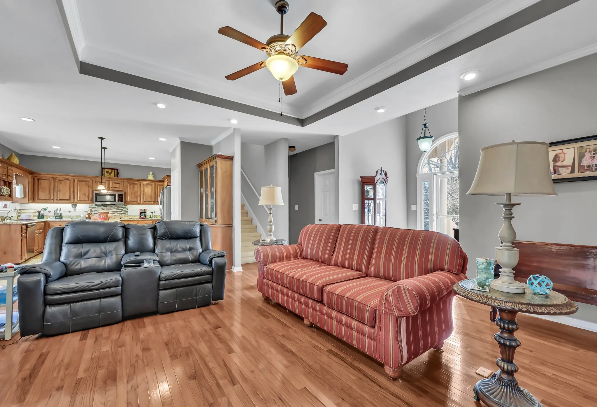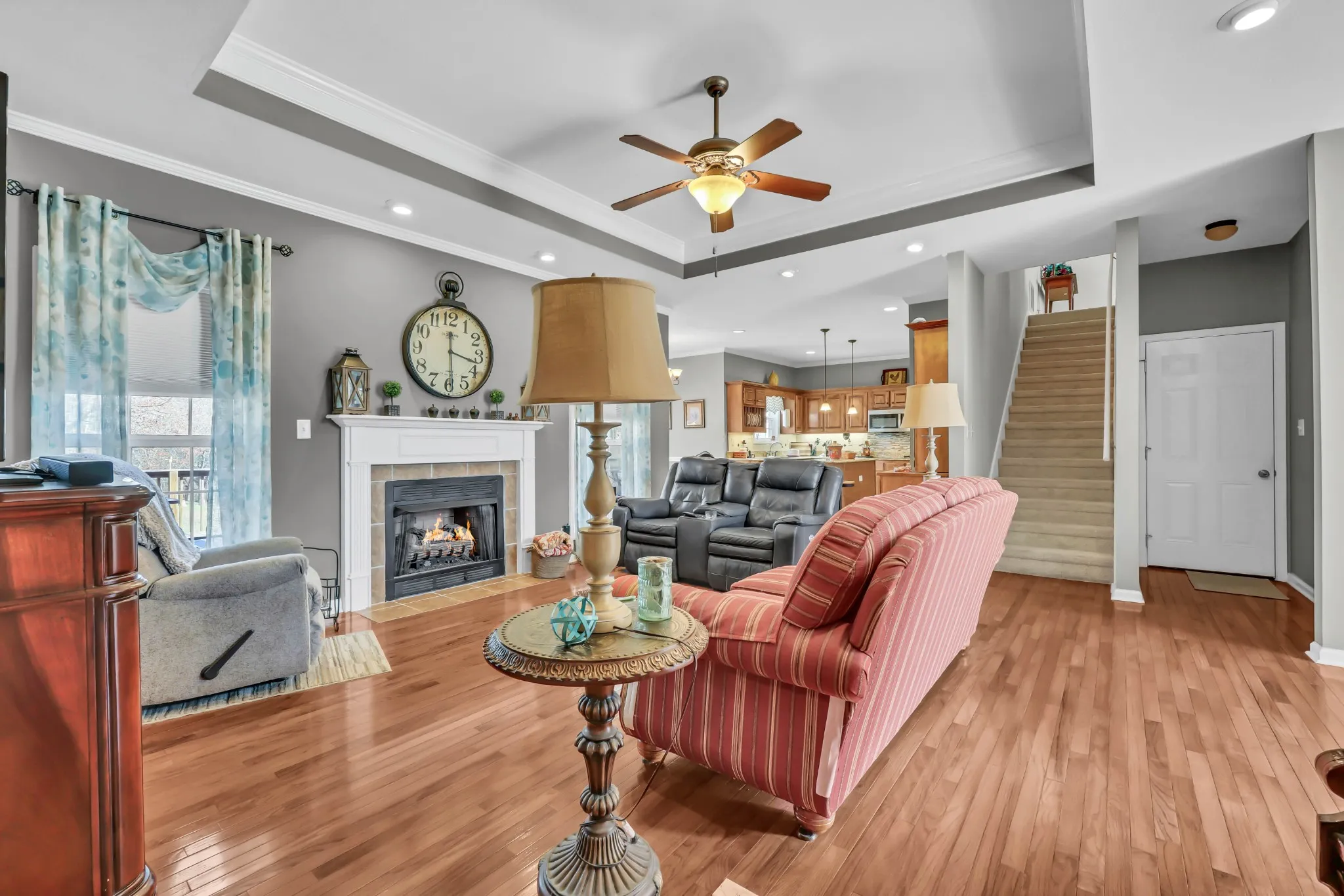 Inside, the open floor plan creates an easy, inviting flow, with a trey ceiling and cozy fireplace anchoring the living room and seamlessly connecting to the kitchen and dining area. The kitchen is truly the heart of the home—featuring abundant counter space, generous cabinetry, a center island, and a walk-in pantry that makes both daily living and entertaining effortless.