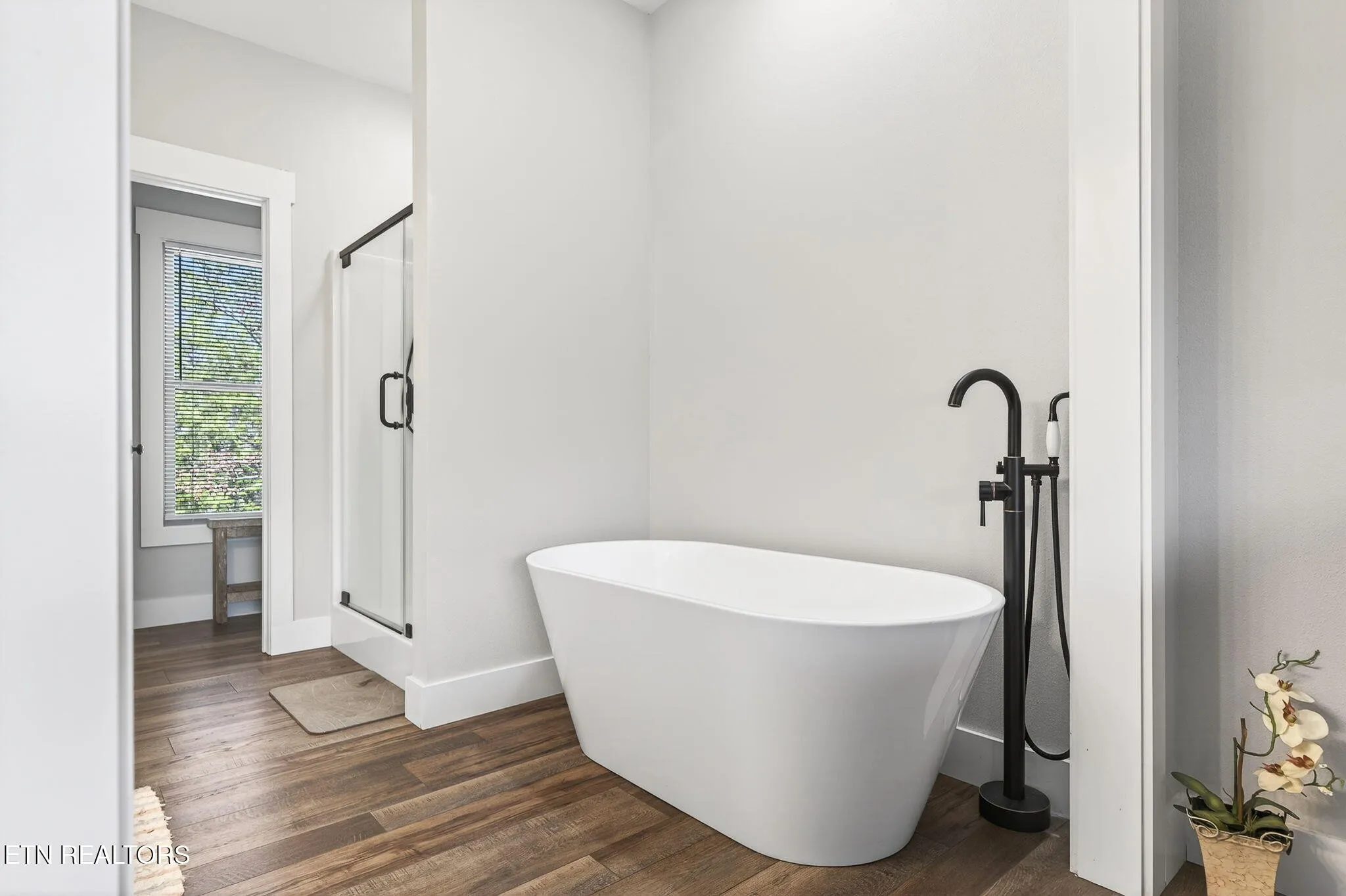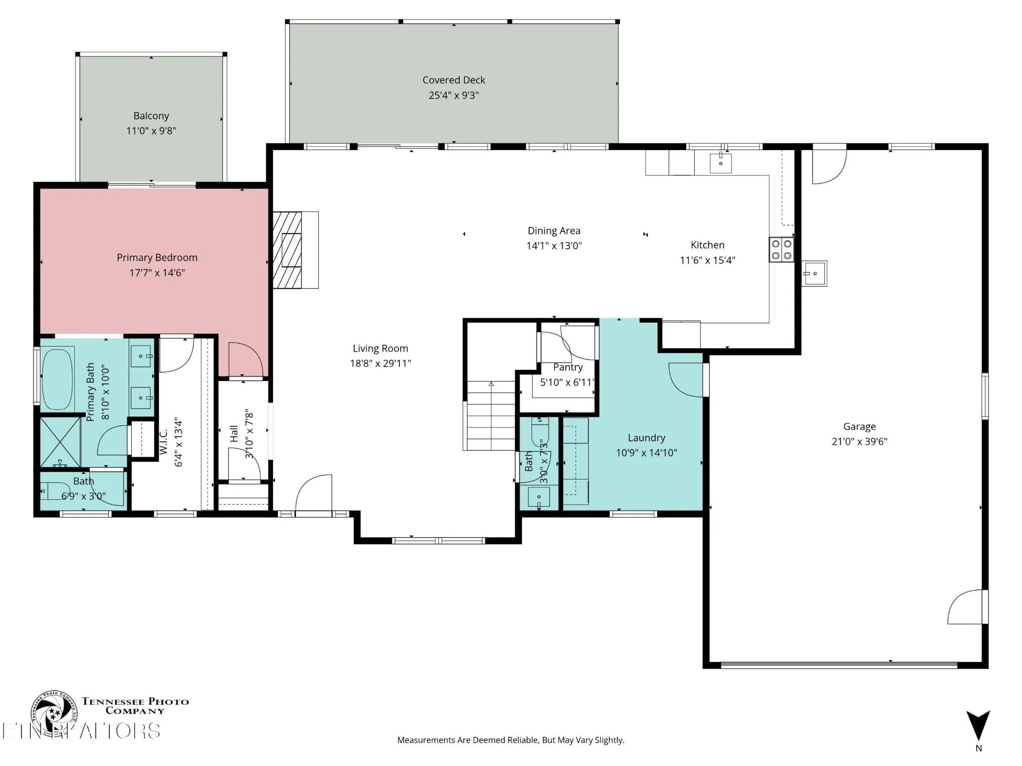 • Main-level primary suite with a private balcony, large walk-in closet, soaker tub, double sink oversized vanity, linen closet, and walk-in shower with glass doors