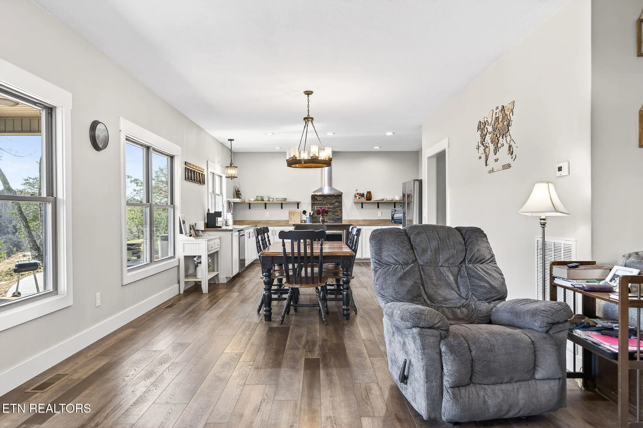 • Spacious main-level living room with a stone fireplace and wood-burning insert