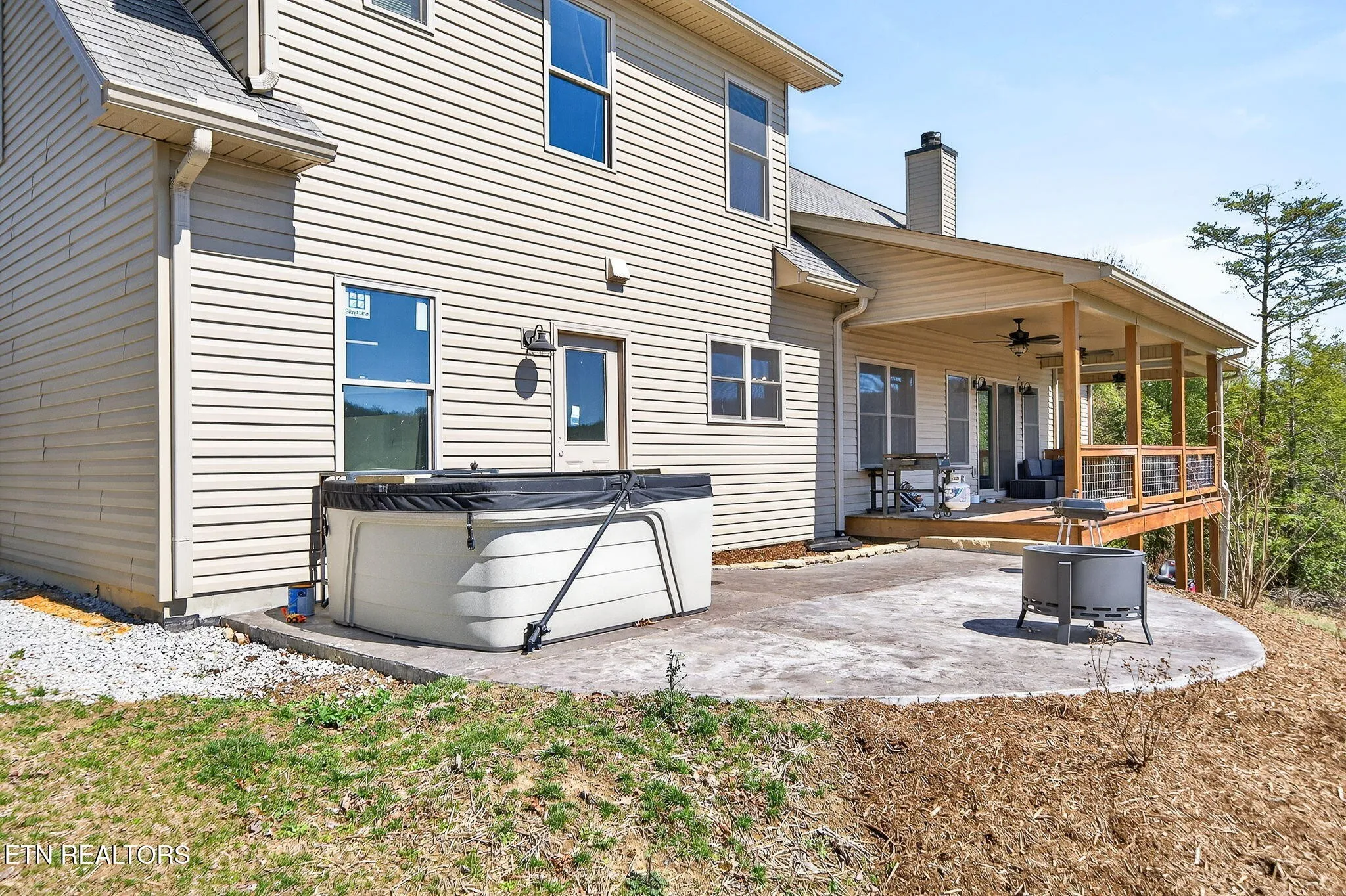 • Covered front porch, stamped concrete sidewalks and patio, and a large covered deck with fans