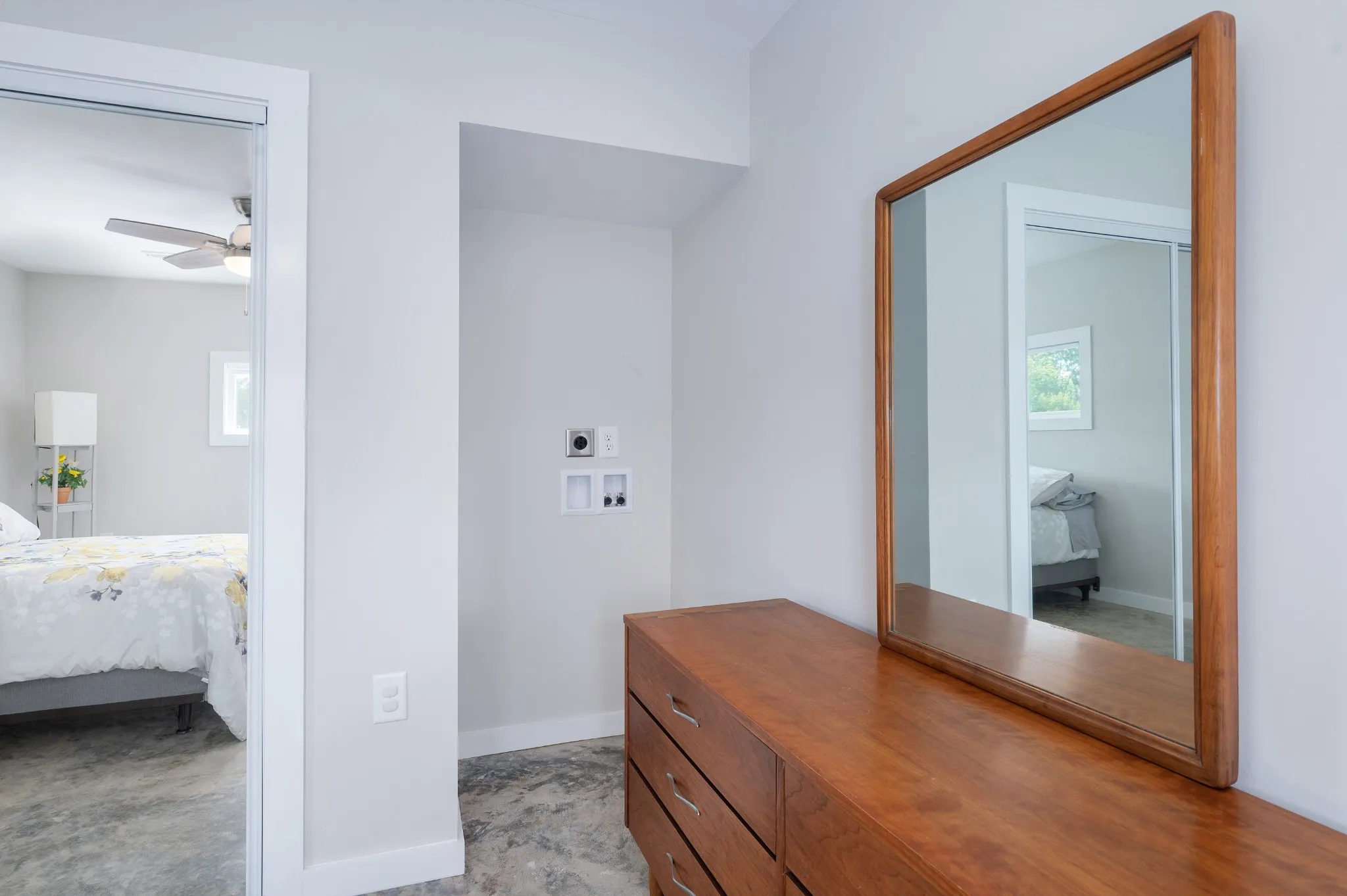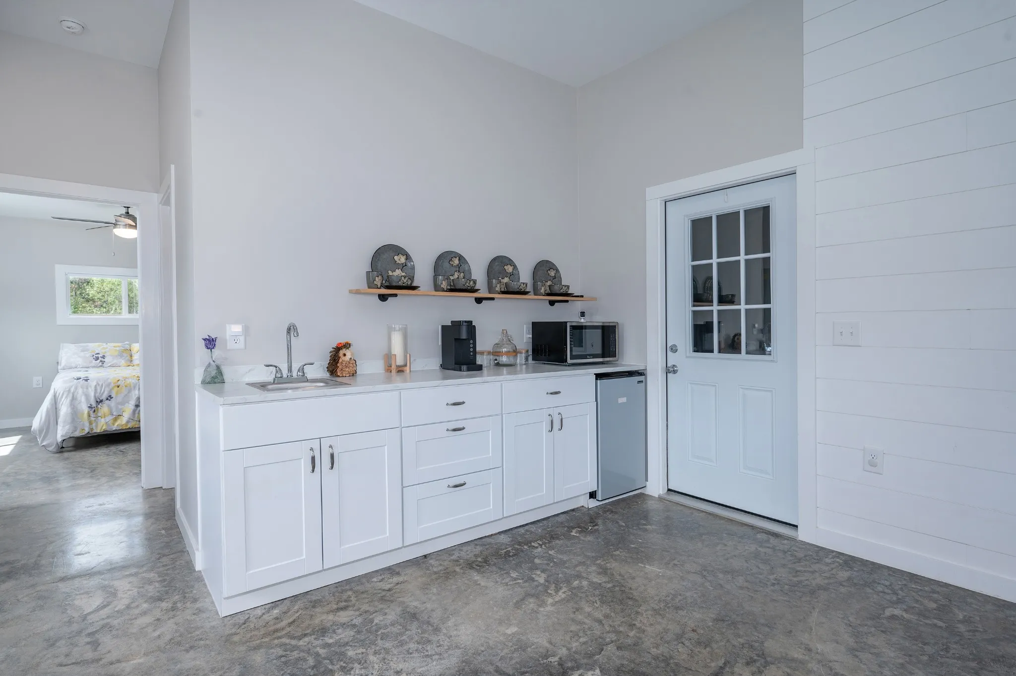 The thoughtfully designed layout features an owner’s suite with a private living room, full kitchen with all appliances, one bedroom, and full bath, and a guest suite with living area, efficiency kitchen, one bedroom, and full bath. Between the suites, a spacious garage/workshop is large enough to park an RV and includes a ½ bath, laundry area with washer/dryer connections and loft storage. Polished concrete floors run throughout for durability and style.