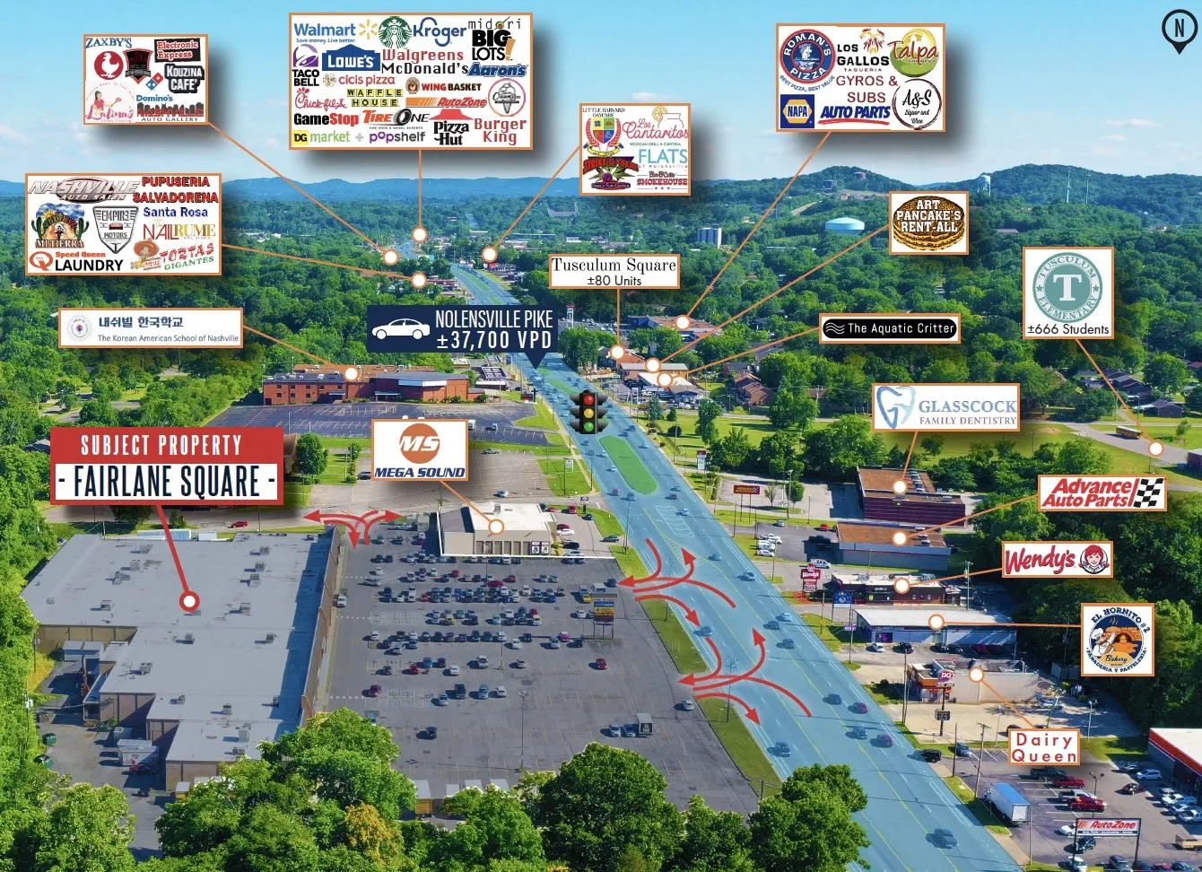 Fairlane Square offers a rarely available ±9,900 SF retail opportunity along Nolensville Pike, one of South Nashville’s most active commercial corridors with traffic counts exceeding 35,000 vehicles per day. Anchored by Planet Fitness and ThriftSmart, the center benefits from consistent daily traffic, strong storefront visibility, and prominent signage opportunities. The available suite features a flexible in-line retail layout, ample surface parking, and direct frontage along Nolensville Pike, providing convenient access for customers and tenants alike. The property serves established surrounding neighborhoods and is well positioned for a variety of retail, service, and specialty users seeking high exposure in a proven neighborhood retail location. Leasing rate is $19.95/SF/YR NNN.