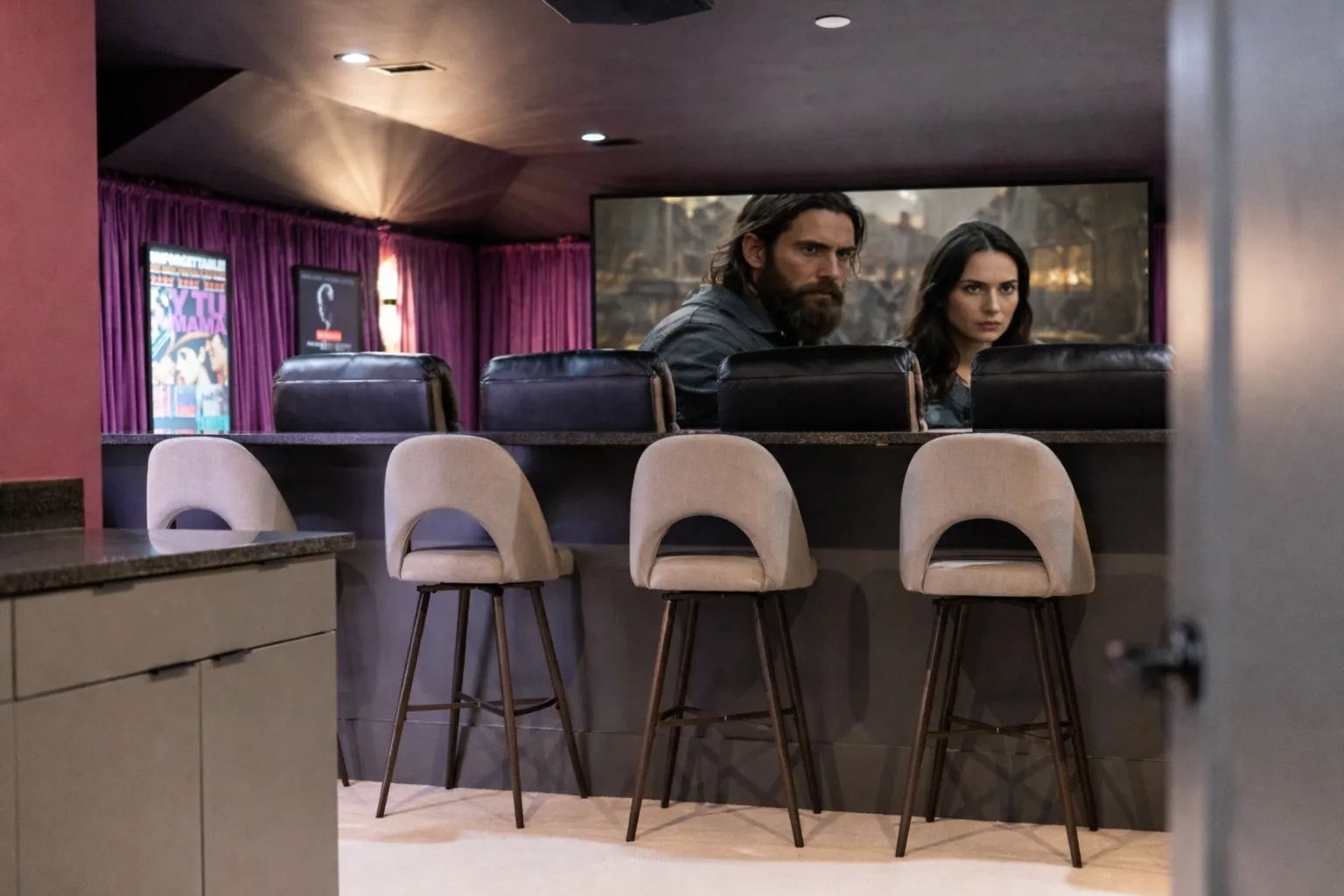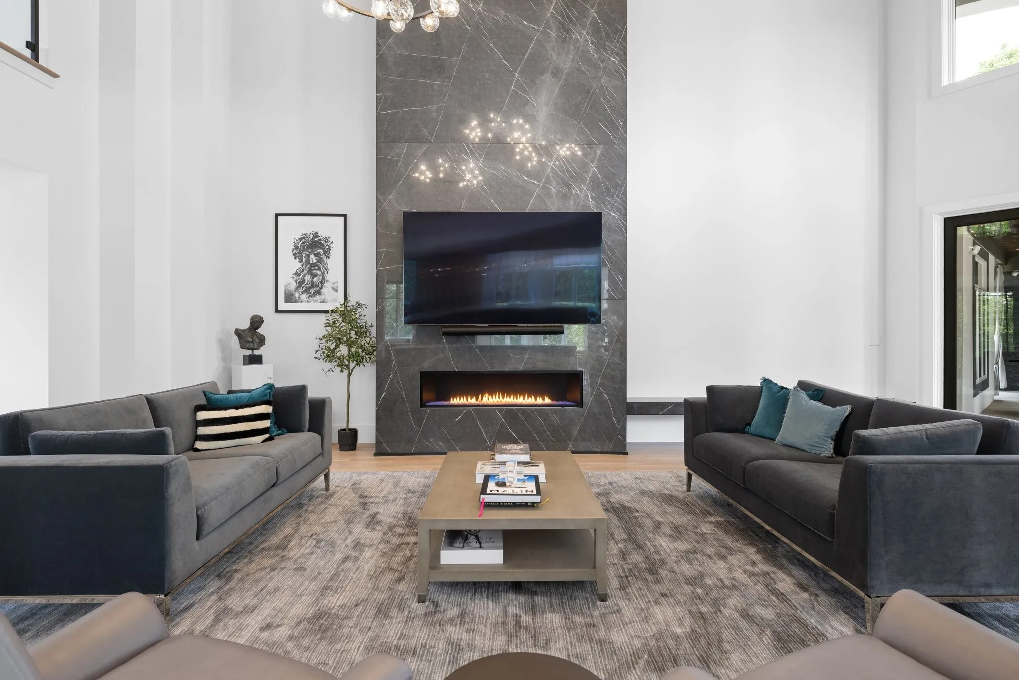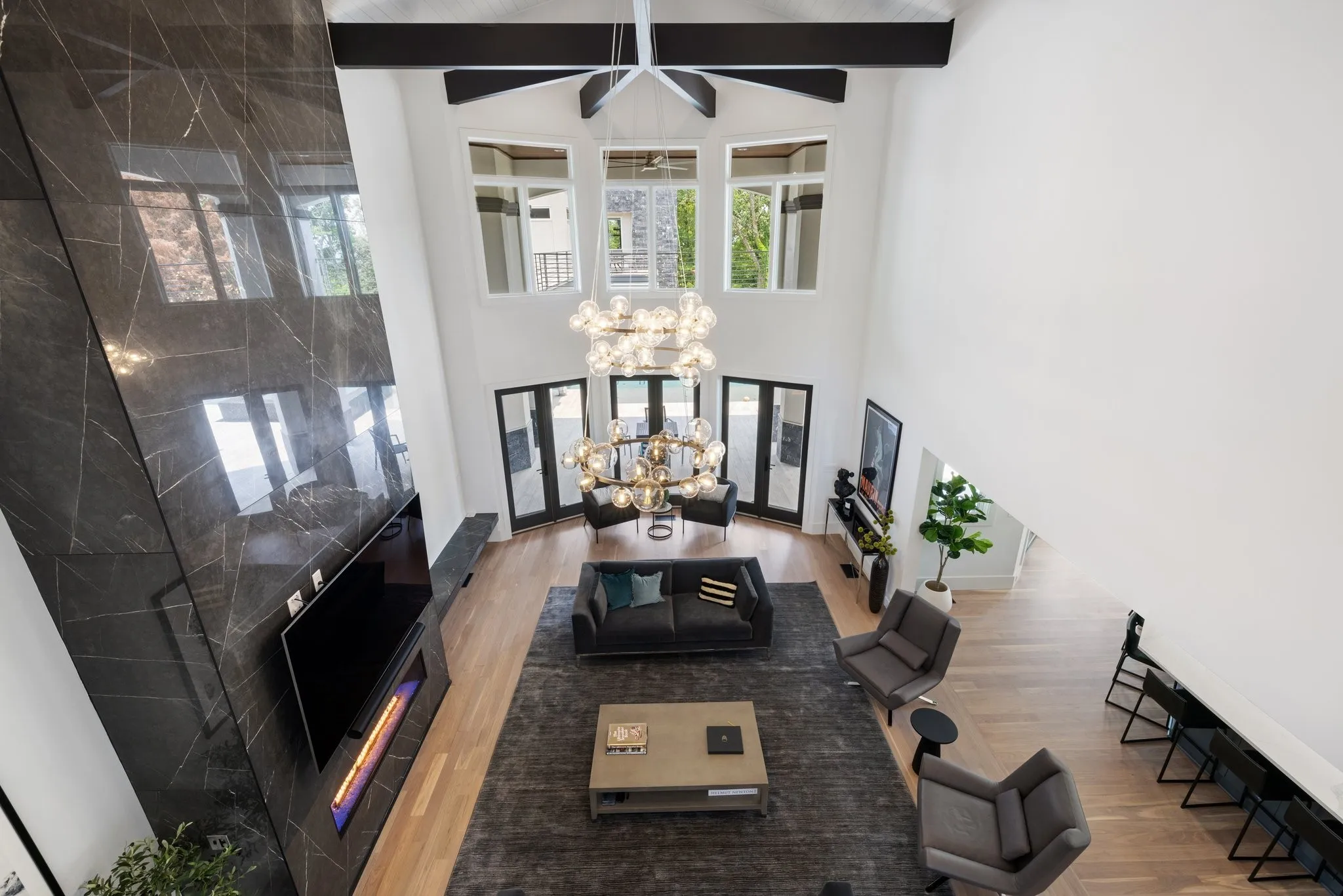 Relax and unwind in a state-of-the-art 14-seat theater, curtain-lined for an immersive experience, complete with a full kitchen and bath. The primary suite serves as a serene retreat, offering direct access to a spacious balcony overlooking the pool, a cozy gas fireplace, separate closets with a dedicated washer/dryer, a steam shower, soaking tub, Cambria marble counters, and heated floors.