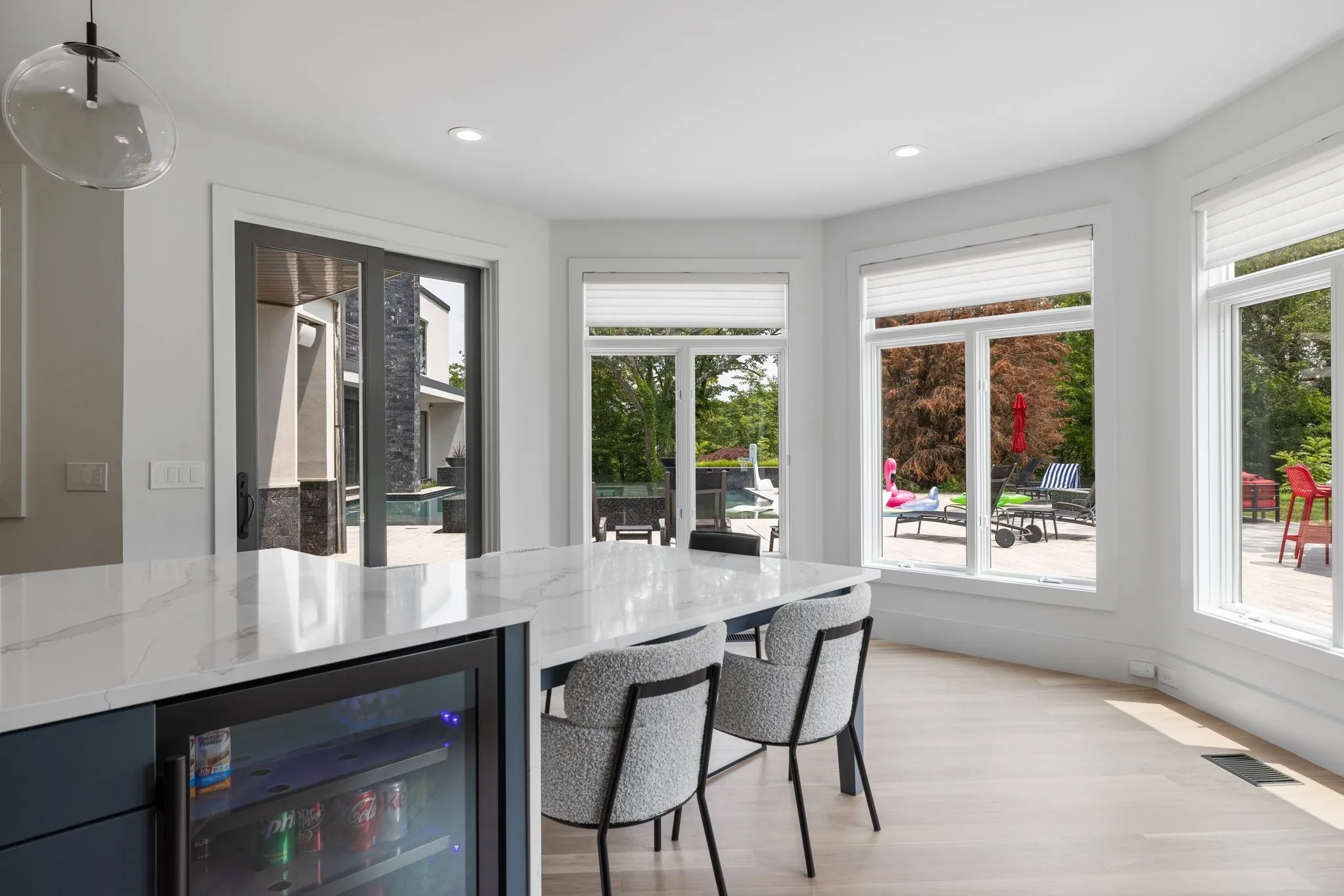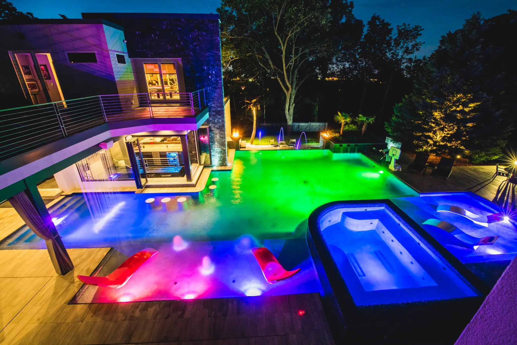 The backyard is anchored by a spectacular gunite pool and spa, featuring an infinity edge, waterfall, fire bowls, and a swim-up bar, creating a luxurious oasis. Adjacent is the incredible 2 story pool house, equipped with a full kitchen featuring Wolf/Sub Zero appliances. The first floor includes a bartender/server’s well with a corner wall that opens directly to the swim-up bar, while the second story boasts a versatile game room or gym with its own powder room.