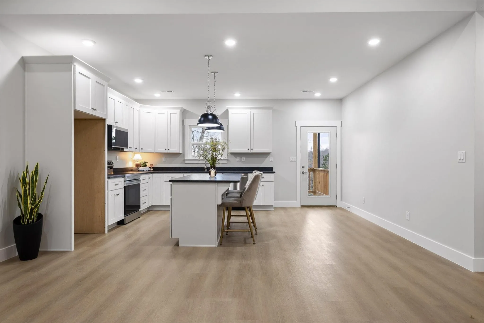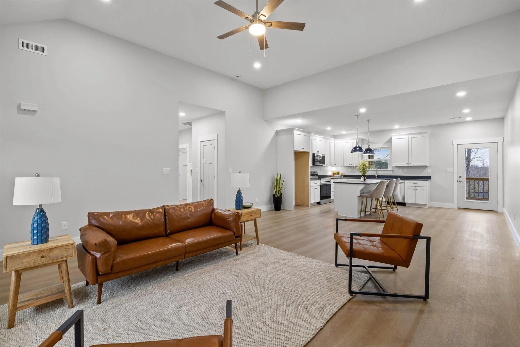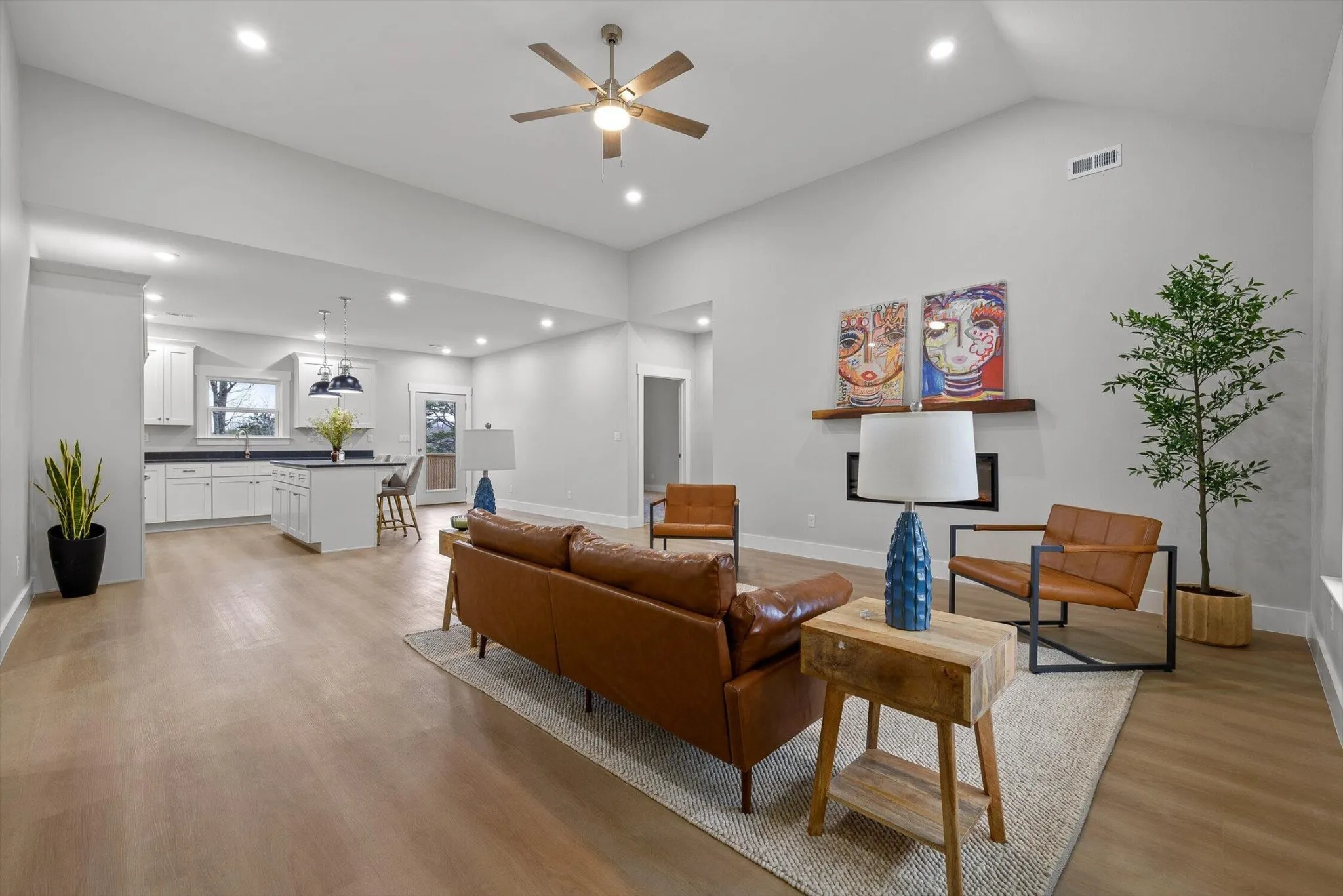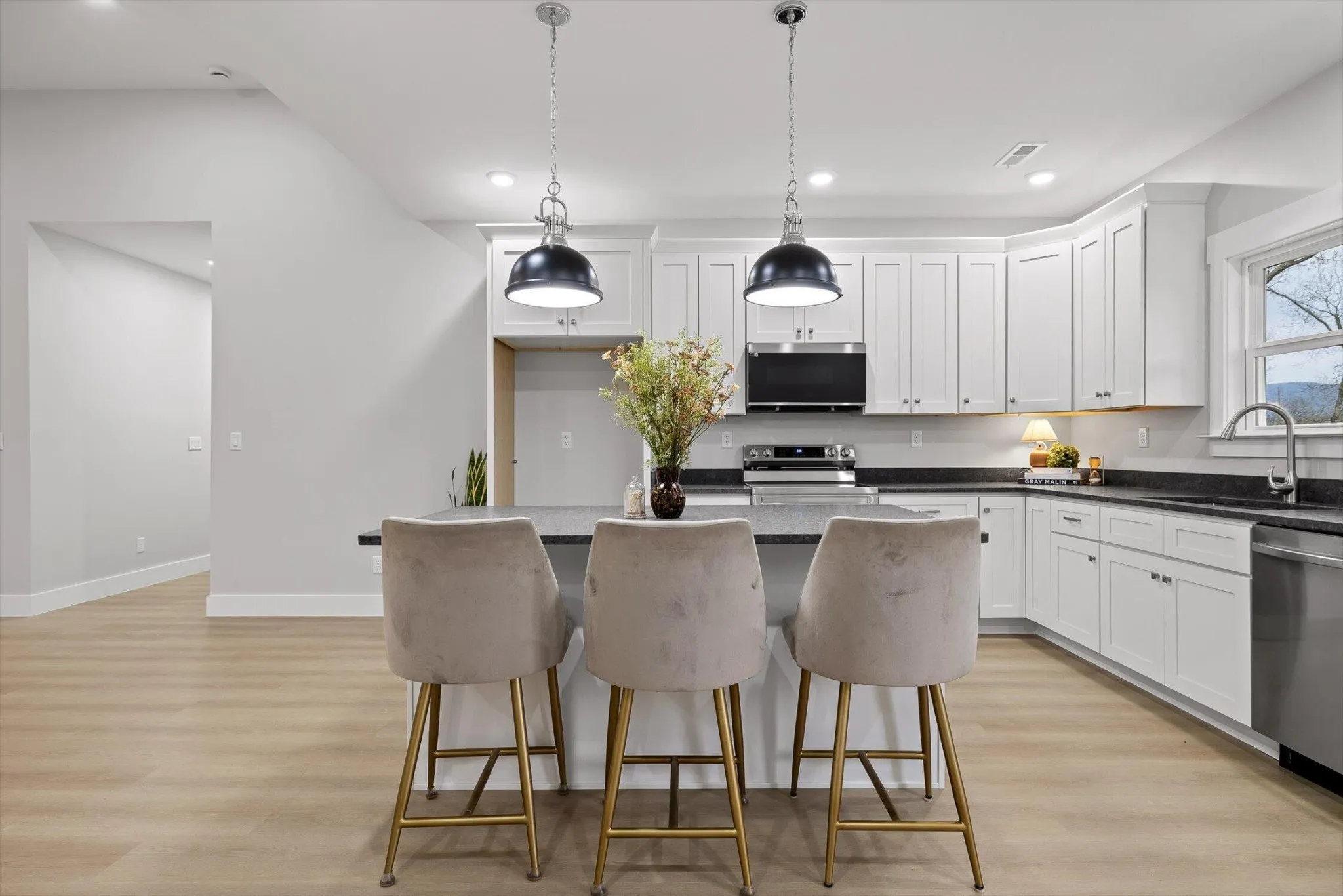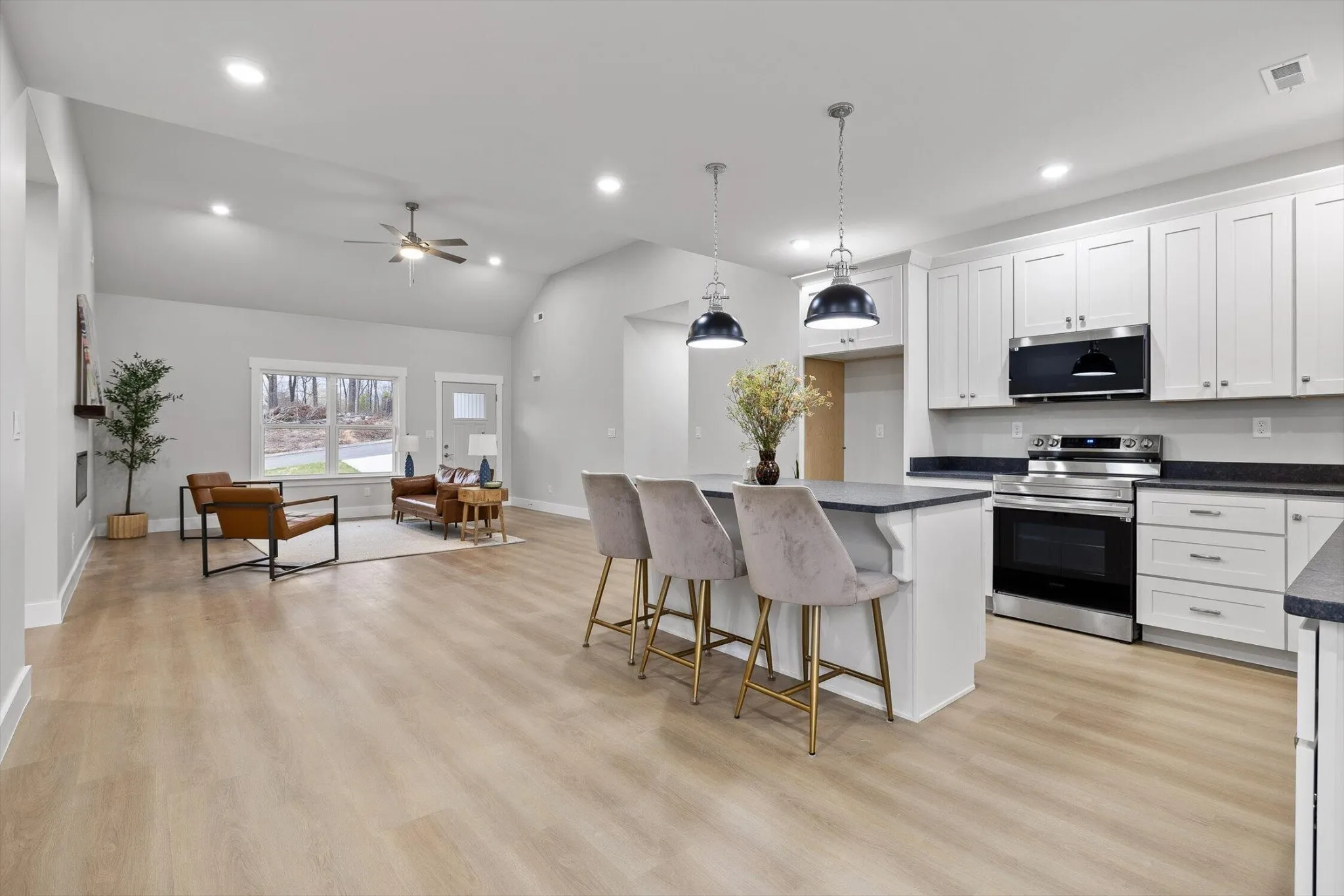The main living space is bright, open, and effortlessly inviting, with vaulted ceilings that make everything feel bigger, lighter, and more elevated. The flow into the kitchen is the chiefs kiss! Perfect for enjoying your morning coffee without missing a moment. Crisp white cabinetry, and beautiful oversized pendant lighting.