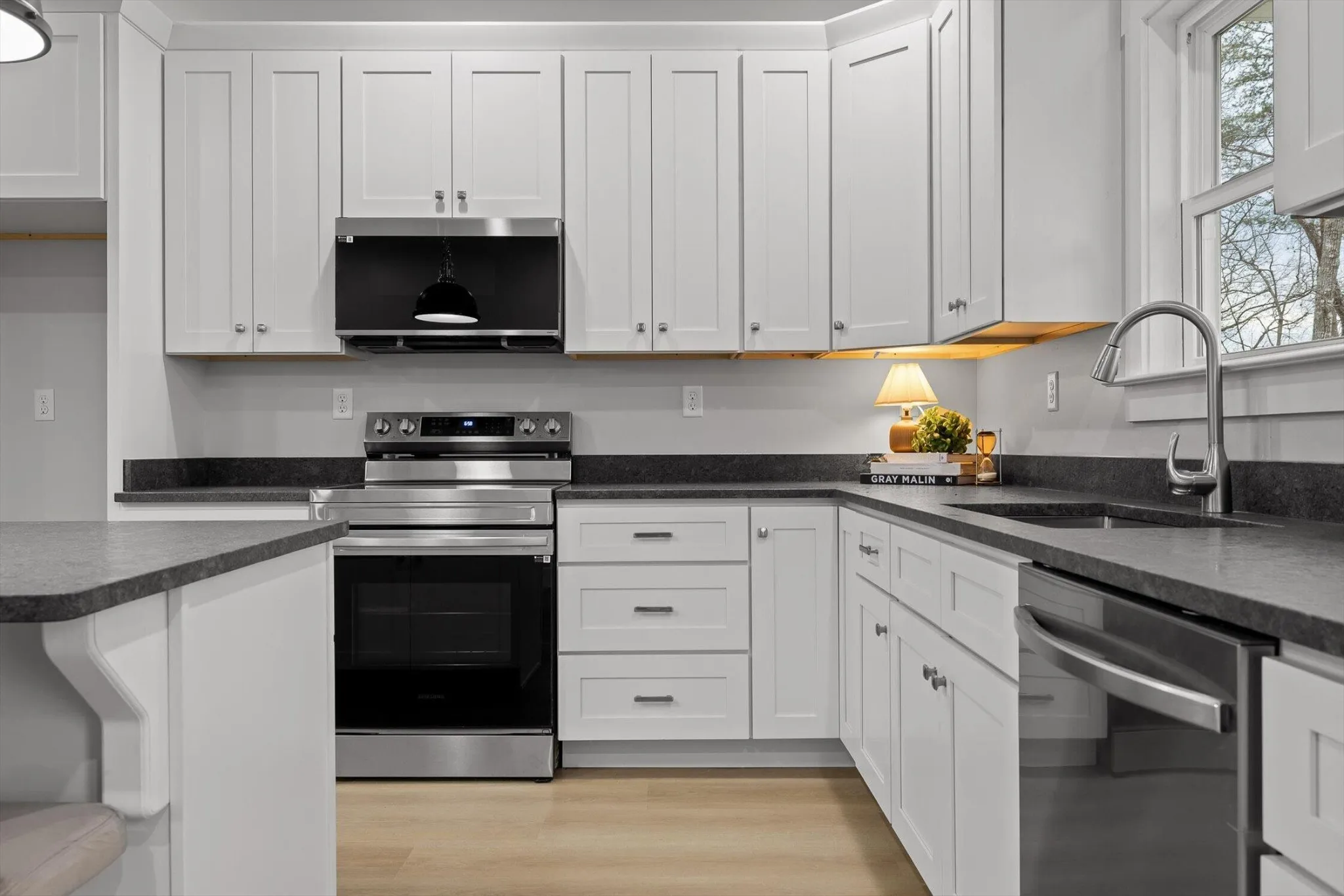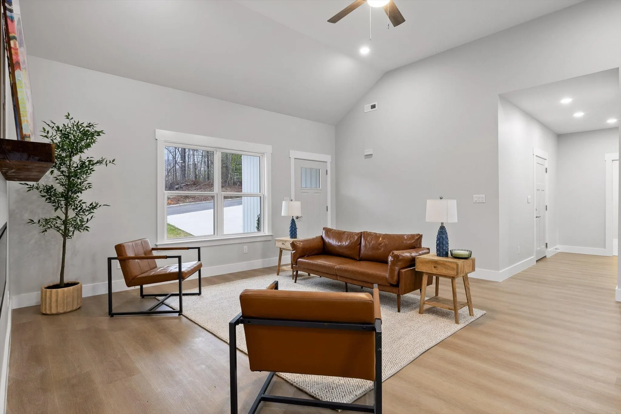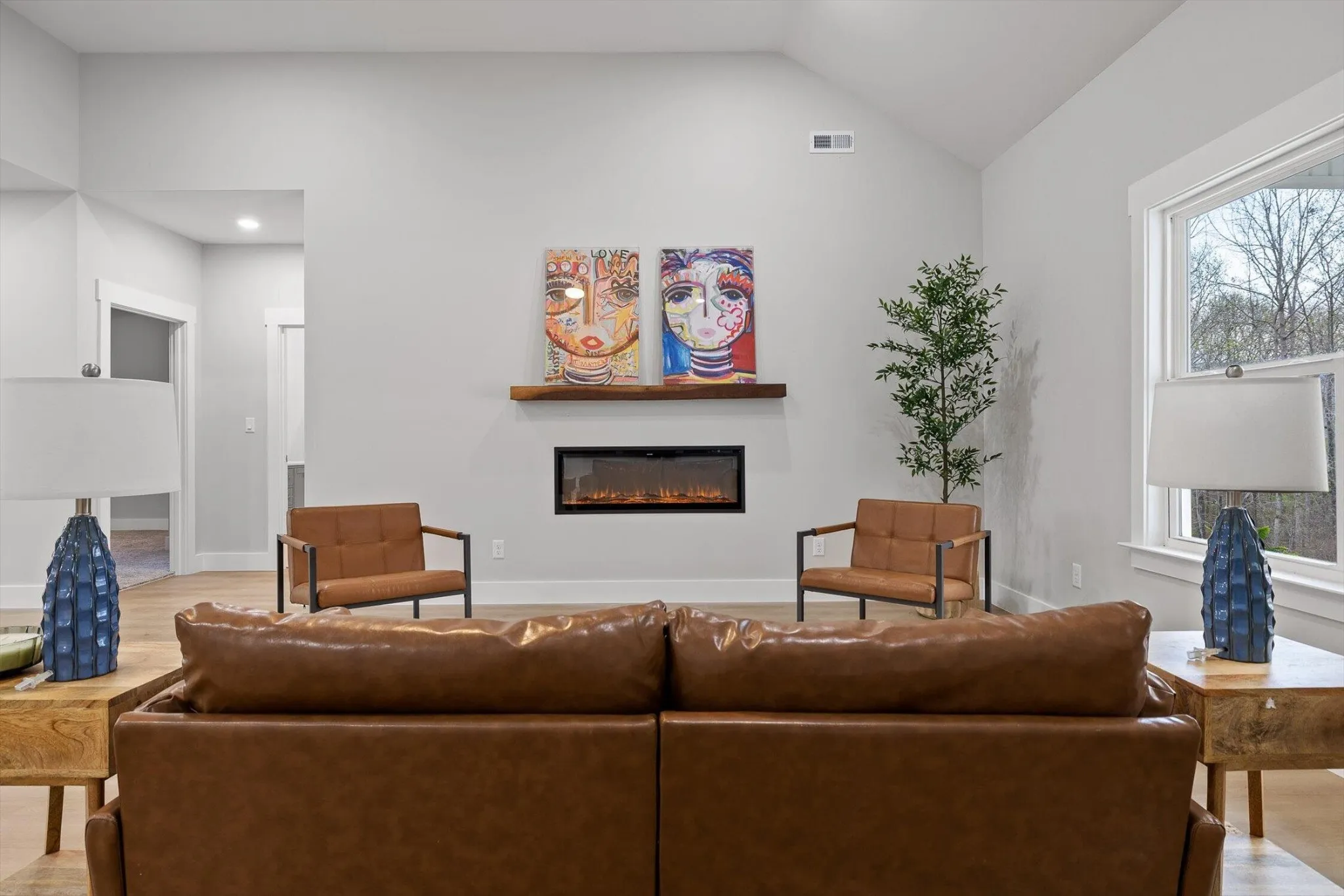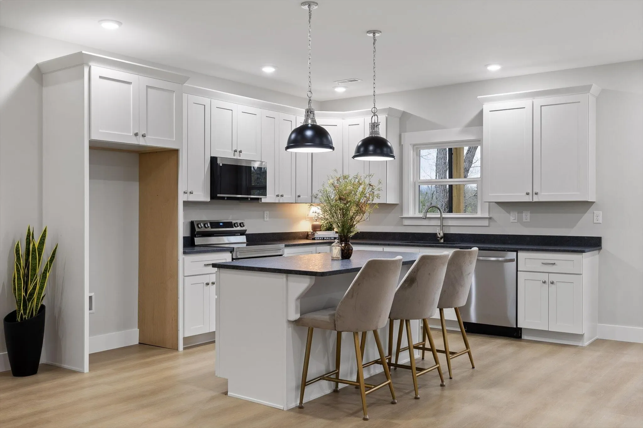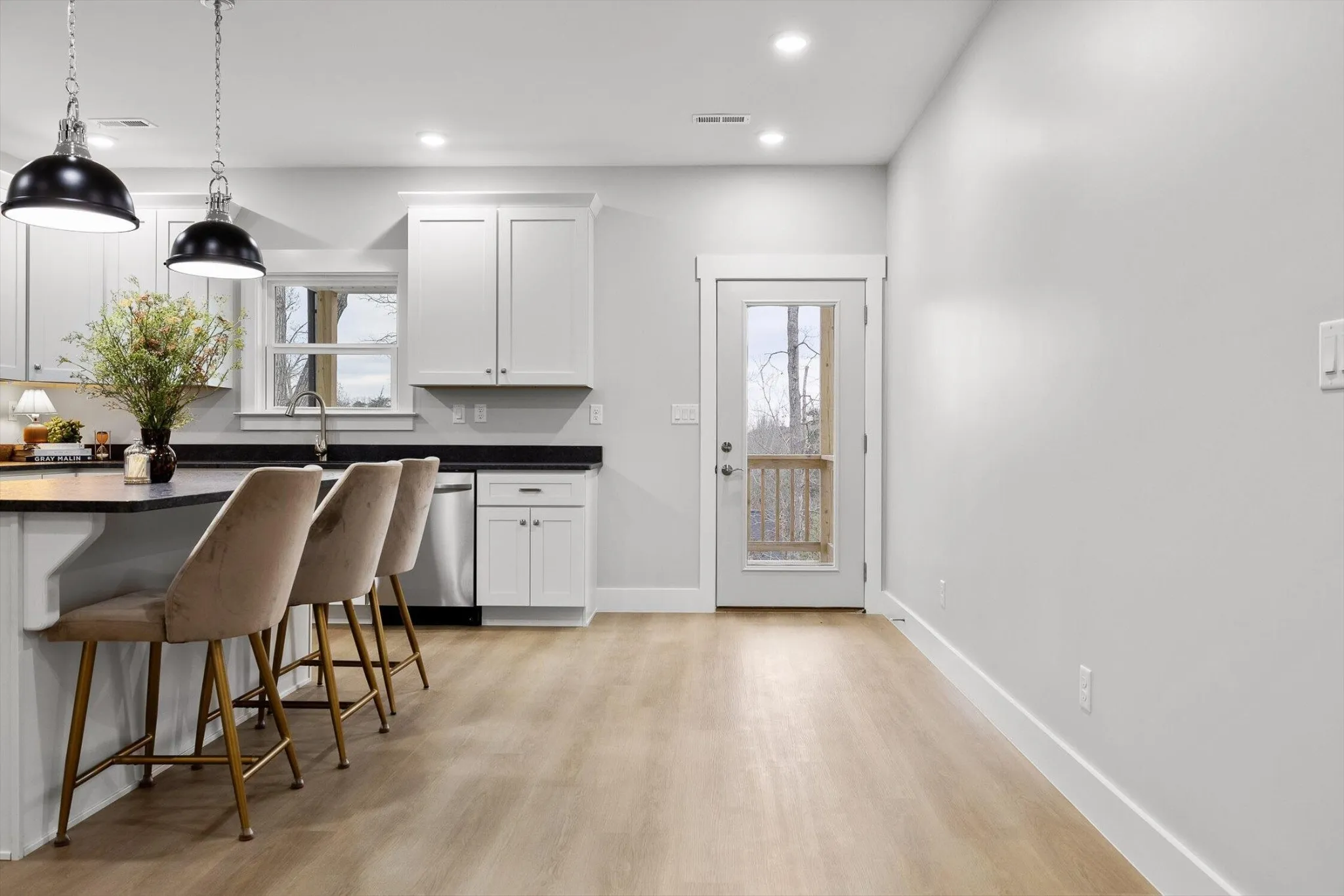 The main living space is bright, open, and effortlessly inviting, with vaulted ceilings that make everything feel bigger, lighter, and more elevated. The flow into the kitchen is the chiefs kiss! Perfect for enjoying your morning coffee without missing a moment. Crisp white cabinetry, and beautiful oversized pendant lighting.