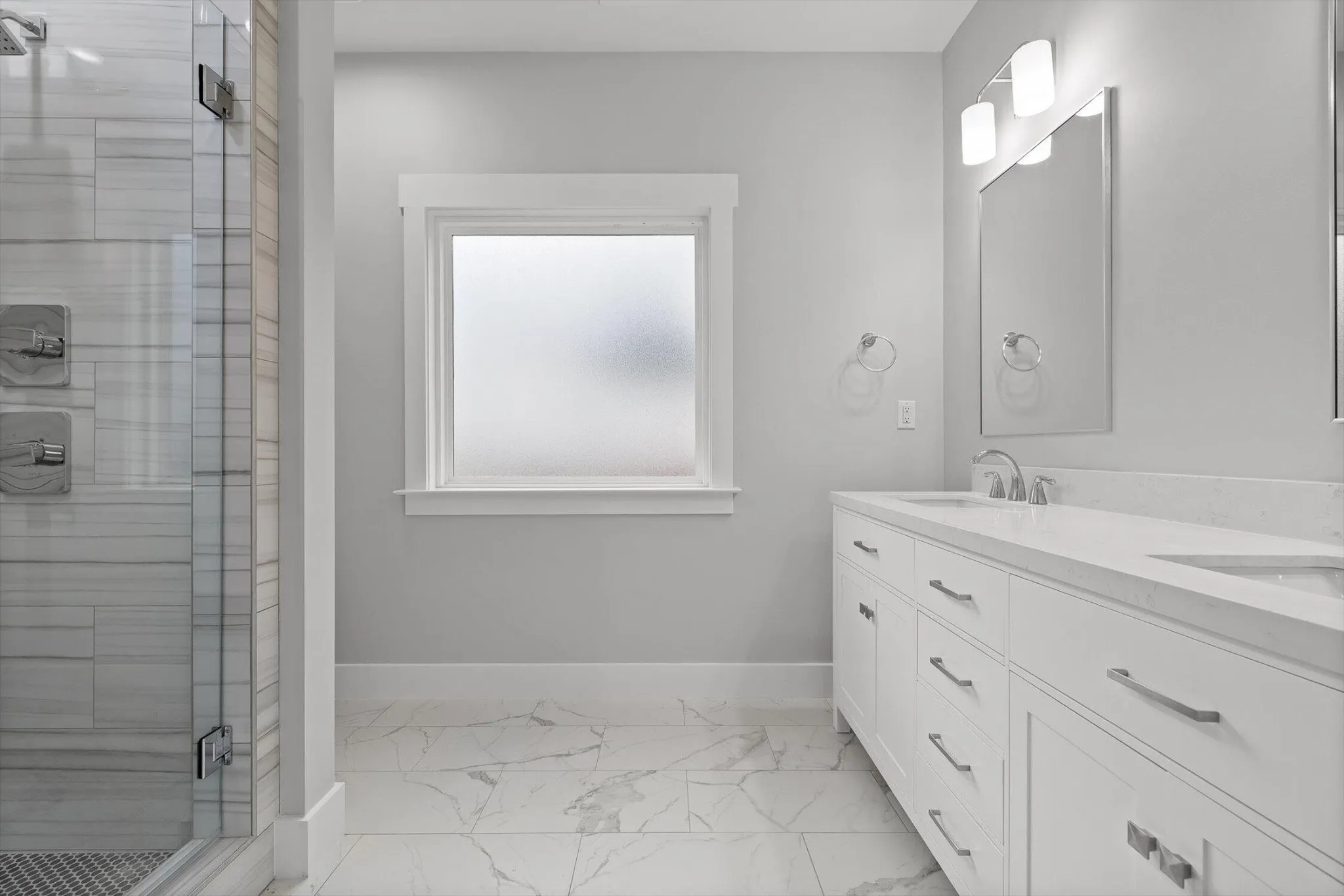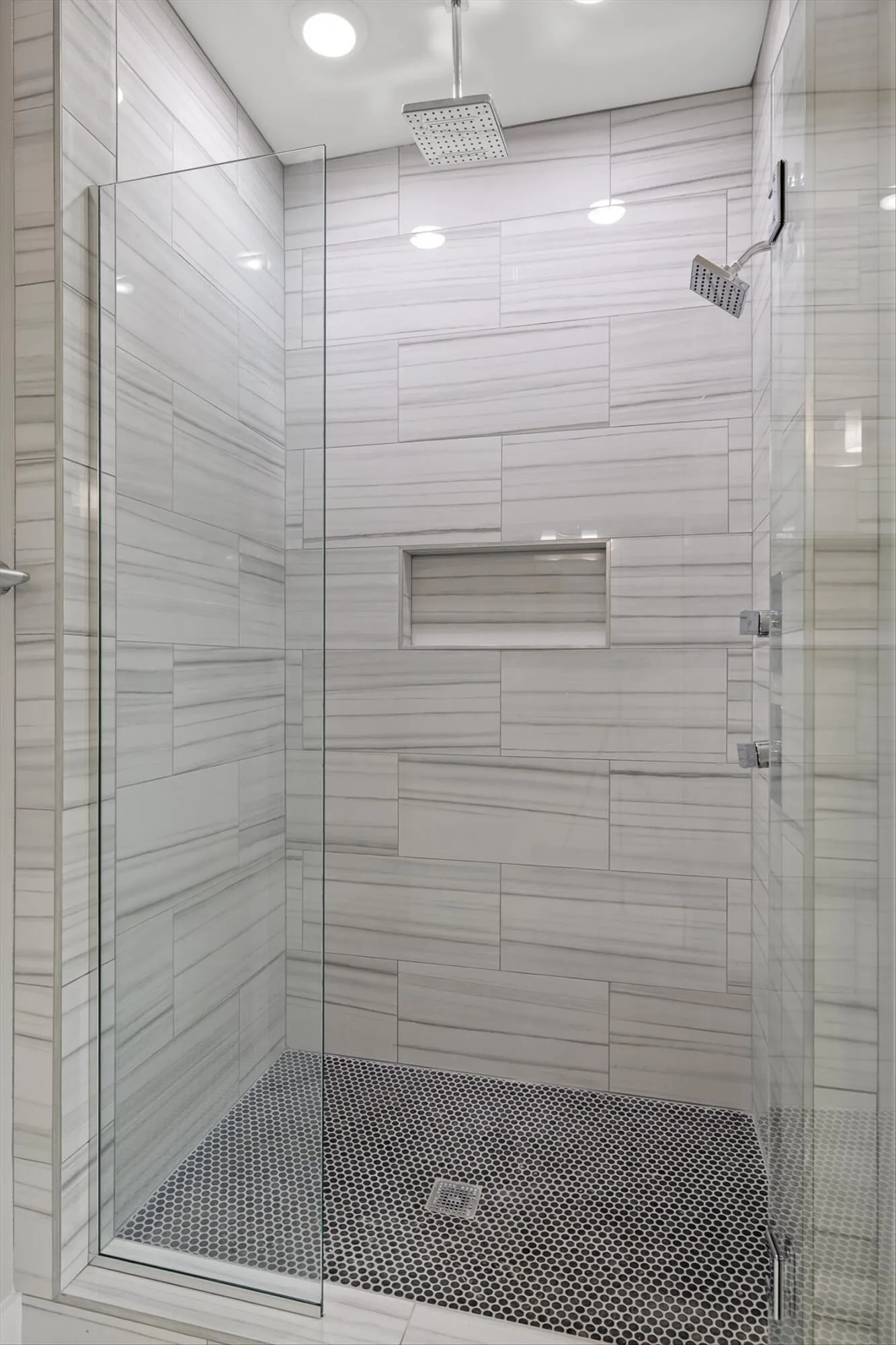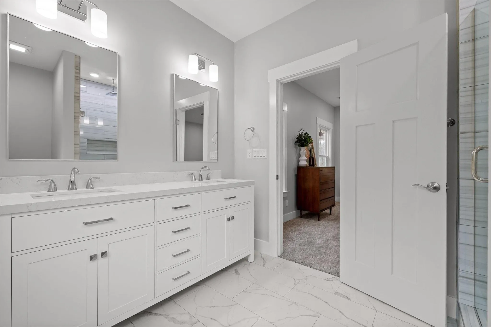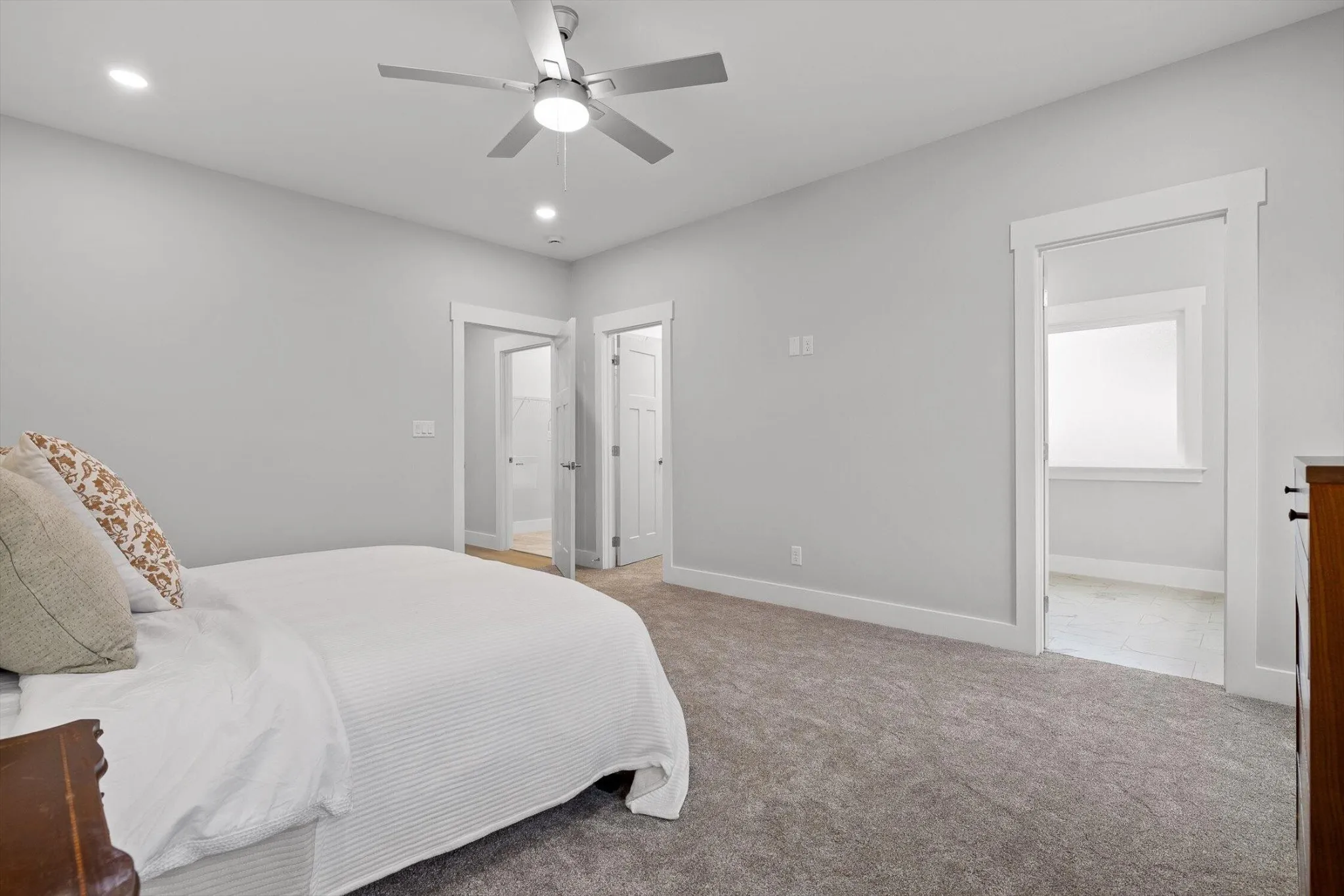 The primary suite feels like a retreat, with its grand size to the spa worthy bathroom with its waterfall shower head.