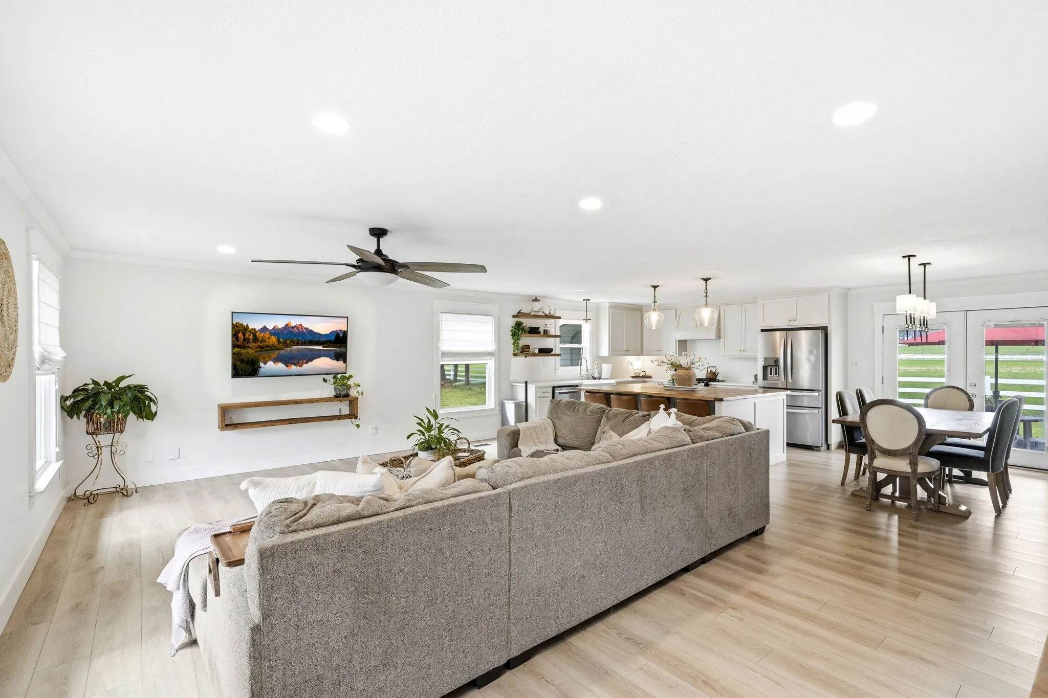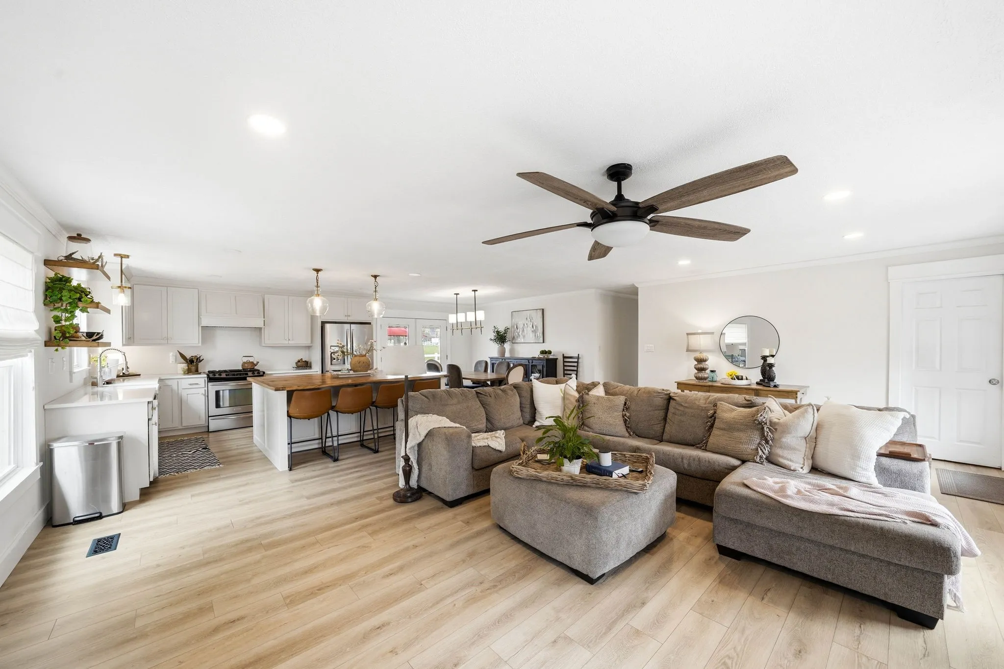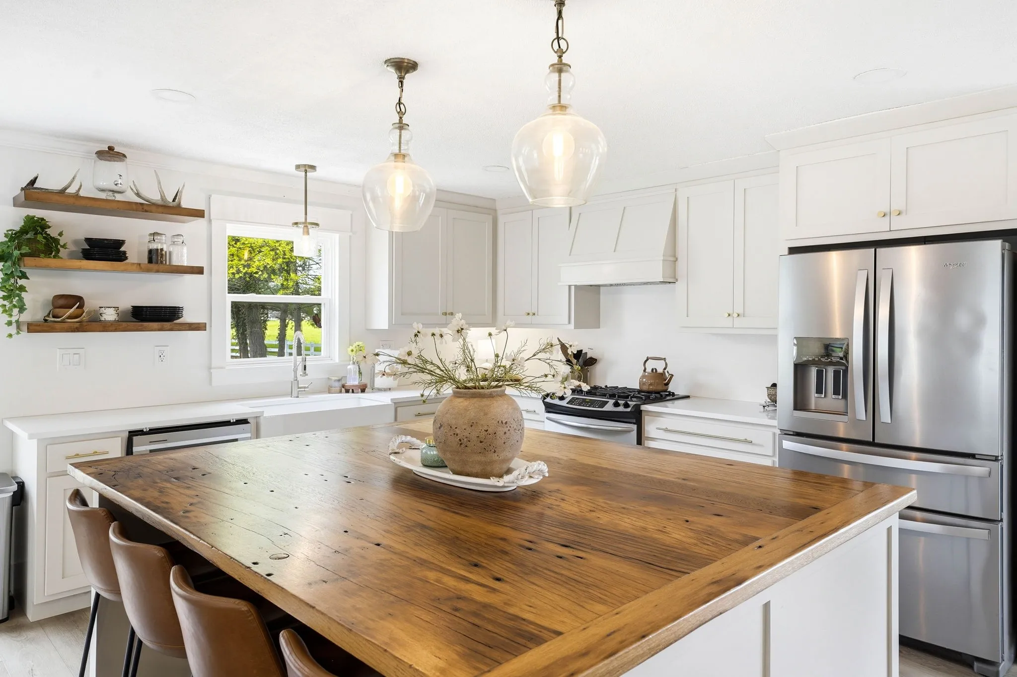 Inside, you’ll find an open floor plan designed for both everyday living and entertaining. The kitchen is the centerpiece of the home, featuring custom cabinetry, quartz countertops, stainless steel appliances, a gas range, and a stunning oversized island topped with reclaimed oak barn threshing flooring. Thoughtful details like soft-close cabinets, Pottery Barn lighting, and updated fixtures add a touch of elevated style throughout.