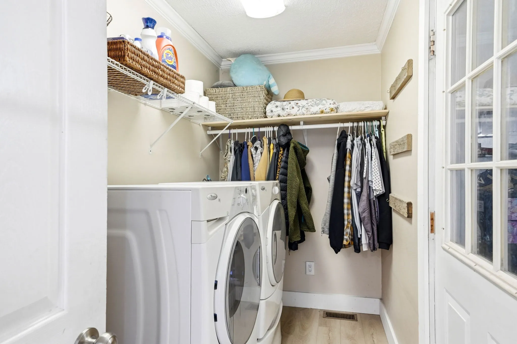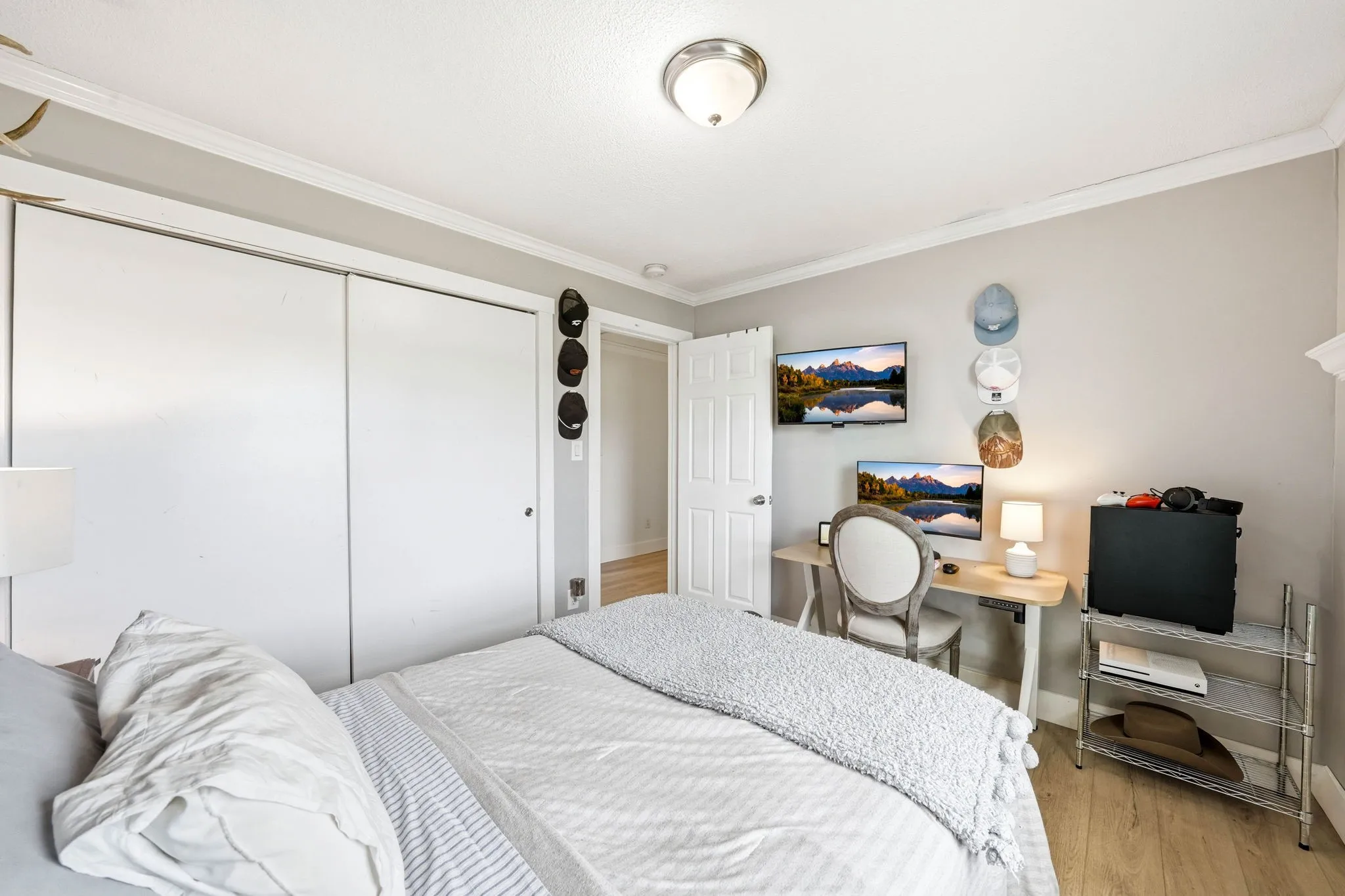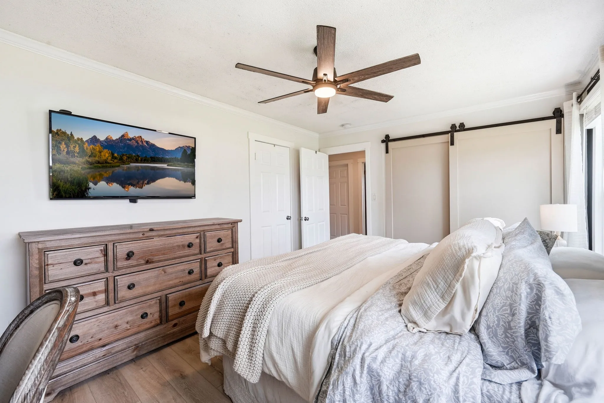 Inside, you’ll find an open floor plan designed for both everyday living and entertaining. The kitchen is the centerpiece of the home, featuring custom cabinetry, quartz countertops, stainless steel appliances, a gas range, and a stunning oversized island topped with reclaimed oak barn threshing flooring. Thoughtful details like soft-close cabinets, Pottery Barn lighting, and updated fixtures add a touch of elevated style throughout.
