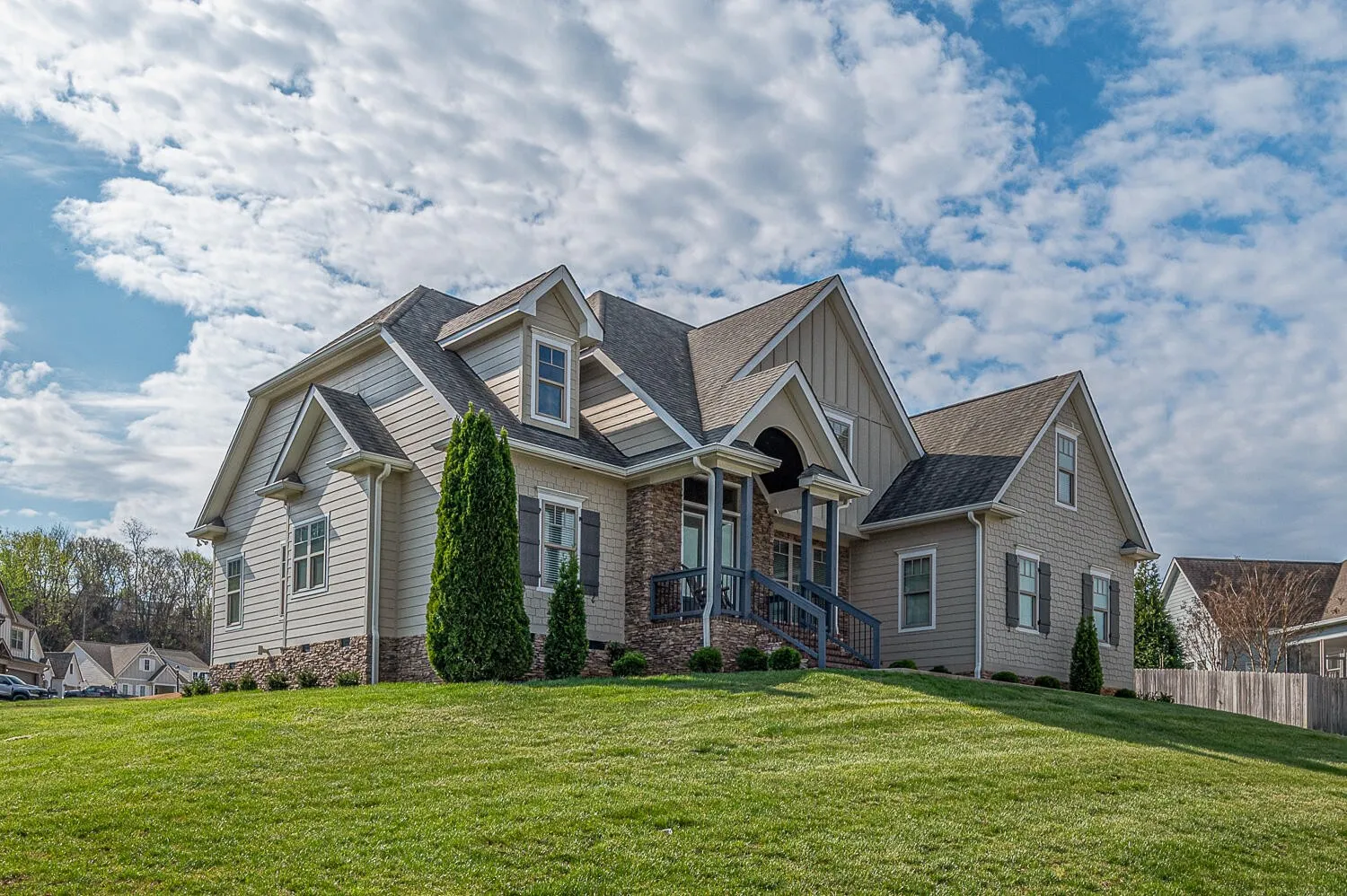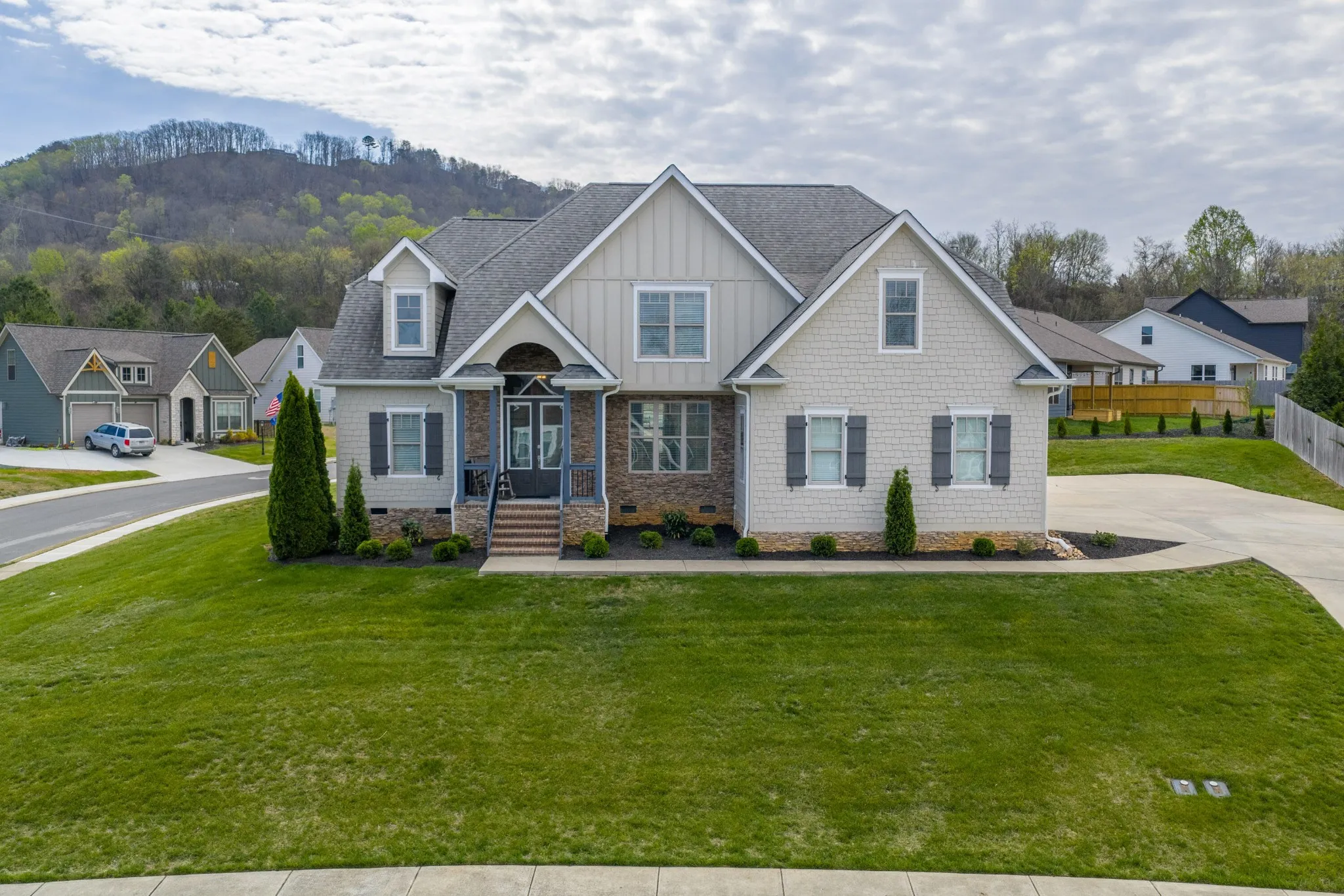 Outdoor living is just as inviting, with a covered front porch, covered side porch, and an open stamped concrete patio ideal for grilling and relaxing. A two-car garage and scenic views of White Oak Mountain complete this exceptional property.