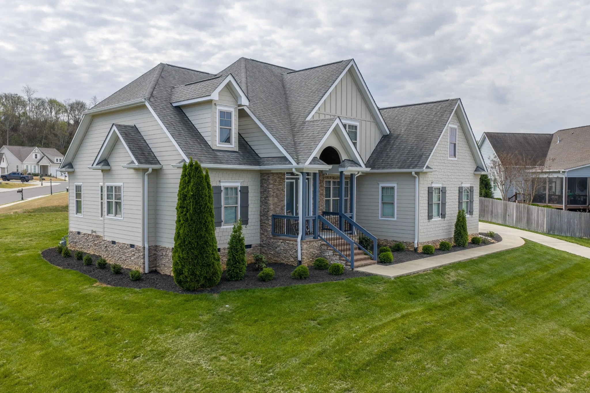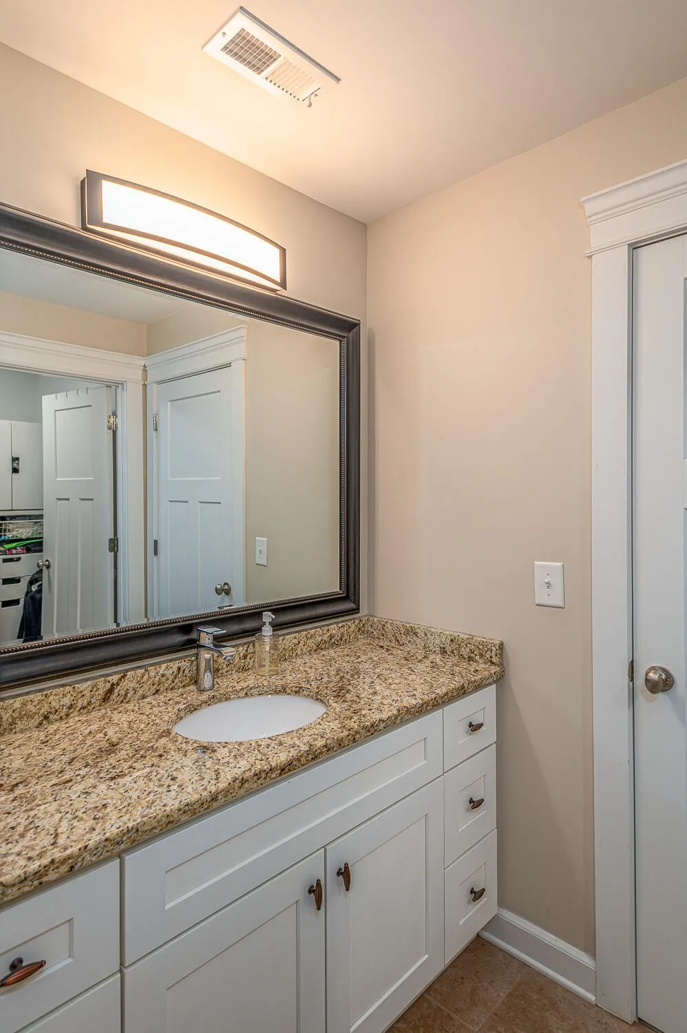 The main-level primary suite is a true retreat, showcasing a vaulted ceiling and a luxurious en suite bath with dual granite vanities, a soaking tub, tiled shower, private water closet, and a generously sized walk-in closet. An additional bedroom and full bath on the main level provide flexibility for guests or a home office. You’ll also find a well-appointed laundry room with a sink, cabinetry, and access to the side porch, along with a convenient drop zone at the garage entry.
