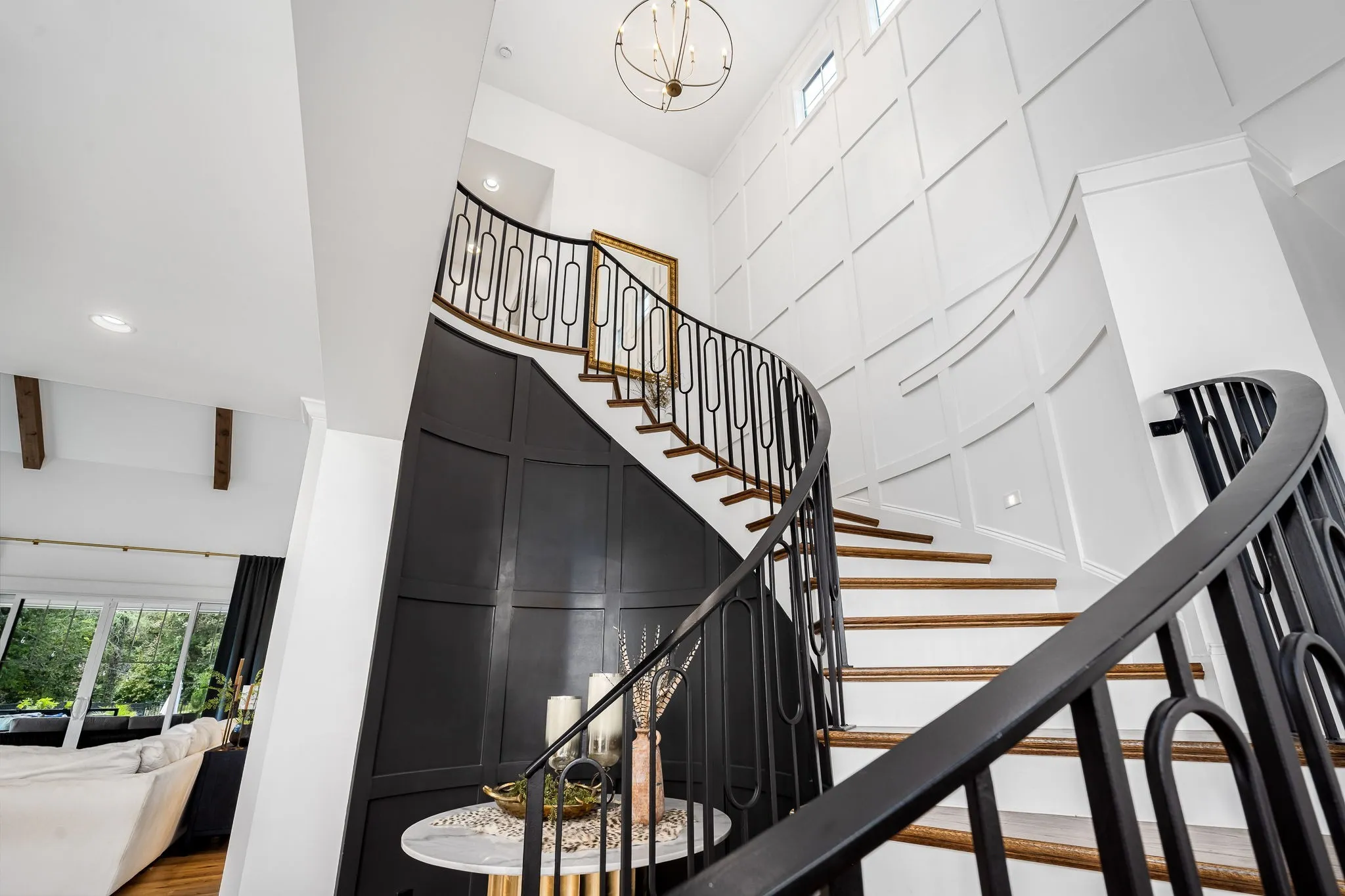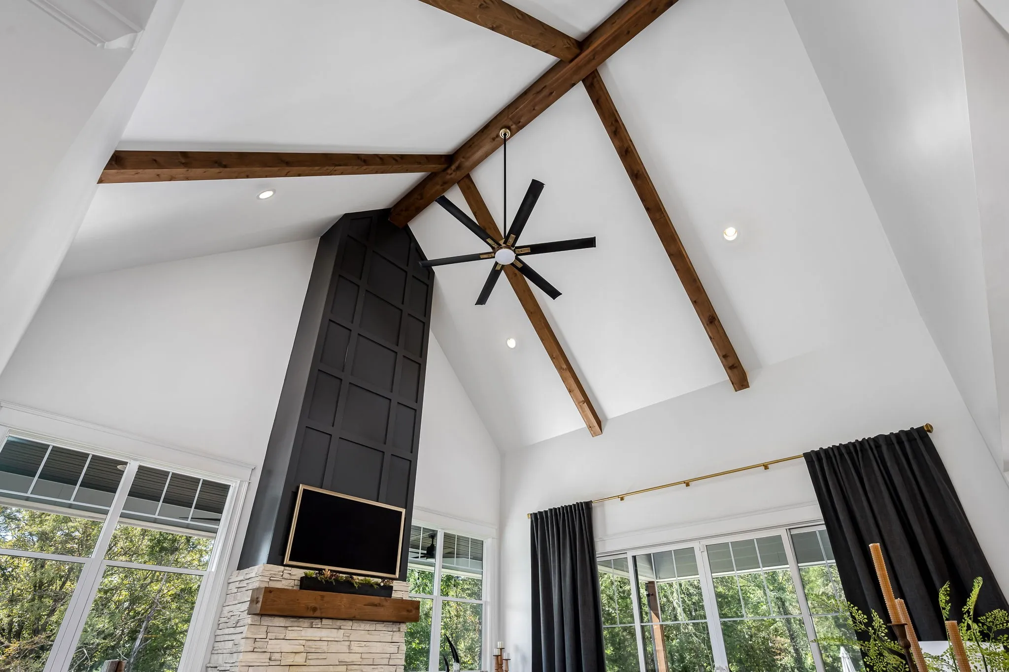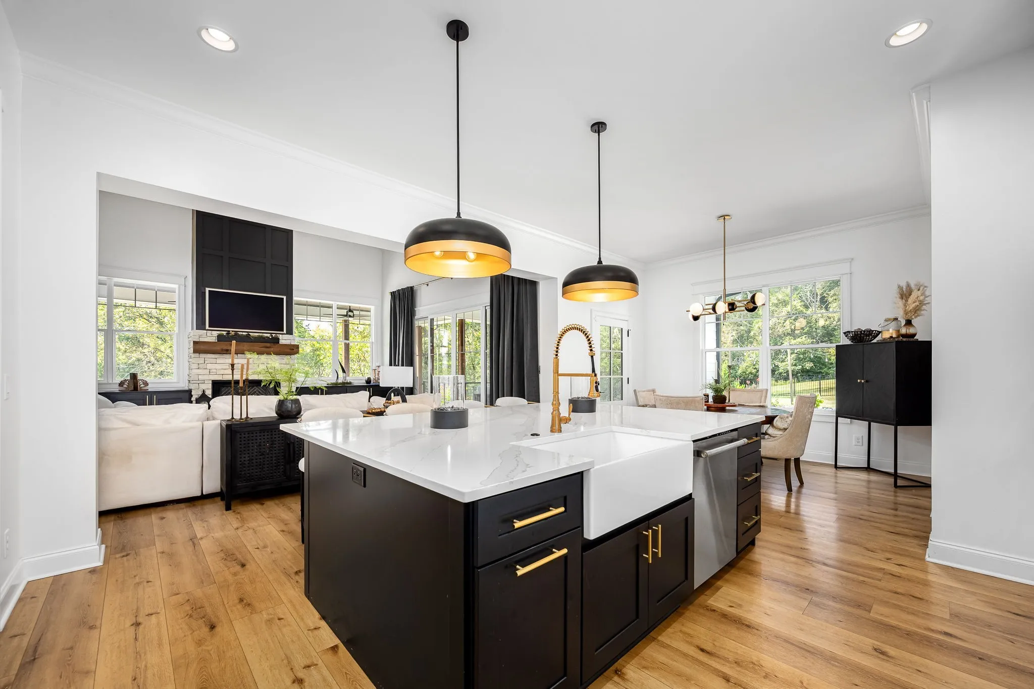 The chef’s kitchen features GE Monogram smart appliances, quartz countertops, and a generous island for gathering. Vaulted ceilings, designer lighting, custom closets, and premium craftsmanship elevate every space.