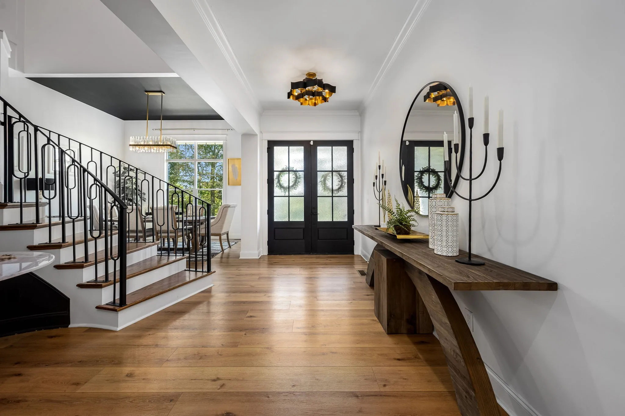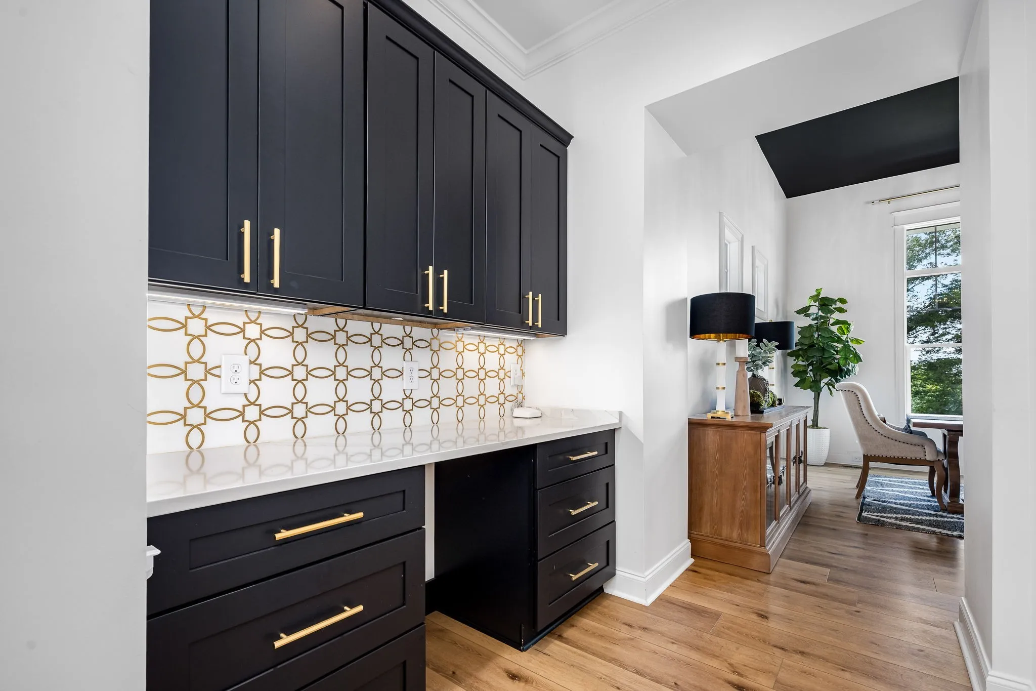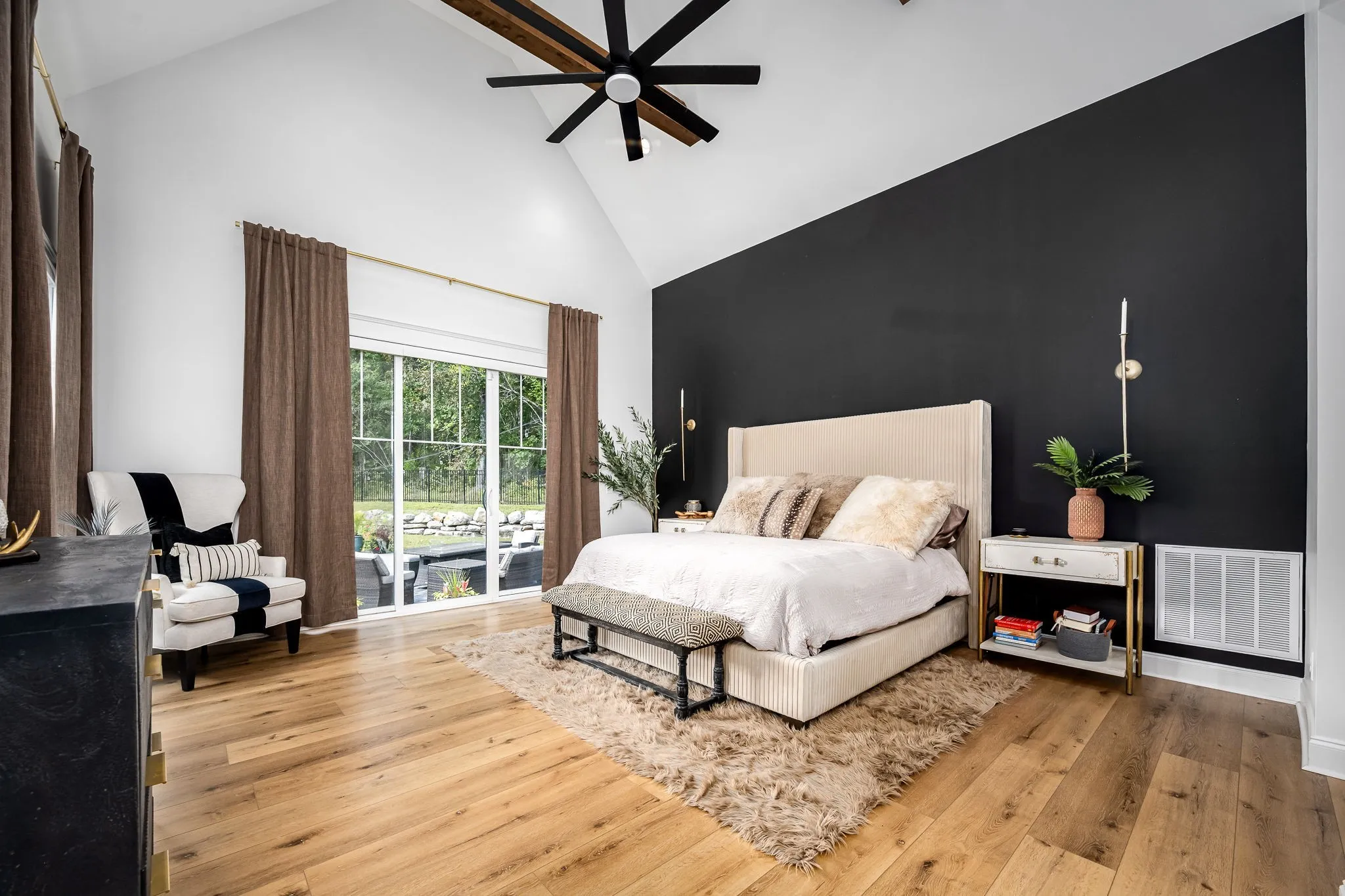 The chef’s kitchen features GE Monogram smart appliances, quartz countertops, and a generous island for gathering. Vaulted ceilings, designer lighting, custom closets, and premium craftsmanship elevate every space.