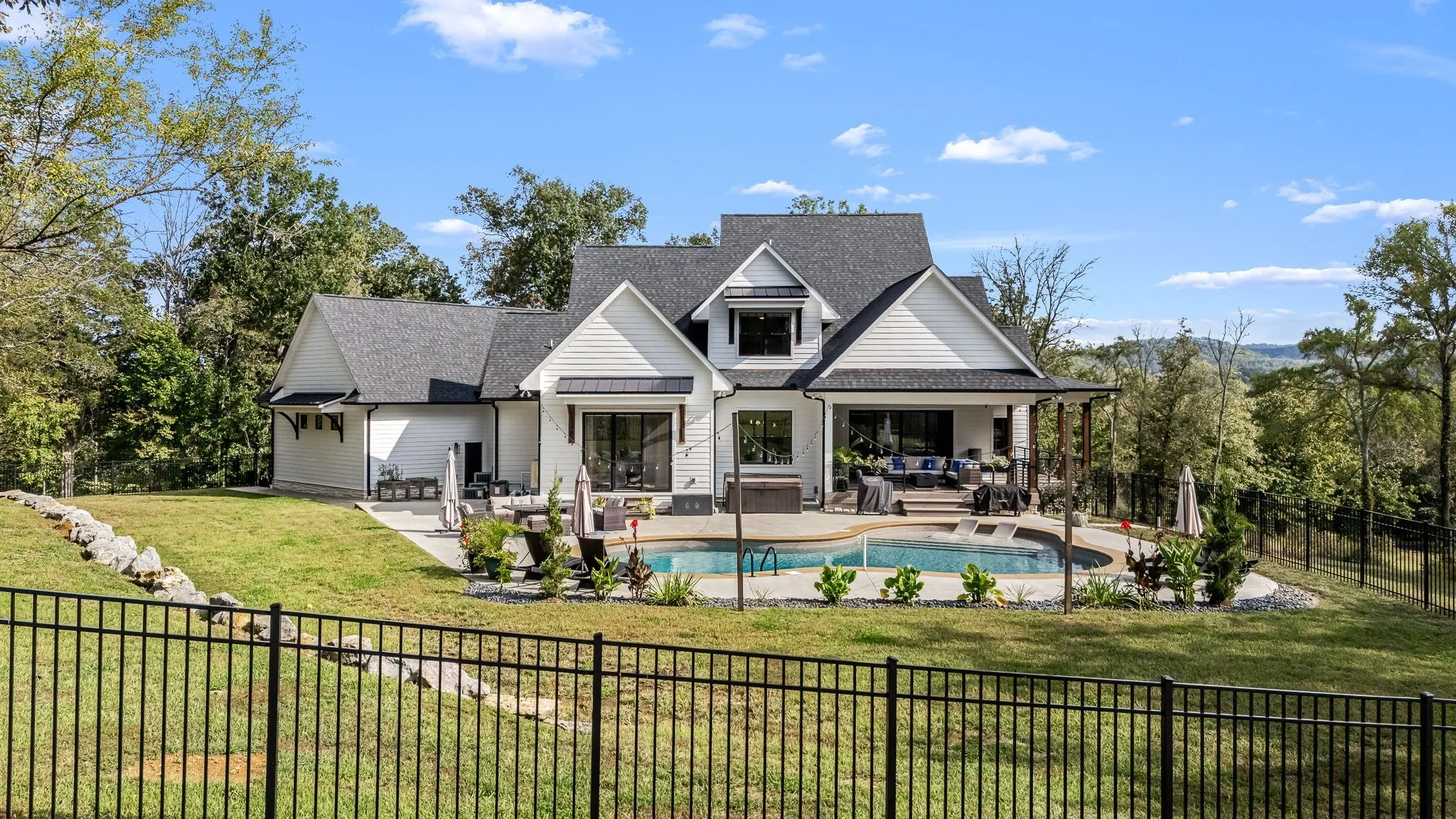 Indoor-outdoor living shines with dual front porches, a wraparound Trex deck, and a heated saltwater pool with tanning ledge and lounge area—perfect for entertaining or relaxing in total privacy.