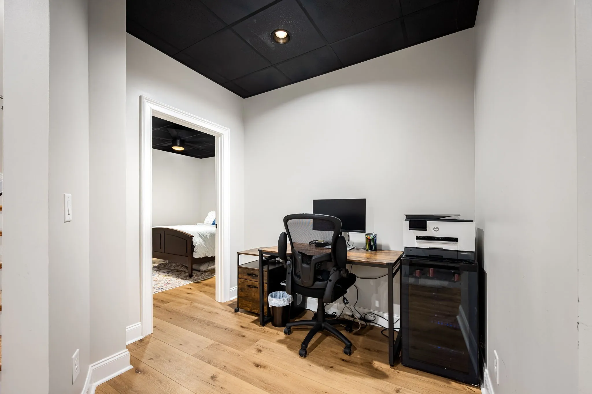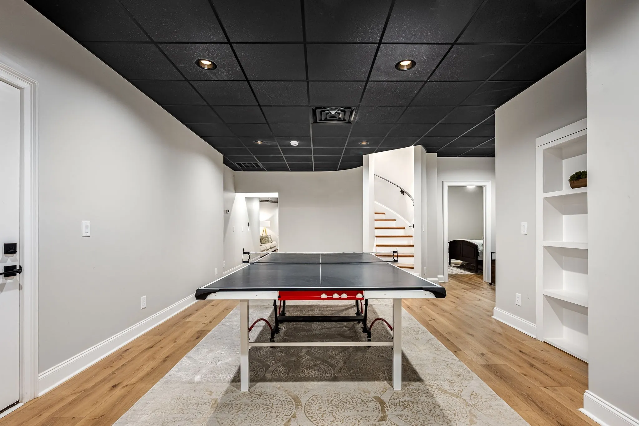 The finished concrete-wall basement offers a separate living area, game room, a hidden Murphy-door room, and a flex space—ideal for a home office, studio, or guest suite.