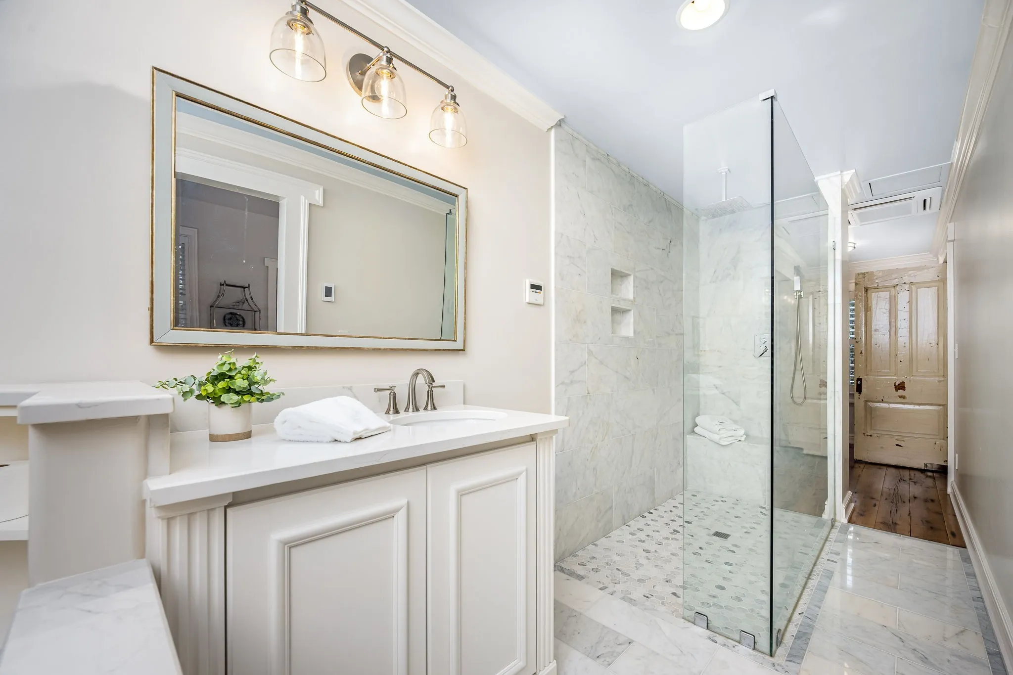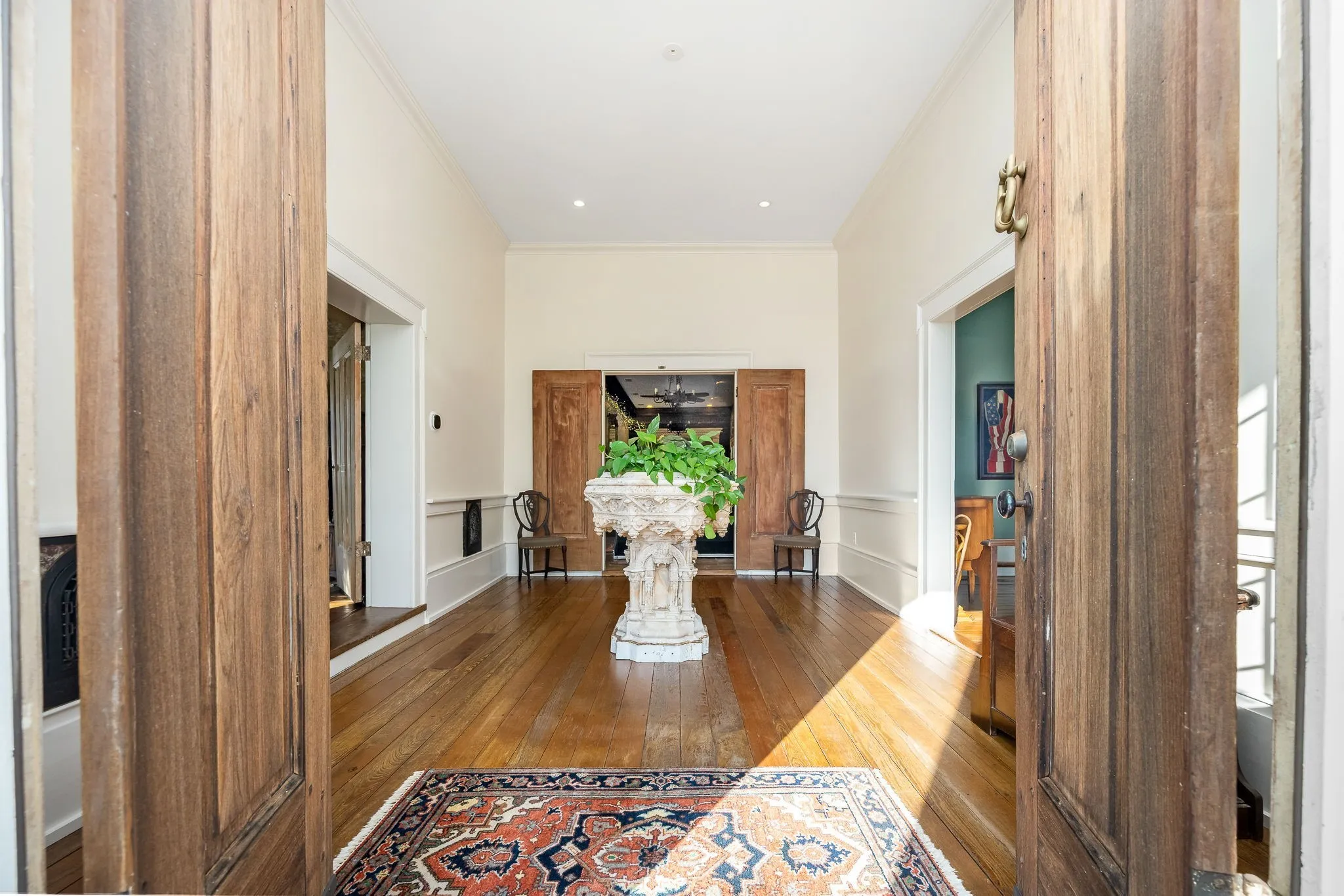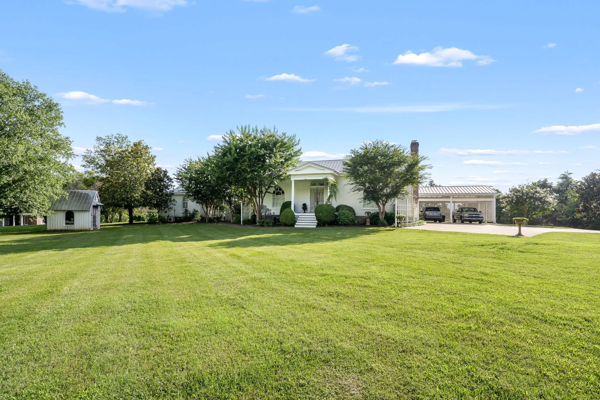 Step into timeless elegance! Fully restored 1831 Greek Revival Estate situated on about 4.39 acres of lushly landscaped grounds enhanced with irrigation system and outdoor moonlighting. The main house offers 2 bedrooms and 2 baths. Offering beautiful details from gracious foyer and original log den with fireplace. Chef’s kitchen, complete with marble countertops, large center island, and new gas stove is perfect for entertaining. Primary Suite offers gas fireplace, plantation shutters, & custom closets. Luxurious bath with gas fireplace, jetted tub, separate vanities, and walk in shower. Yoga studio above the bath adds wellness and relaxation. Magnificent dining hall opens via exquisite French doors to a New Orleans inspired courtyard. The guest house consists of fabulous bedroom and bath offers privacy and comfort for visitors which is approx. 672 sq ft featuring Chestnut Floors, new ductless HVAC. Encapsulated crawlspace with two commercial dehumidifiers. Main house & guest house are serviced with on demand water heaters. Minutes to downtown square and easy access to I-65. Conveniently located within 45-50 minutes to Franklin & Huntsville. This luxury estate combines convenience, sophistication, and historic charm. An exceptional opportunity for discerning buyers. Barn and potting shed also featured.