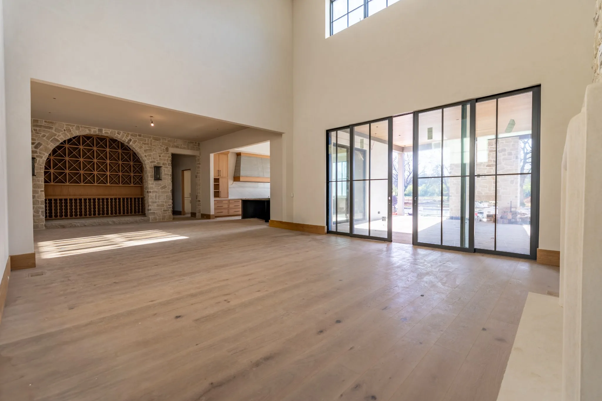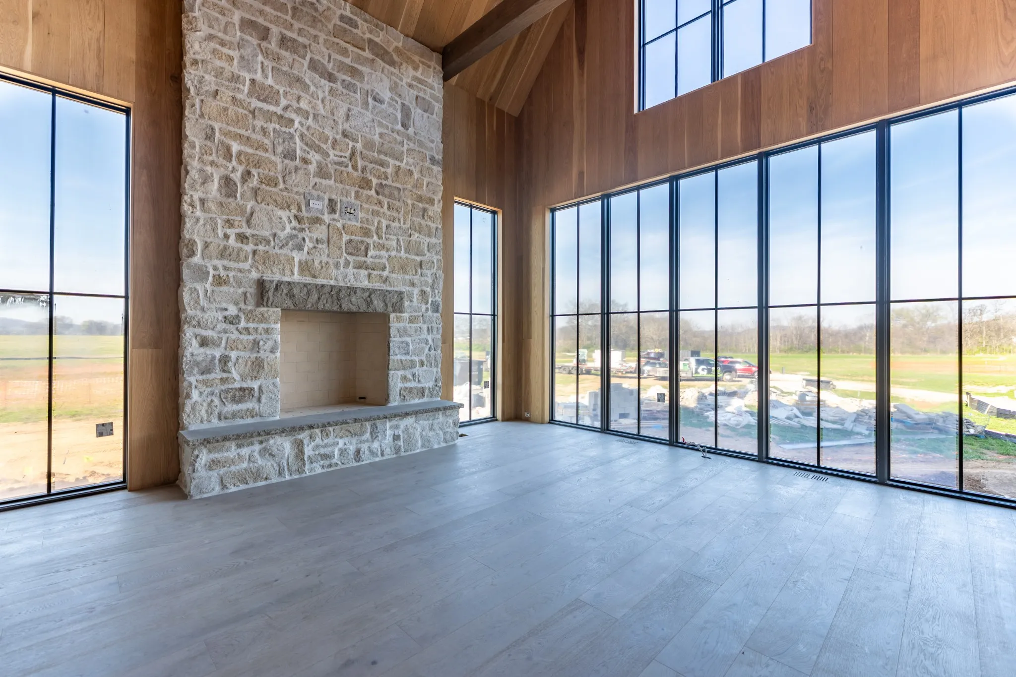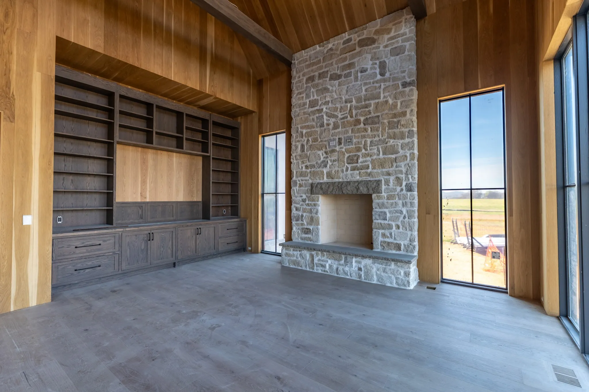 Inside, expansive living spaces are defined by soaring ceilings, dramatic windows, and a seamless indoor-outdoor connection. The great room anchors the home with a statement stone fireplace and opens effortlessly to the outdoor living spaces, where a resort-style pool and thoughtfully designed hardscape create a true extension of the home.