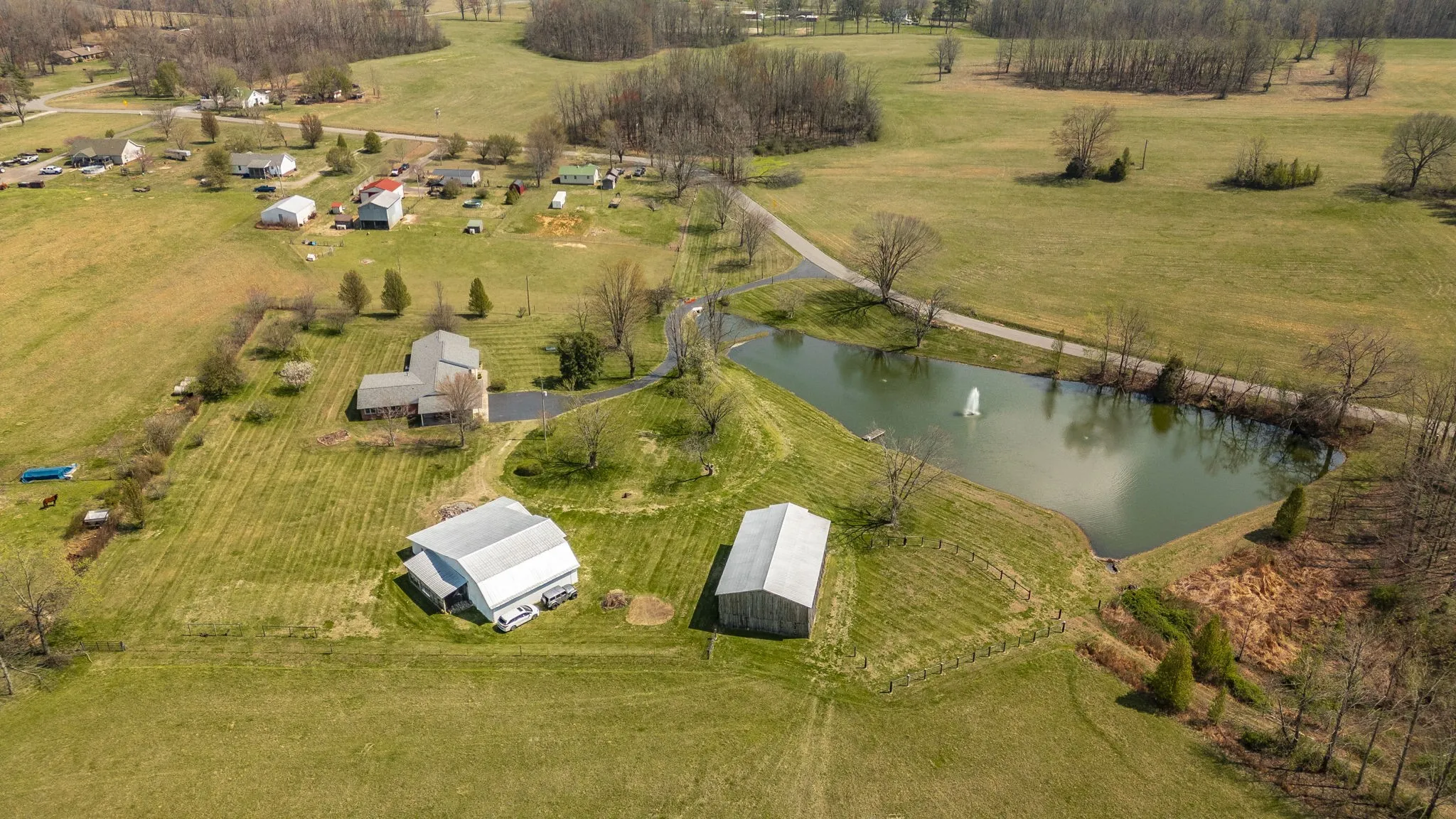 Welcome to your own private slice of Tennessee countryside—where space, functionality, and natural beauty come together on an incredible 43 fully fenced acre homestead.This stunning single-level home offers over 3,600 square feet of living space, thoughtfully designed with both comfort and versatility in mind. Inside, you’ll find 4 spacious bedrooms and 3 full baths, along with multiple hobby or home office rooms—perfect for remote work, creative pursuits, or accommodating a growing household. The massive kitchen and living area serve as the heart of the home, ideal for entertaining or simply enjoying everyday life, while the walk-in pantry and oversized storage closets provide exceptional practicality. For added peace of mind, a dedicated safe room is also included. Step outside and take in the beauty of this private, scenic setting. The property features a large, stocked pond complete with water features—creating a peaceful backdrop and a perfect spot to relax or unwind. For those seeking a functional farm or homestead, this property is fully equipped with a preserved, usable tobacco barn and an old milk barn that has been partially converted into a shop. Whether you’re looking to establish a working farm for livestock, hay, or crops—or simply enjoy wide-open spaces with unmatched privacy—this property offers endless opportunities. A rare combination of acreage, functionality, and a spacious home, all in a beautiful country setting.