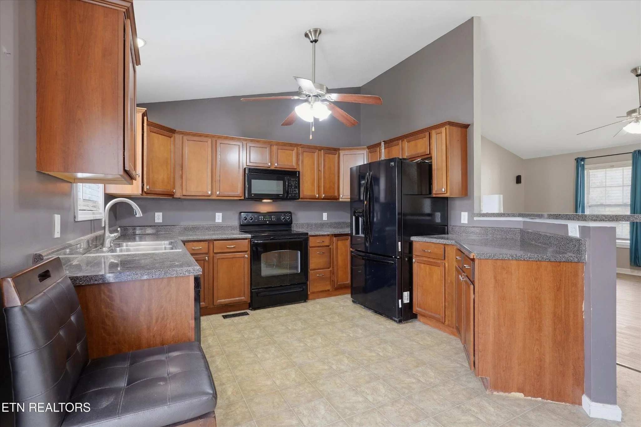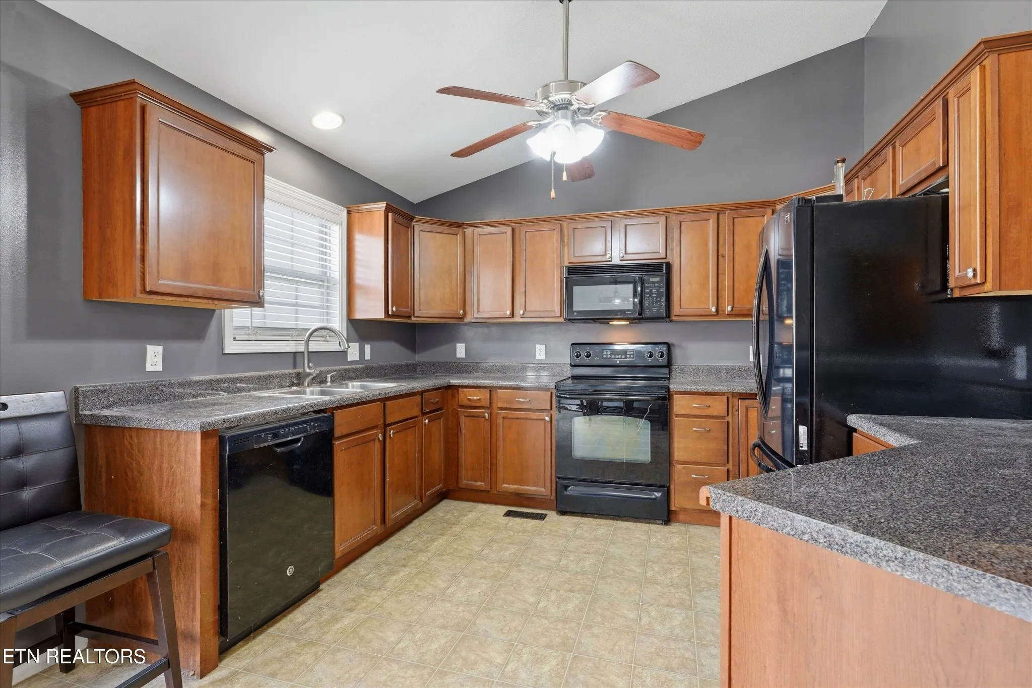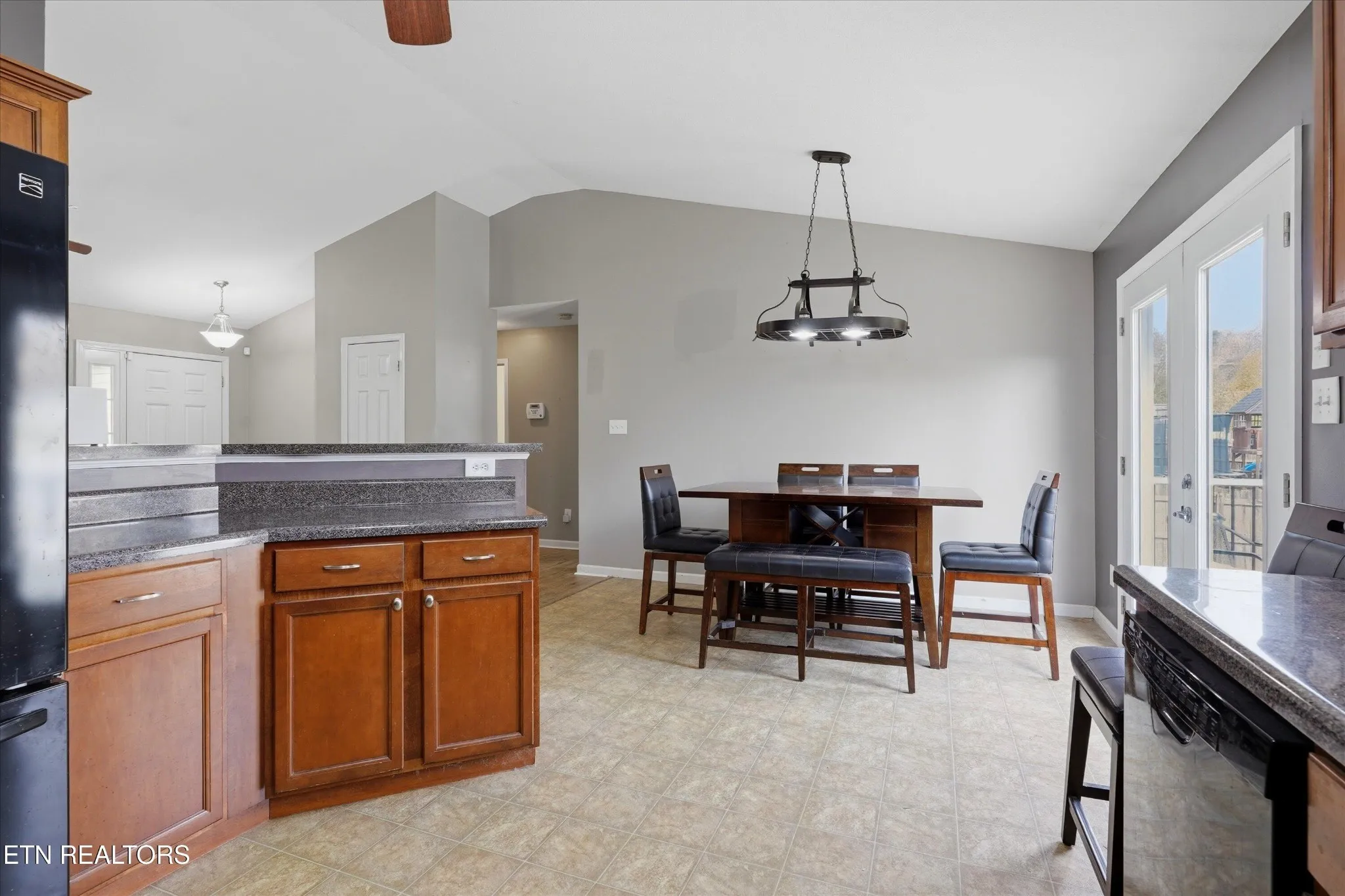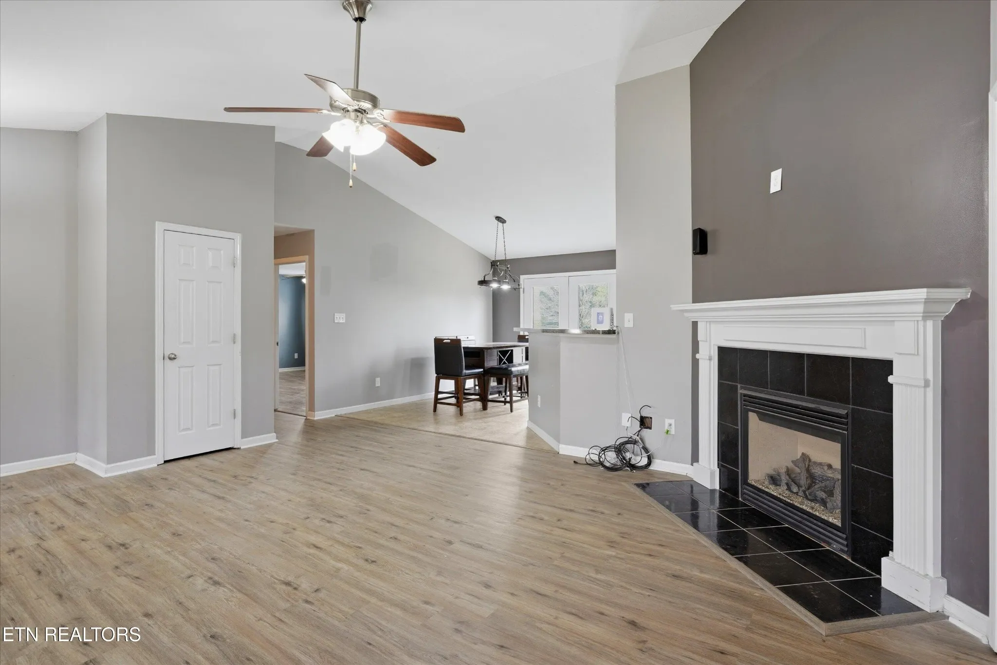 Welcome home to this stunning all-one-level ranch that perfectly balances open-concept living with cozy, defined spaces. As you approach, you’re greeted by a charming covered front porch, ideal for morning coffee. Inside, the spacious living room impresses with vaulted ceilings, a warm fireplace, and durable wood-look flooring that flows throughout the main living areas. The kitchen is thoughtfully designed to remain open to the action while offering enough division to keep the prep space tucked away; it features classic wooden cabinetry, sleek grey countertops, black appliances, and a functional island with seating space. An adjacent dining area makes hosting a breeze.