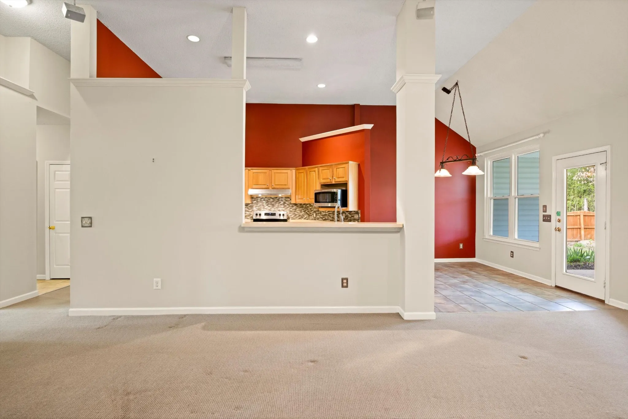 Step through the front door into a welcoming entry foyer that flows effortlessly into a spacious living room with soaring vaulted ceilings and a cozy fireplace, creating an open and airy atmosphere that is perfect for both everyday living and entertaining. Just off the living area, the kitchen offers a breakfast bar, abundant cabinet space, and a separate dining area, giving you the ideal layout for hosting gatherings or enjoying quiet meals at home.