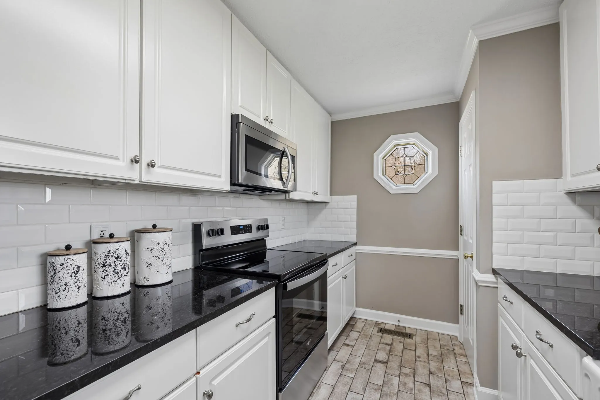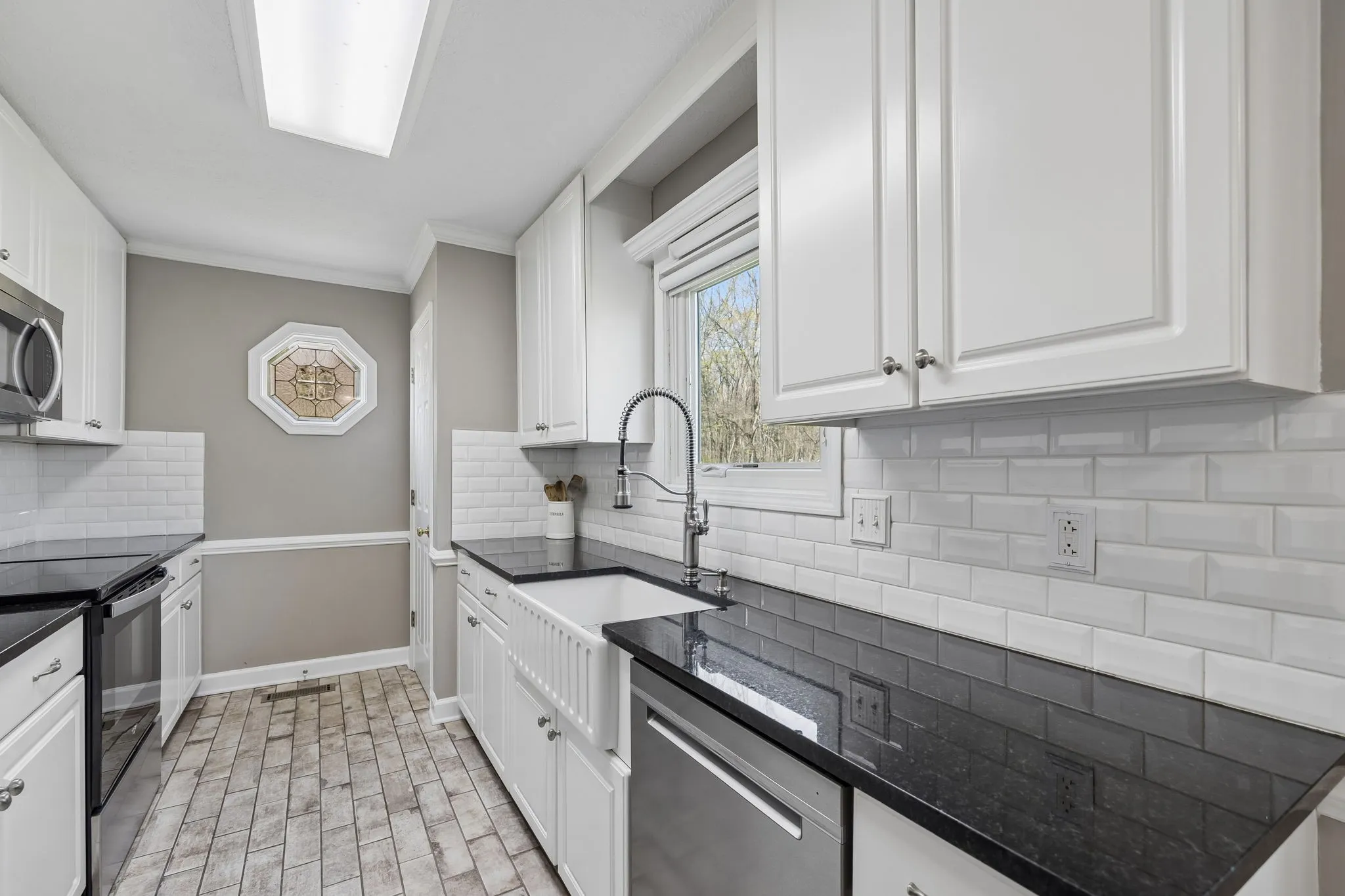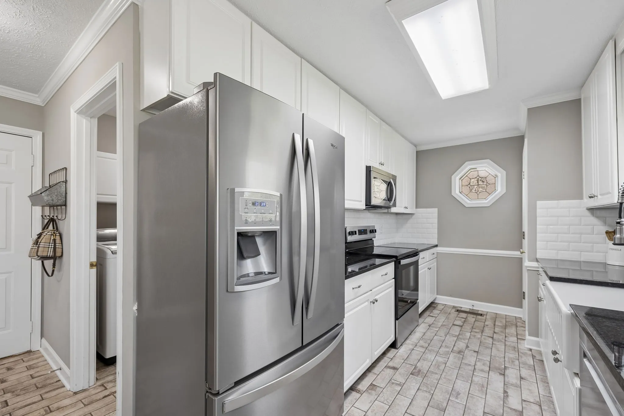 The kitchen includes granite countertops, a tile backsplash, and stainless steel appliances, and flows into both the main living space and a formal dining room. Additional interior features include a dedicated laundry room and linen closet.
