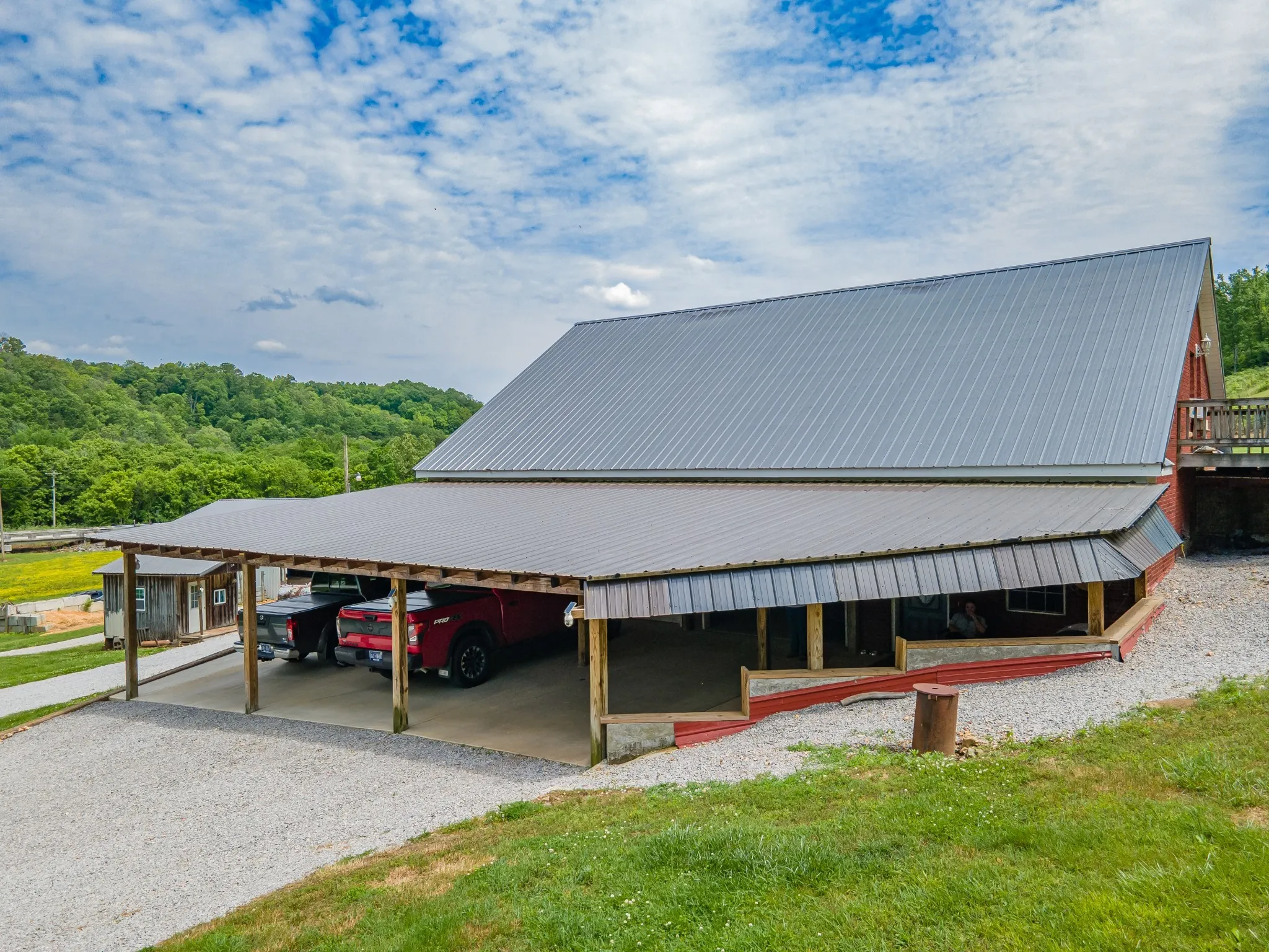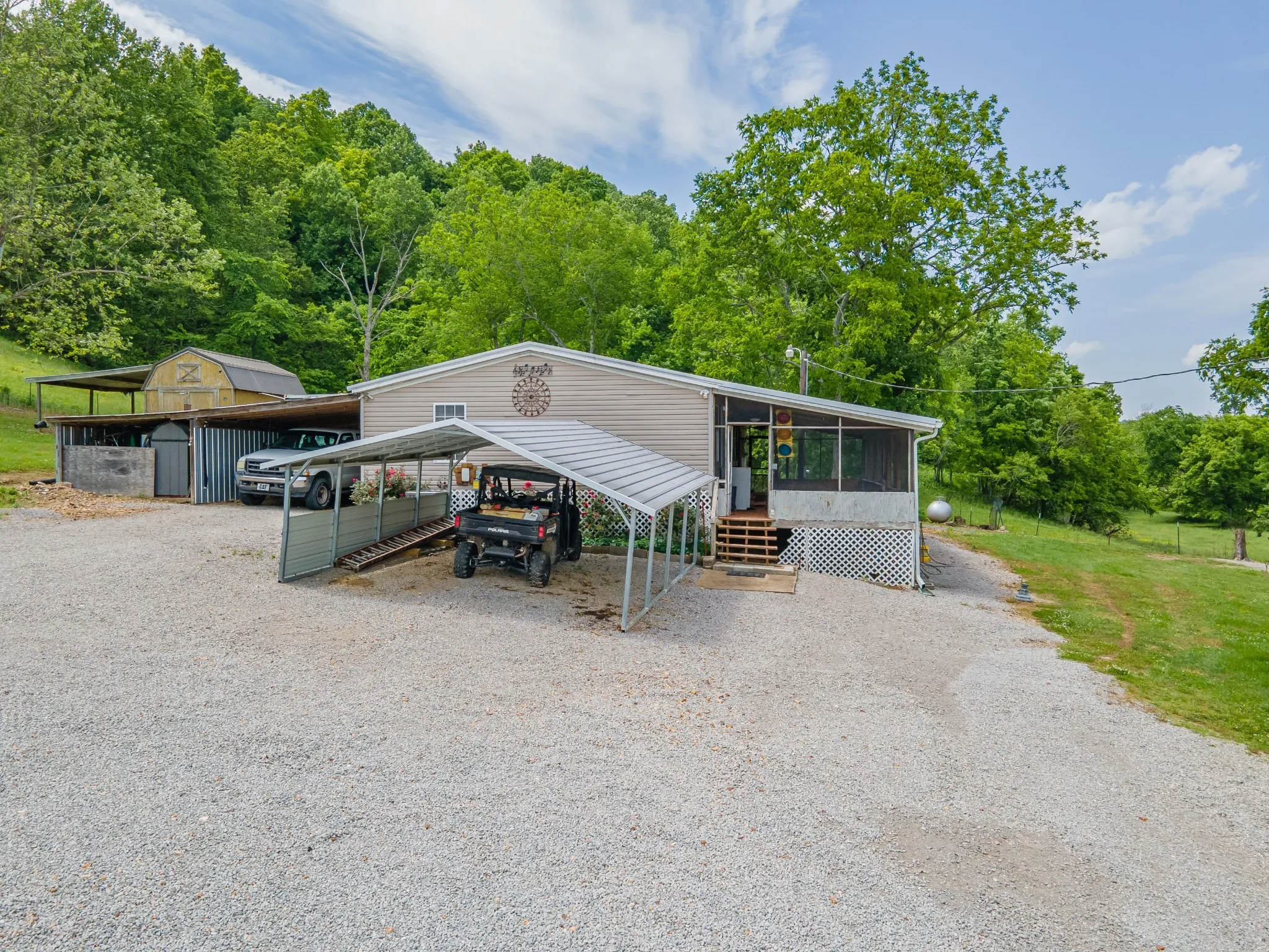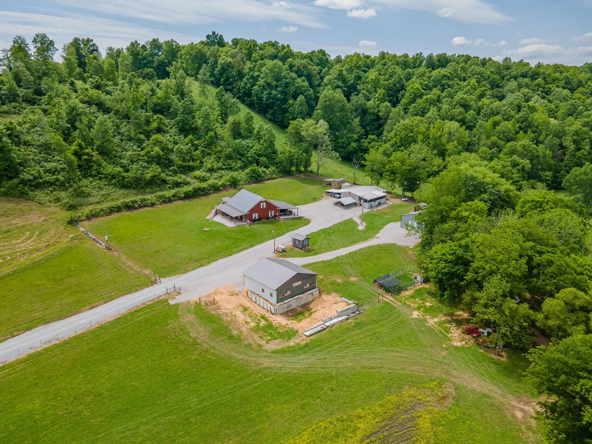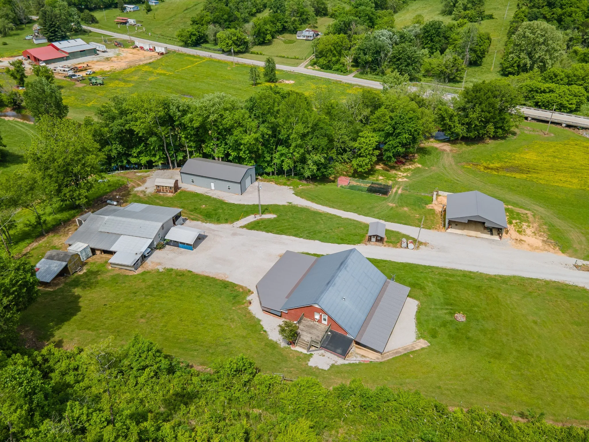 Situated on 9 beautiful acres, this unique offering includes two homes and multiple outbuildings. The main residence is a well-maintained 3-bedroom, 2-bath brick home with 2,145 sq. ft. and an attached 3-bay garage providing ample room for vehicles and storage. A second 3-bedroom, 2-bath home on a permanent foundation adds flexibility for guests, extended family, or income potential. The property also features a large pull-through shop, pole barn, and additional sheds, making it ideal for hobbies, equipment storage, or workspace needs. Property is fully fenced and a creek runs along one side of the property, offering a beautiful natural boundary.