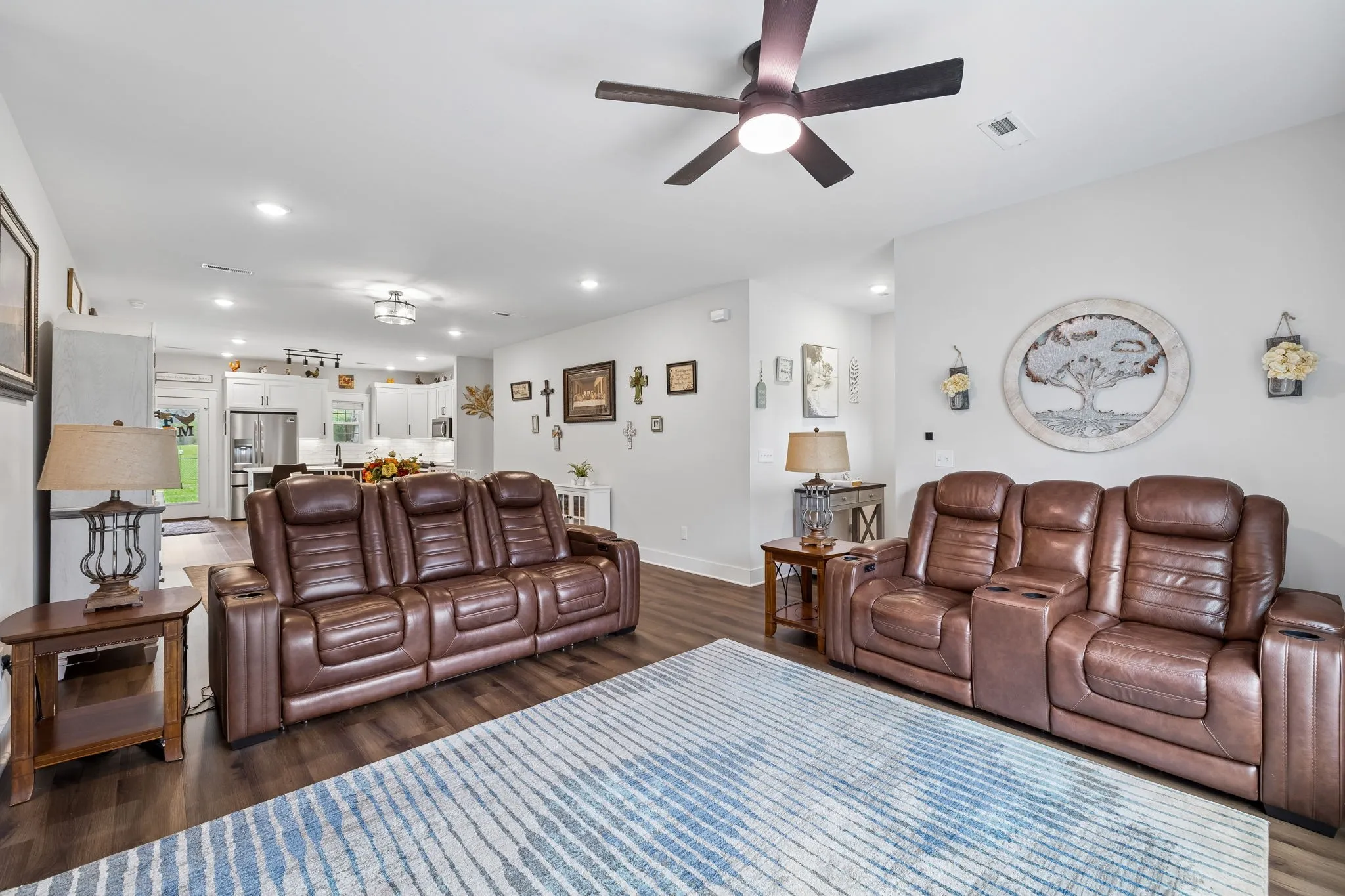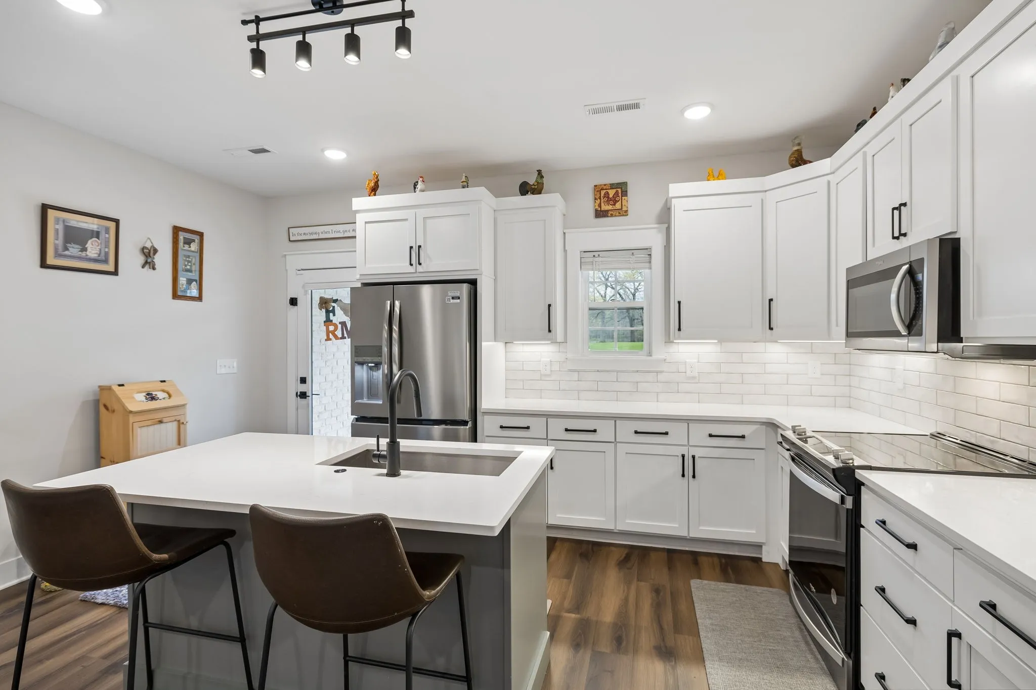 The kitchen is set up perfectly for both everyday living and entertaining, with a large island, quartz countertops throughout, custom cabinetry, tile backsplash, stainless steel appliances, and a spacious walk-in pantry.