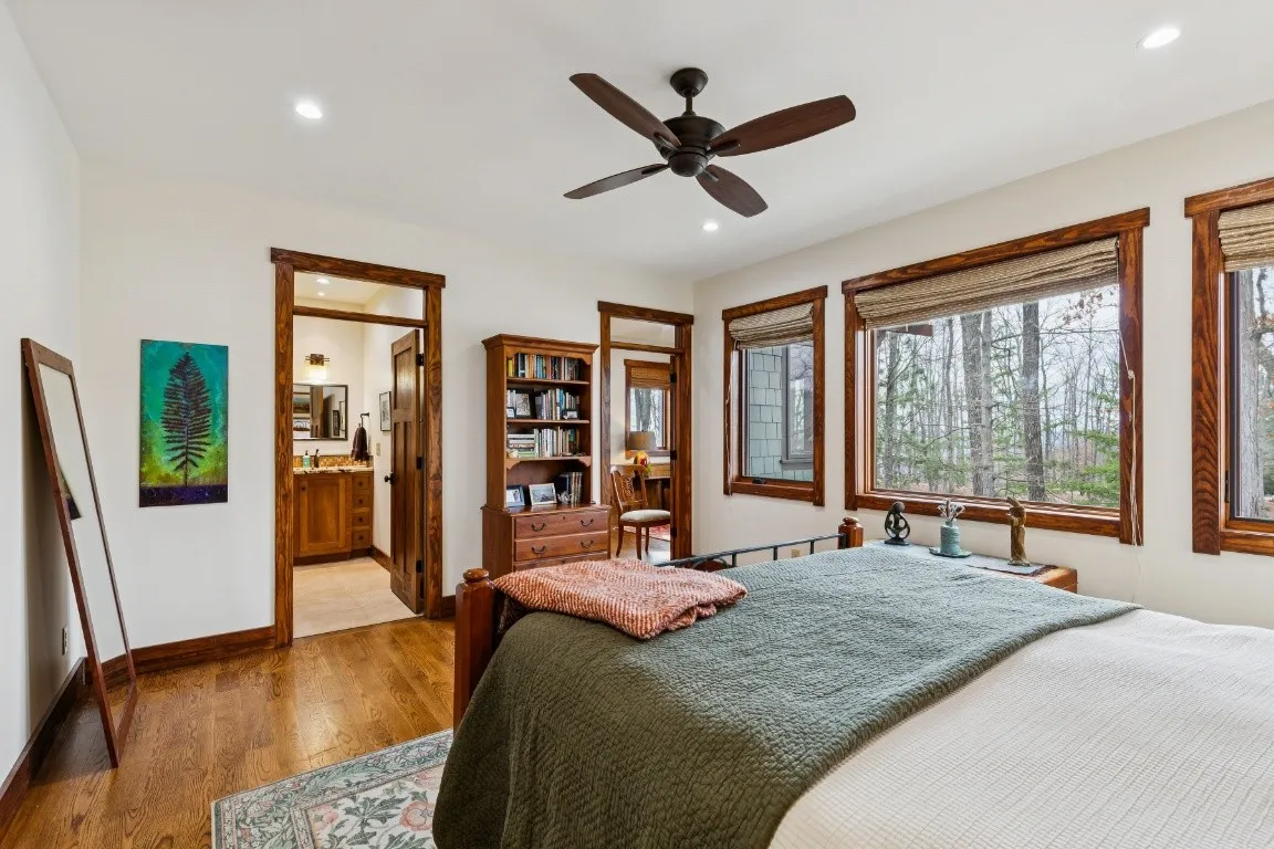Retreat to the luxurious primary bedroom which offers an attached home office overlooking both lake and bluff views, a spacious bathroom complete with a custom tile shower, double vanities, and built in linen closet. Two additional bedrooms offer generous space for family and guests.