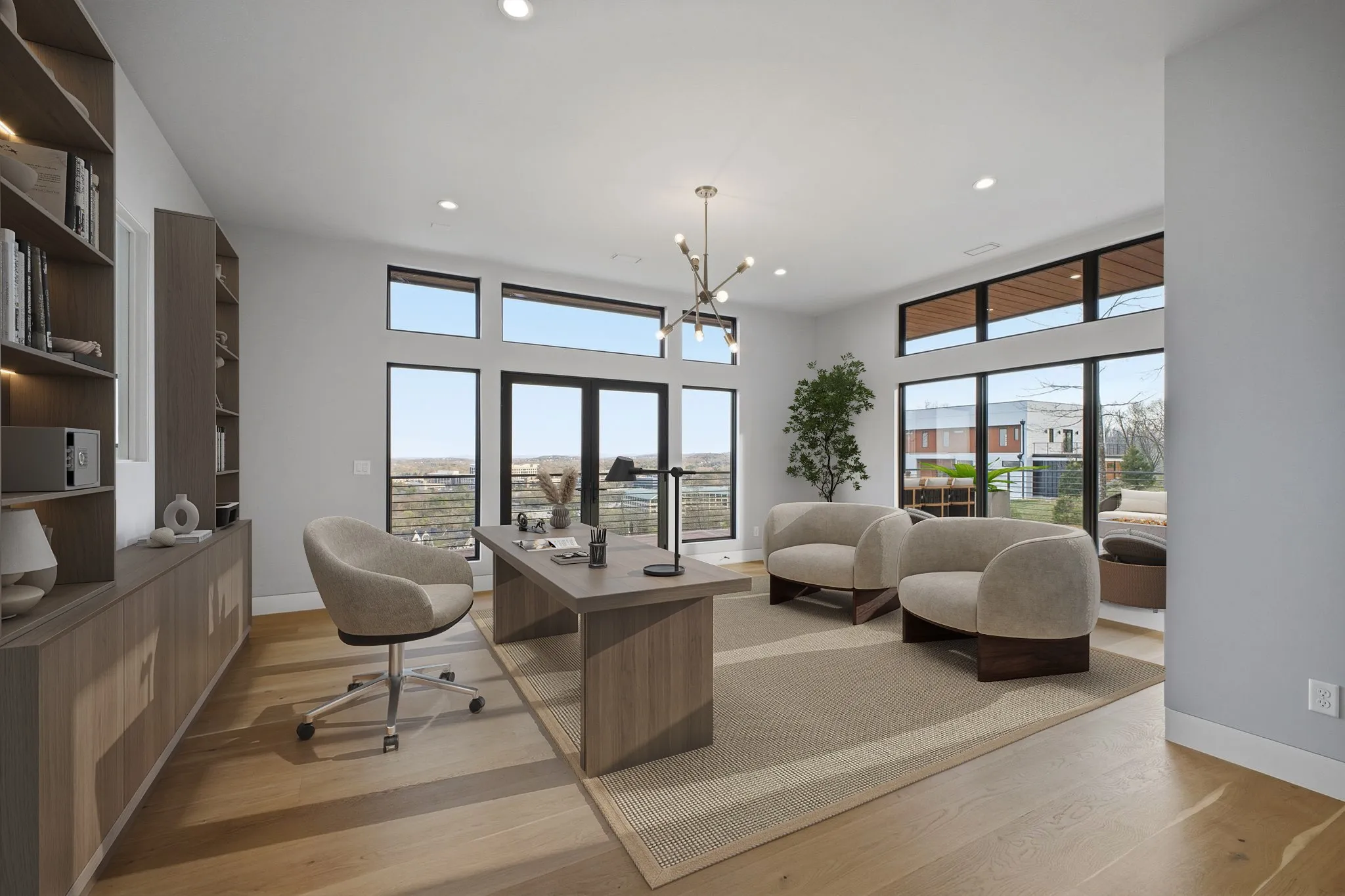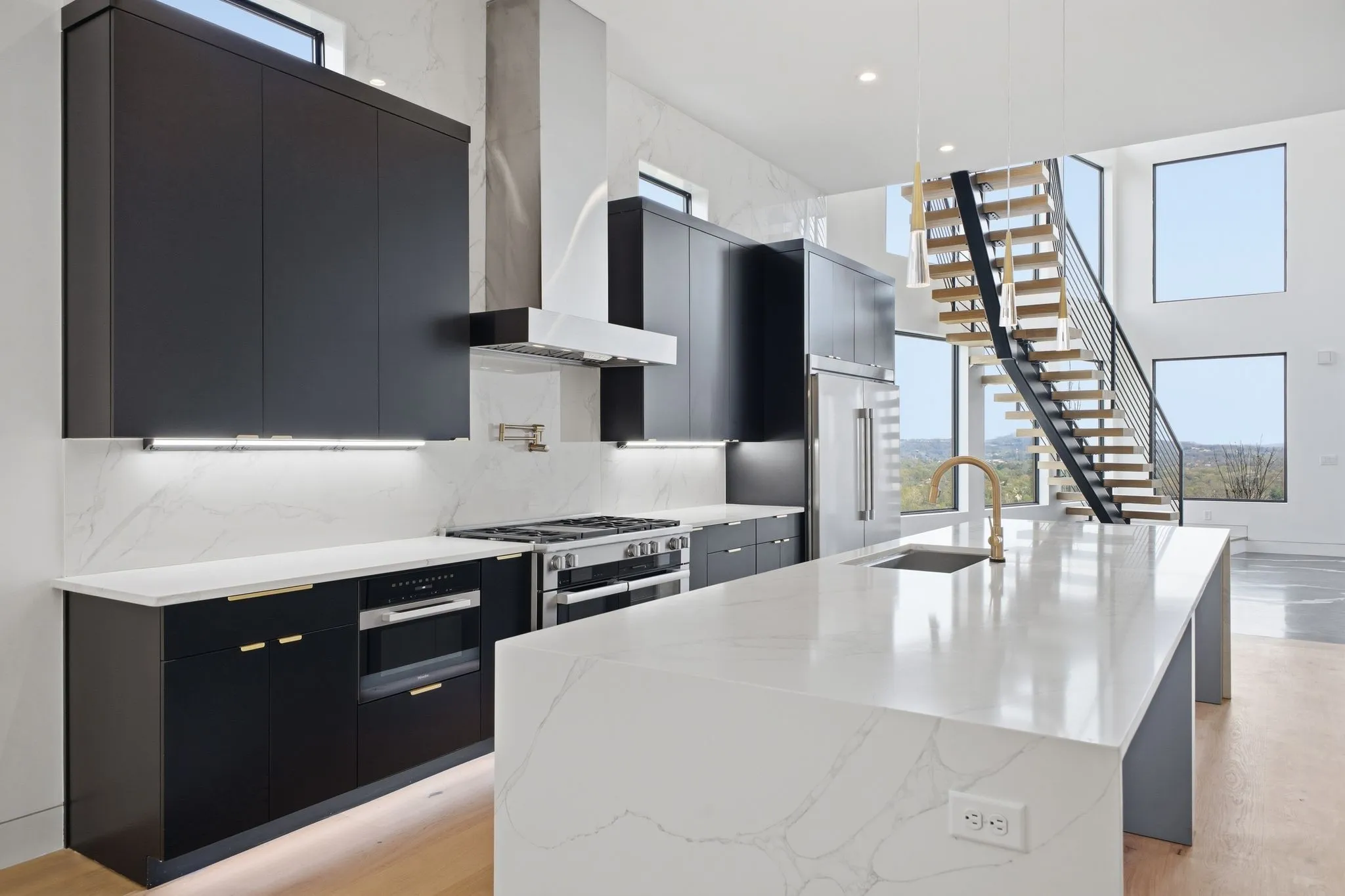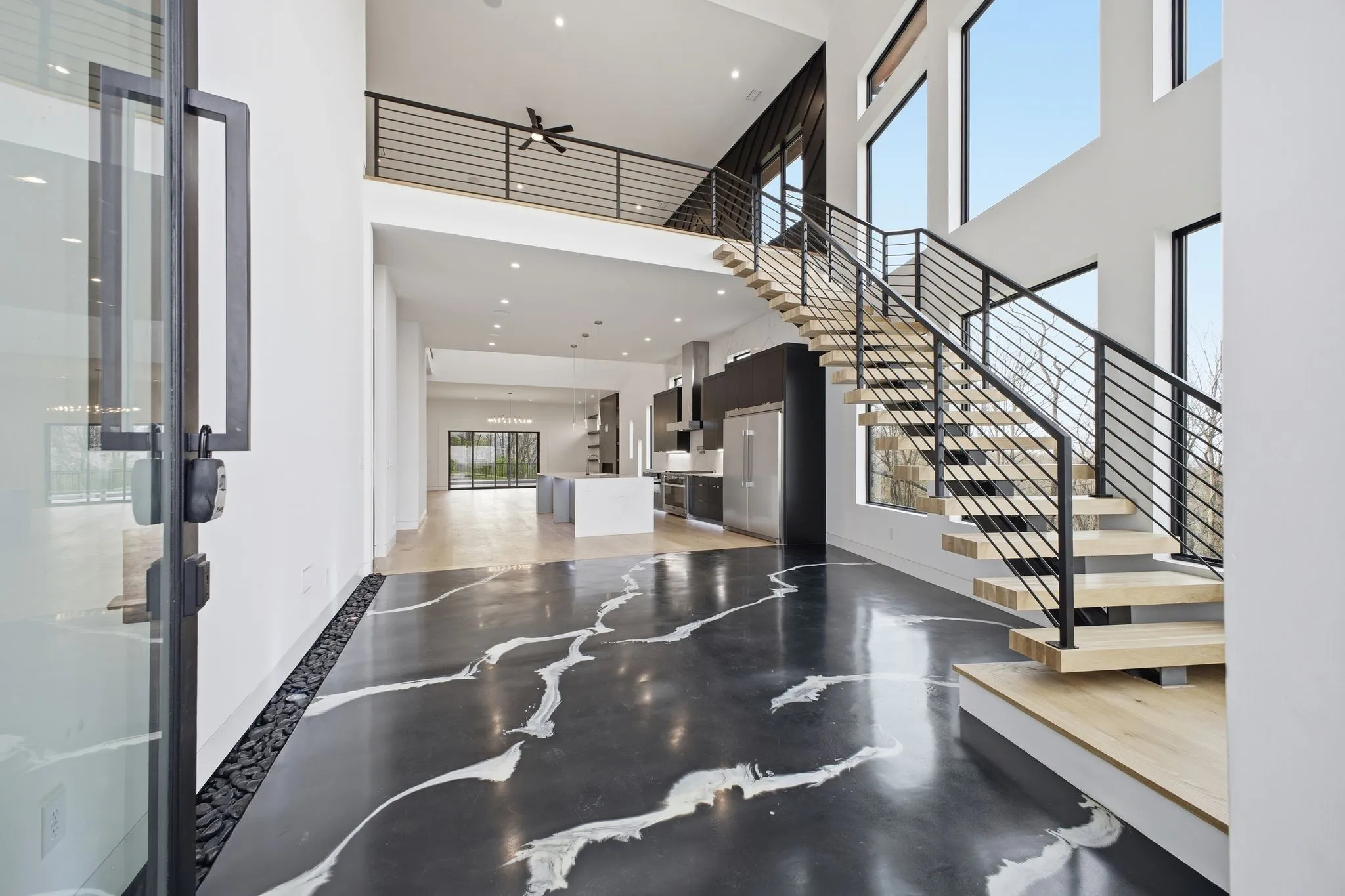 Wide plank white oak flooring runs throughout, complemented by integrated LED lighting, a floating staircase, and a custom epoxy foyer with gravel trench drain. Two gas fireplaces, a glass wall office, dual laundry rooms, and detailed millwork reinforce the home’s craftsmanship.
