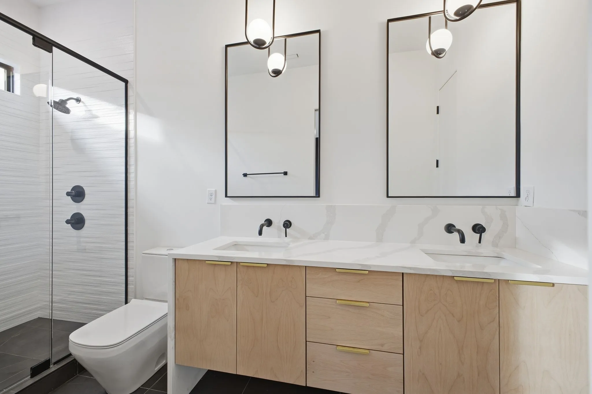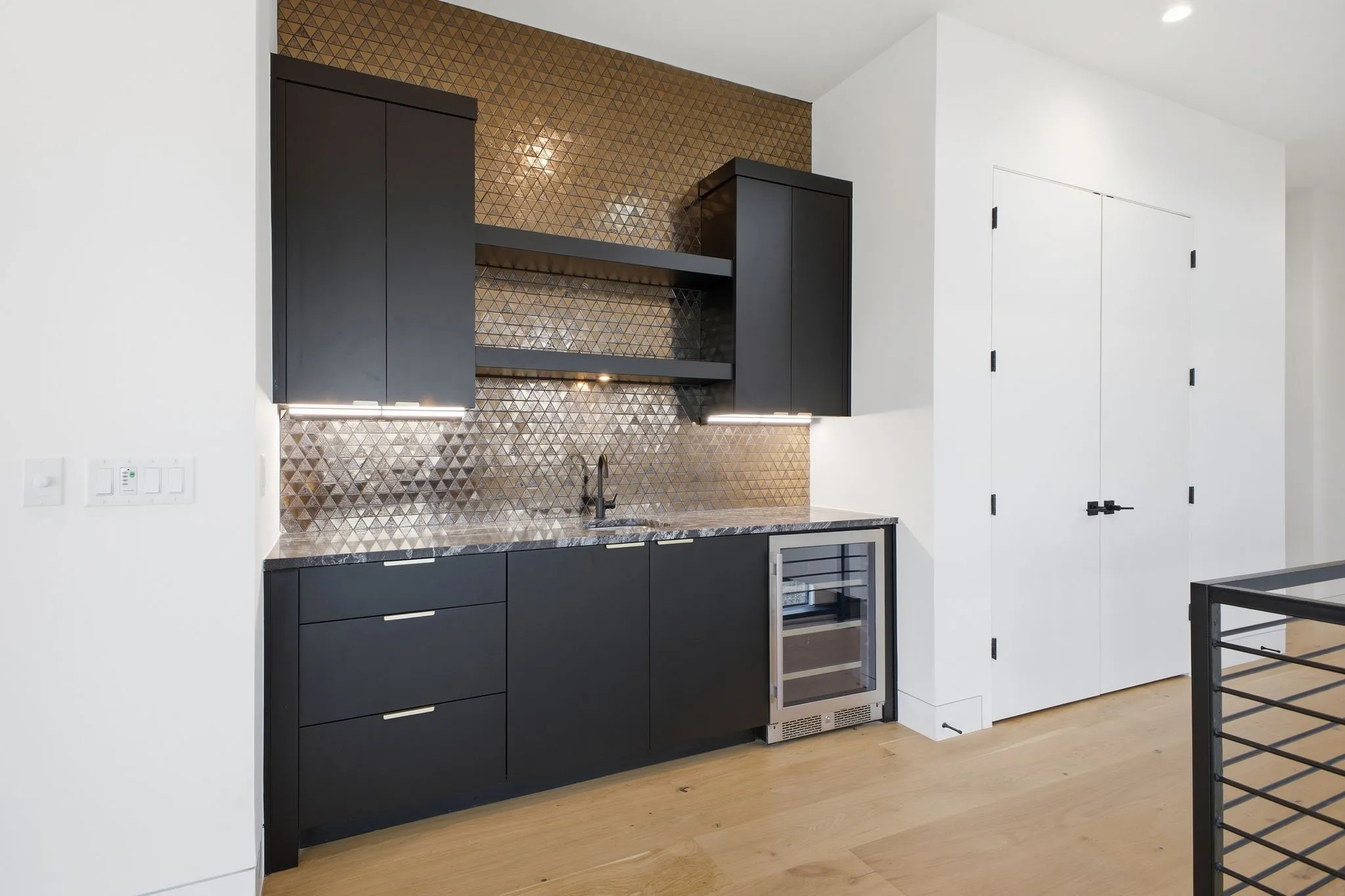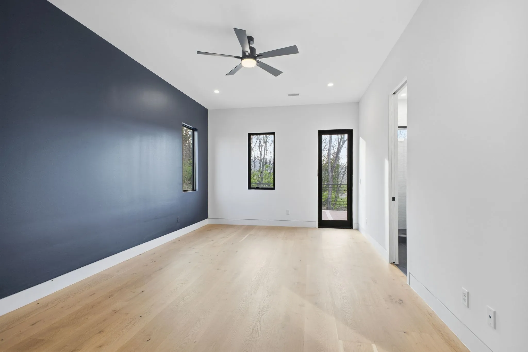 Wide plank white oak flooring runs throughout, complemented by integrated LED lighting, a floating staircase, and a custom epoxy foyer with gravel trench drain. Two gas fireplaces, a glass wall office, dual laundry rooms, and detailed millwork reinforce the home’s craftsmanship.