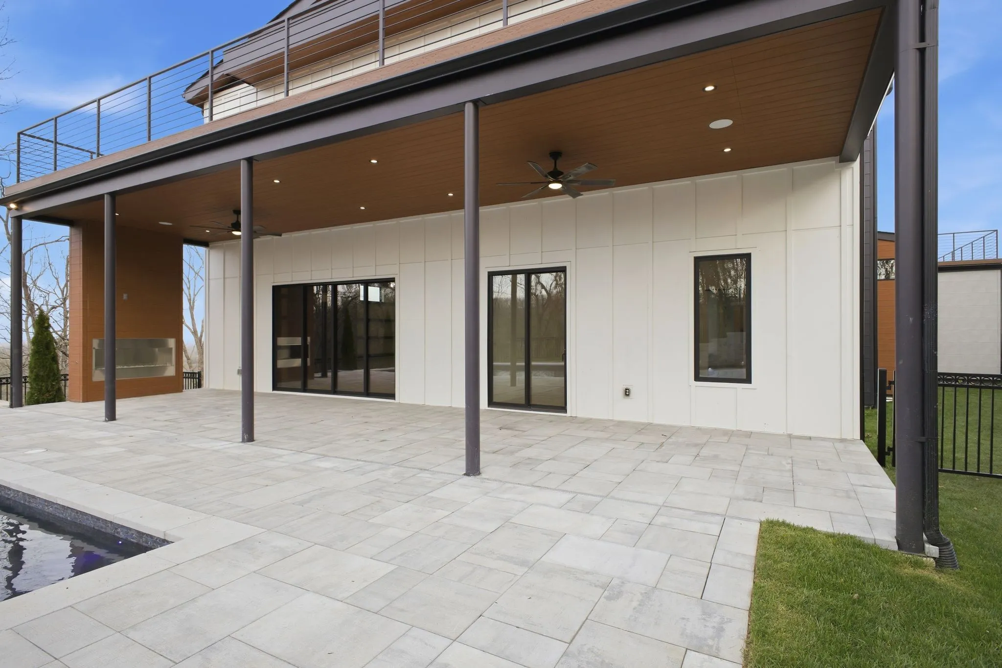 Outdoor living includes a fully automated pool with infinity edge spa, rooftop composite decking, expansive paver terraces, and a four bay garage. Smart features include central vacuum, tankless water heater with recirculation, whole home audio pre wiring, and full low voltage infrastructure.