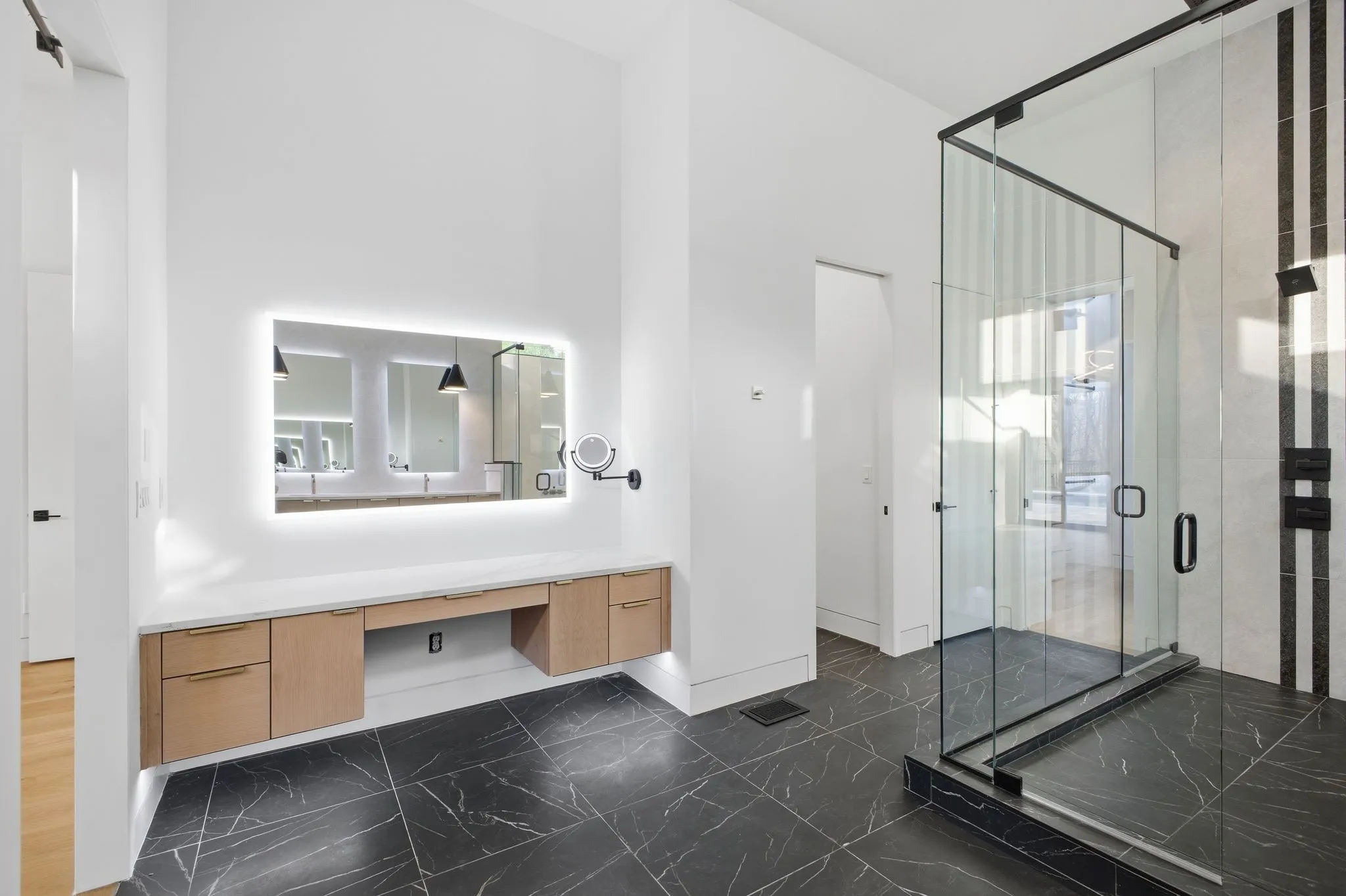 The primary suite is designed as a private retreat with a spa caliber bath featuring an oversized walk in shower with dual rain heads and handheld fixture, a freestanding soaking tub, backlit mirrors, and a dedicated makeup vanity. The LED lit custom closet provides exceptional scale and organization.