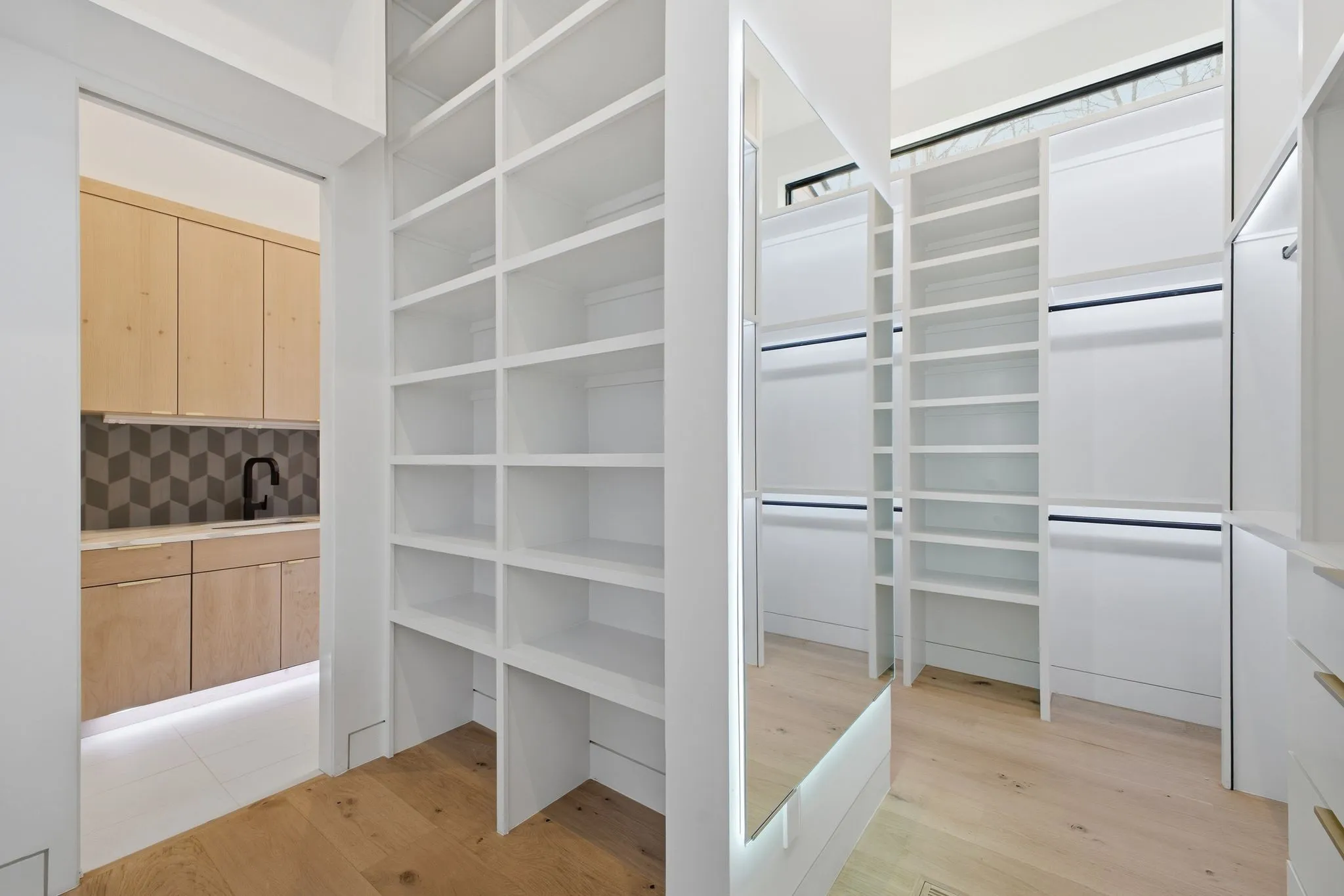 The kitchen anchors the home with custom cabinetry, a premium appliance suite, and a 48 inch professional range with warming drawer, double oven, and convection microwave. Dual dishwashers, a 64 inch commercial refrigerator and freezer, and expansive quartz surfaces elevate both daily living and entertaining. A walk in wine cellar, oversized pantry with floor to ceiling shelving, and a fully appointed butler’s pantry with icemaker and beverage refrigeration complete the space.